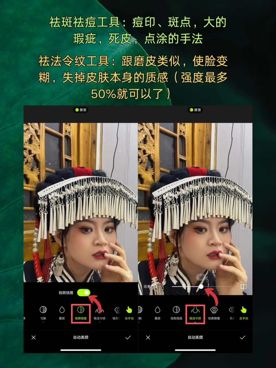 🌷祛法令纹工具:跟磨皮类似,使脸变糊,失掉皮肤本身的质感(强度最多50%就可以了)