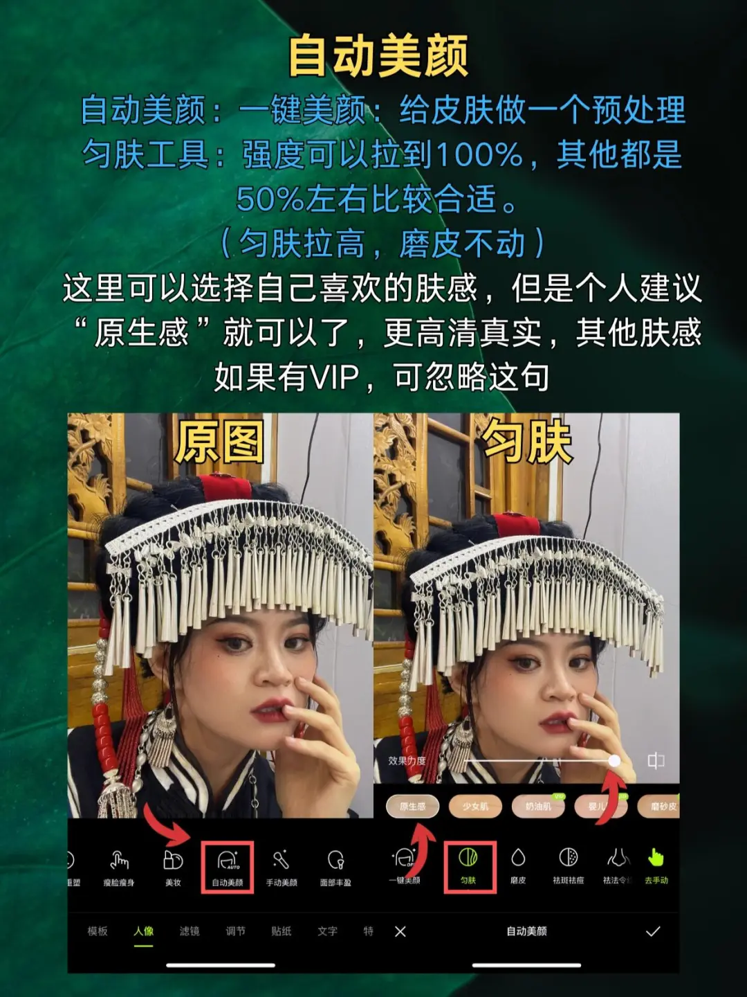🌼匀肤工具:强度可以拉到100%,其他都是50%左右比较合适。(匀肤拉高,磨皮不动)这里可以选择自己喜欢的肤感,但是个人建议“原生感”就可以了,更高清真实,其他肤感如果有VIP,可忽略这句