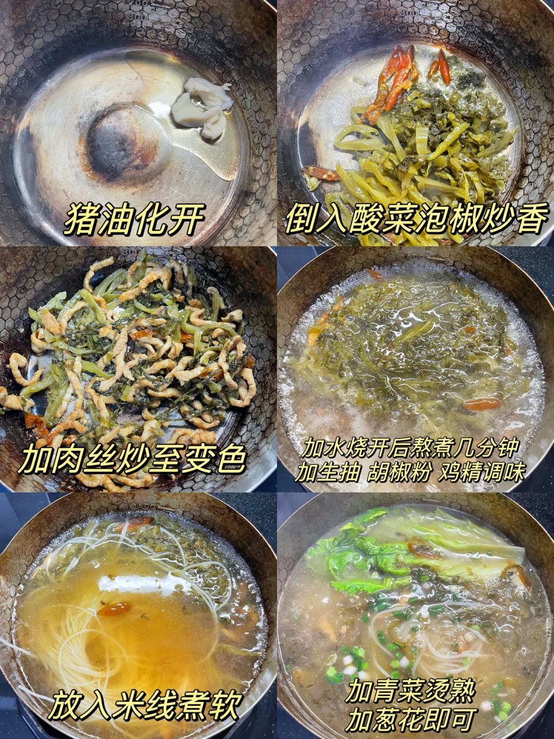 酸菜也是万能搭配了,只要有酸菜就能刺激到味蕾,米线润滑可口,汤底酸爽浓厚,太绝了👌 食材:米线 瘦肉 酸菜 猪油 泡椒 葱花 1⃣️:肉丝加入生抽 少许盐 淀粉 清水抓匀 2⃣️:猪油化开放入酸菜和泡椒炒香,放肉丝炒至变色,加水烧开,熬煮几分钟,加生抽胡椒粉和鸡精调味,放入米线煮软后加青菜烫熟,撒葱花即可