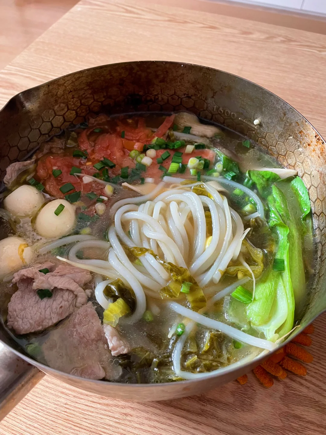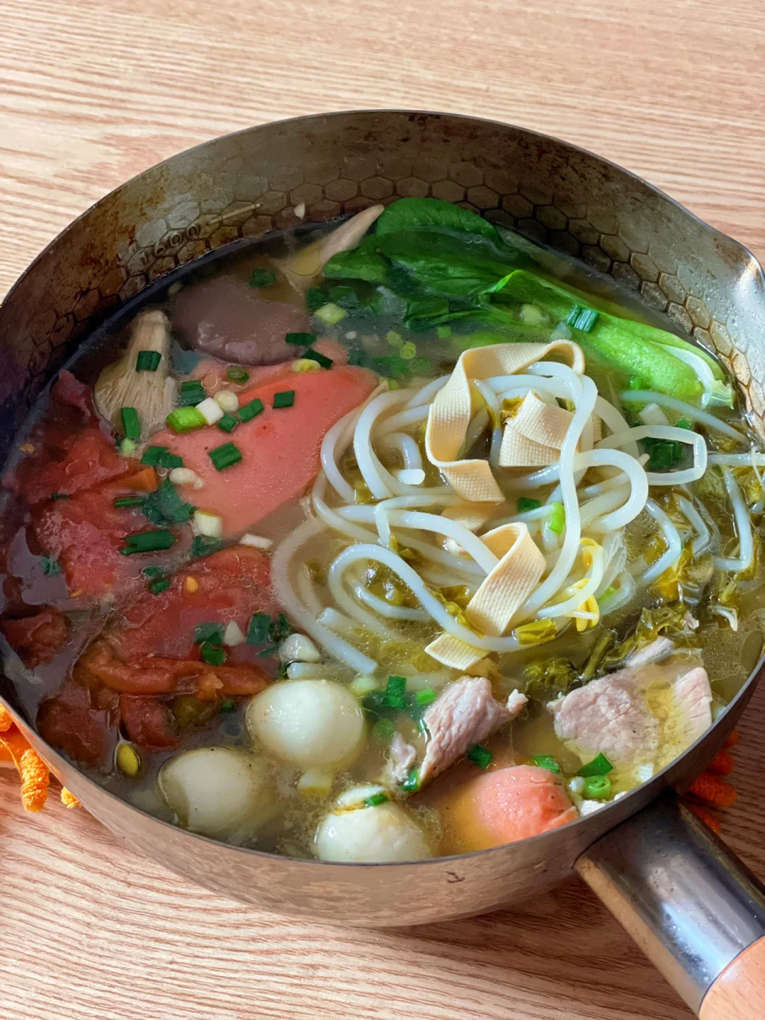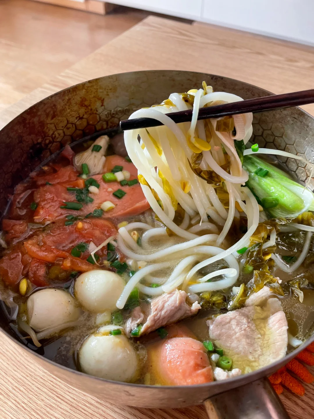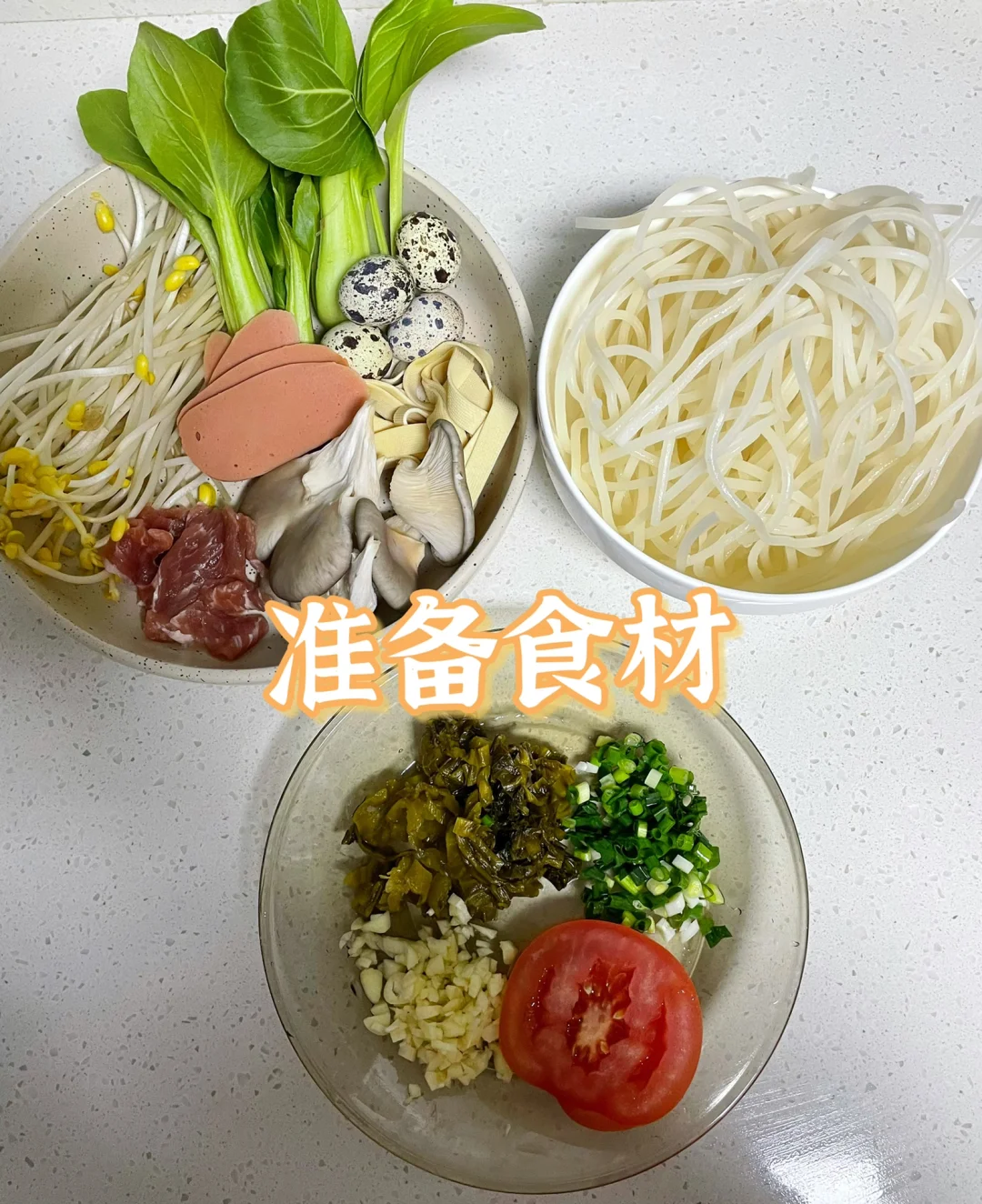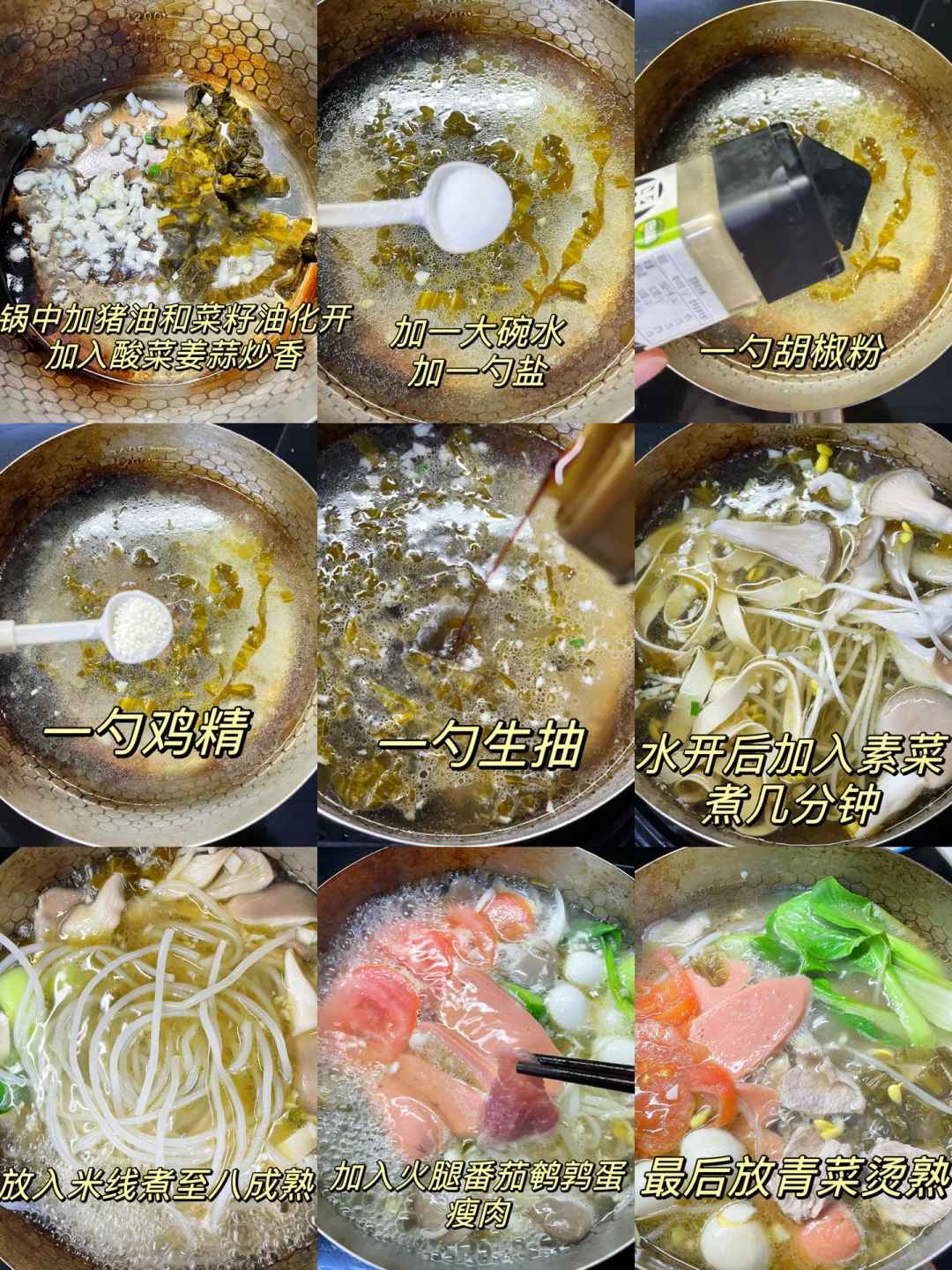 天气冷的时候来上一碗这样的米线,一锅汤下肚,全身都跟着暖和起来了[偷笑R][偷笑R] 🍀🍀🍀食材:米线150克,豆芽,青菜,千张,鹌鹑蛋,瘦肉,火腿肠,番茄,酸菜,葱,蒜 1⃣️:配菜洗干净备用,锅中加入猪油和菜油,倒入姜蒜和酸菜炒香,加入一碗水,加入一勺盐,一勺胡椒粉,一勺鸡精,一勺生抽煮开 2⃣️:水开加入素菜烫2分钟,再放入米线煮三分钟,煮至八成熟,放入火腿肠,鹌鹑蛋,番茄,再放入肉片烫熟,最后加入葱花即可 喜欢吃辣的可以打个红油调料蘸米线吃