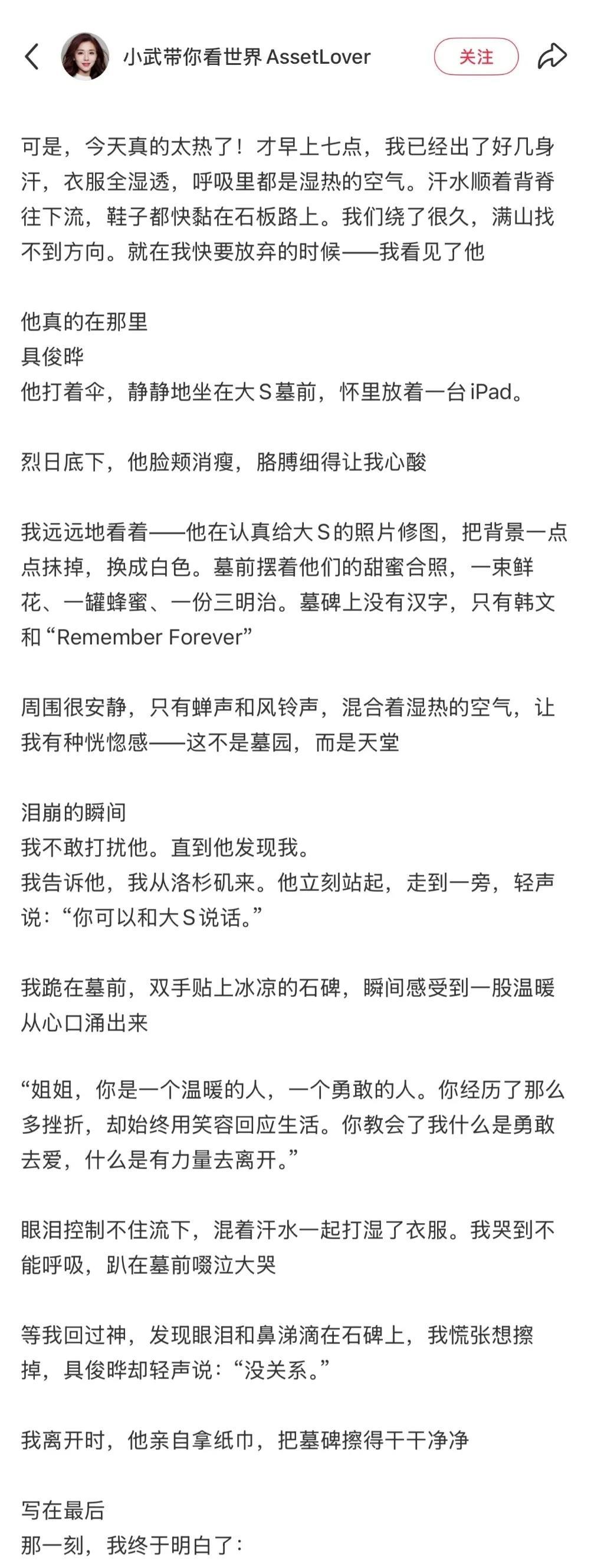 具俊晔在大S墓前修照片。 网友专程去看大S,早上七点抵达墓地的时候就发现具俊晔已经坐在墓前了,他在静静地修大S的照片。墓前摆着他俩的合照,还有一束鲜花、一罐蜂蜜和一份三明治,墓碑上没有汉字,只有韩文和“Remember Forever”。 网友在哭的时候不小心把眼泪鼻涕蹭到碑上,具俊晔对她说 “没关系”,随后又拿着纸巾,把墓碑擦得干干净净。 大S去世半年,他好像天天都在那。既然能做到这样,就说明他们俩是真的有感情,是真心的。能感觉到具俊晔是真的很想念大S。