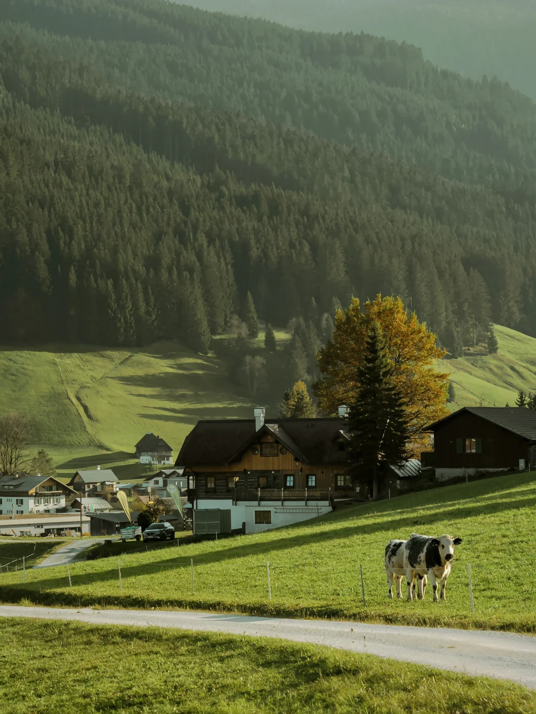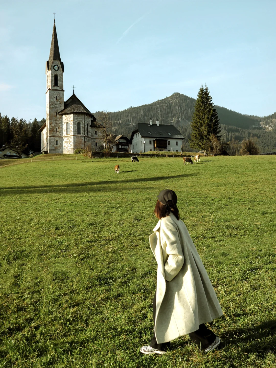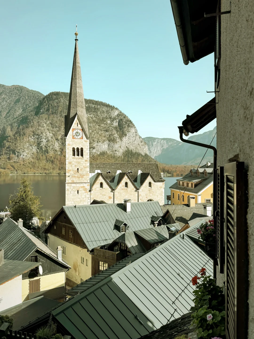 没想到10月底的Gosau还如此之绿 远眺就是一幅幅油画 建议留一晚在镇上住 早上晨雾笼罩着的戈绍小镇美飞!盲去的Cooee alpin Hotel Dachstein喝东西 室外公区view很棒