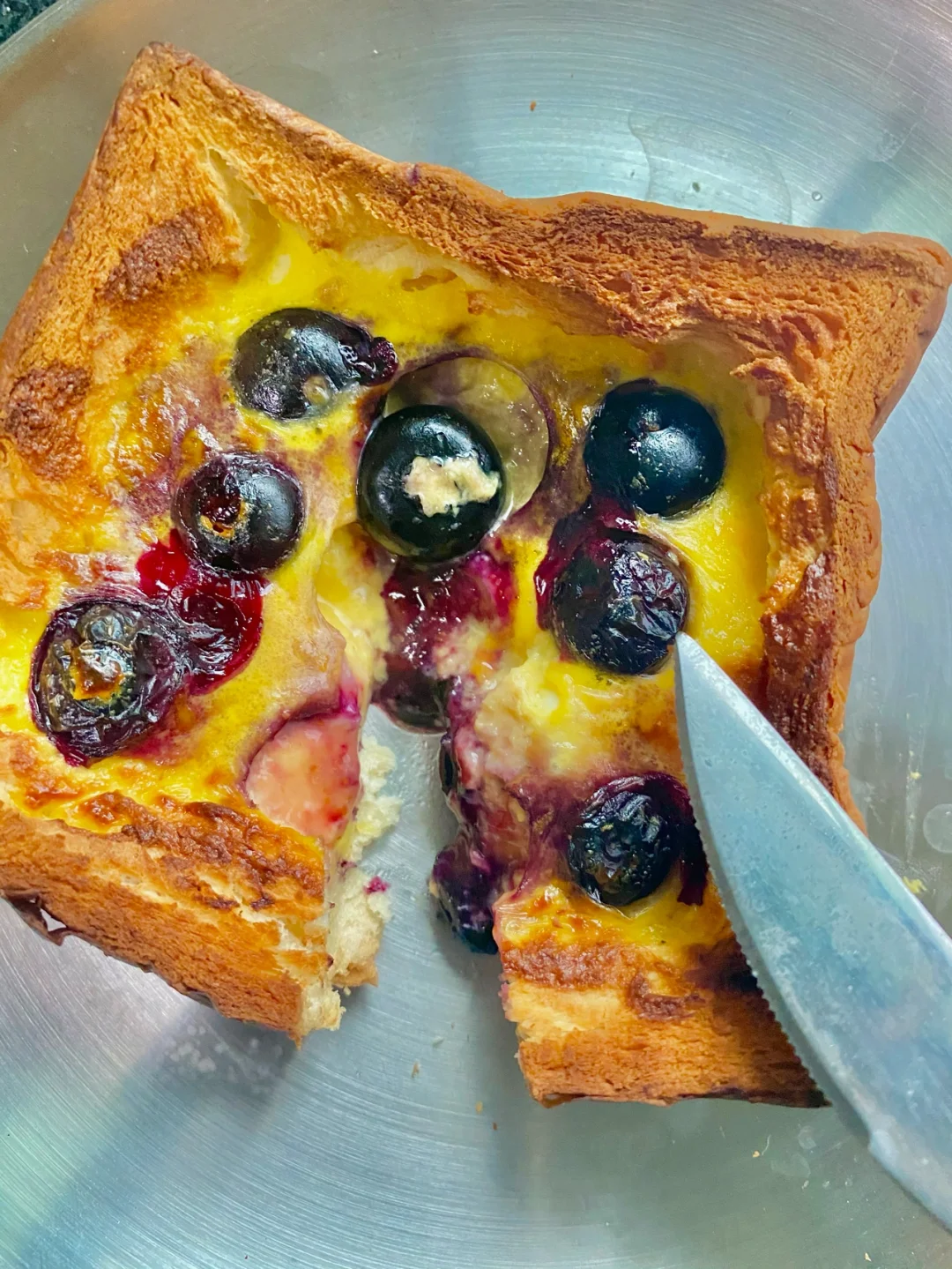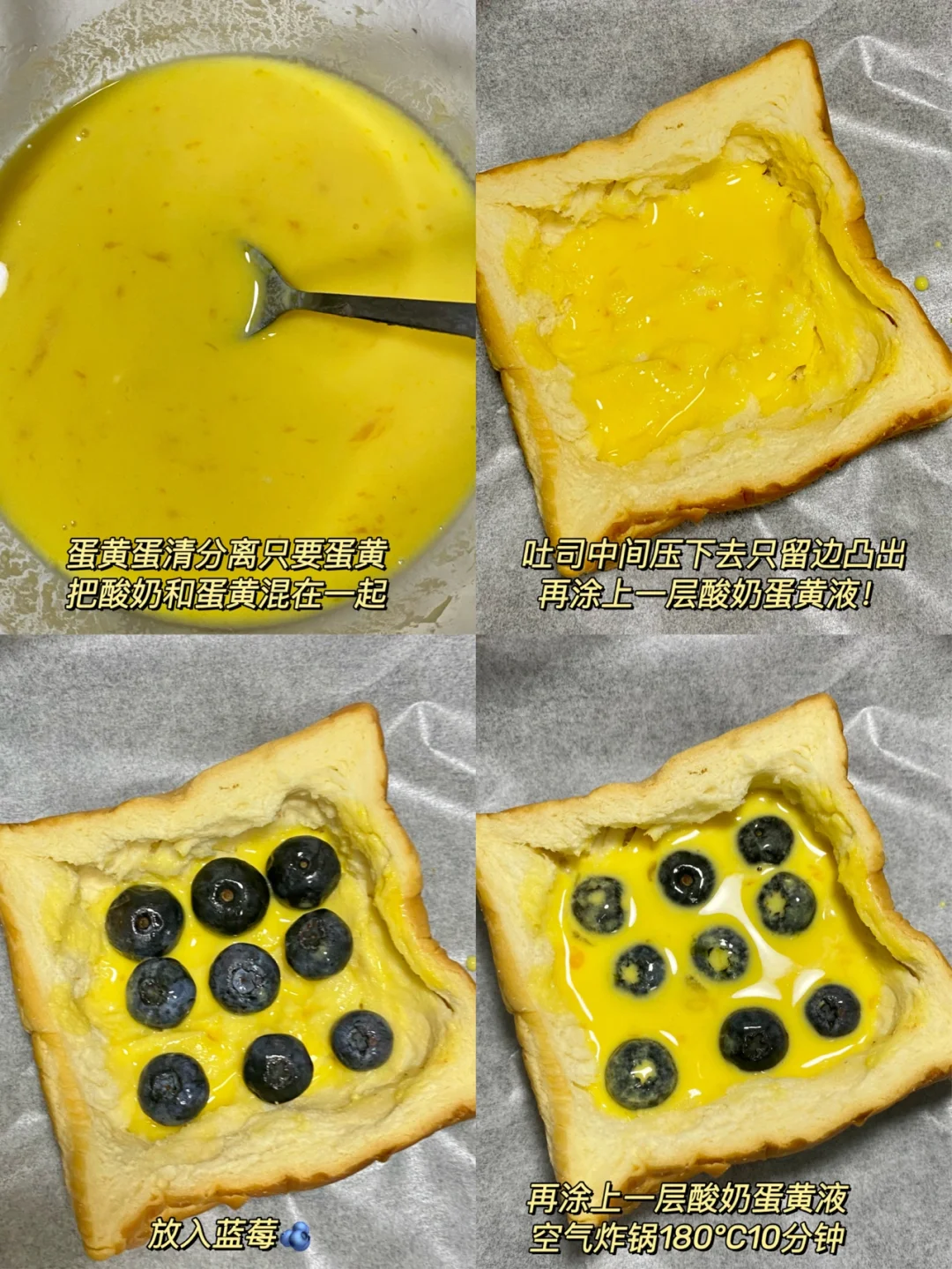 使用空气炸锅的第二天我感觉我快成为大厨了! 学到的方法!有手就能做的蓝莓岩烧乳酪! 🥬食材:蓝莓🫐、酸奶🥛、吐司🍞、鸡蛋🥚 📝步骤: 第一步:把蛋黄和蛋液分离取蛋黄和酸奶搅拌均匀 第二步:把吐司中间软的部分压下去 只让吐司边凸出 第三步:刷一层酸奶蛋黄液 第四步:把蓝莓铺上去然后再刷一层蛋黄液 最好没过蓝莓 第五步:空气炸锅180°C10分钟 真的很不戳!比高中小卖部买的还要好恰!吐司边脆脆的按照我的温度来!我是按照蛋挞的方法做的!外脆里嫩敲级棒!铁汁们一定要试一试!