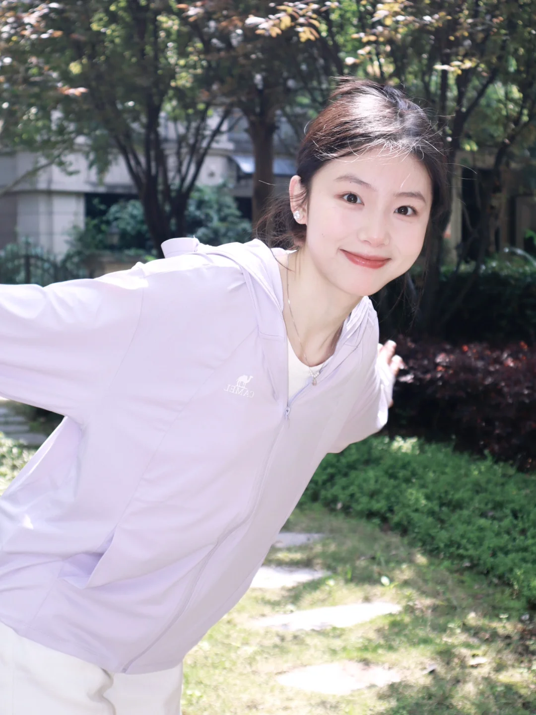 粉衫映夏草木香粉色T恤如撷取的夏花般明媚,白裤衬着茵茵草坪,静坐于绿意间的