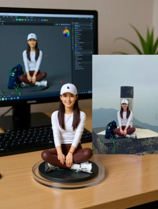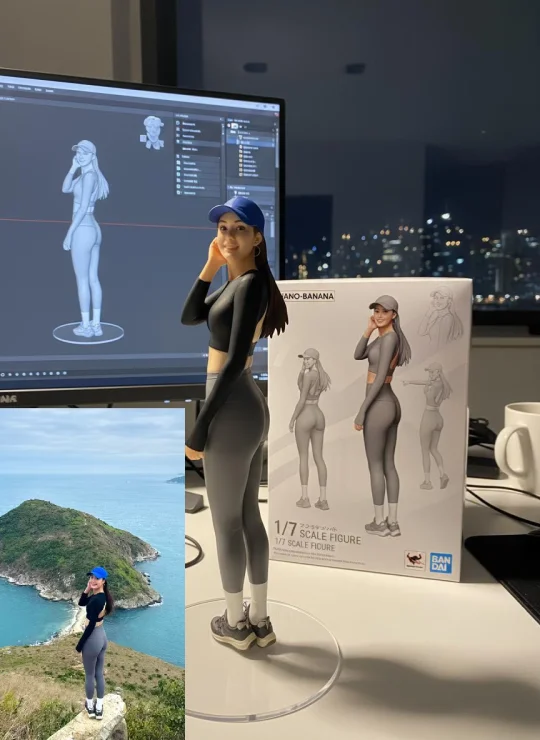 Use the nano-banana model to create a 1/7 scale model, in a realistic styie and environment. Place the figure on a computer desk, using a circular transparent acrylic base