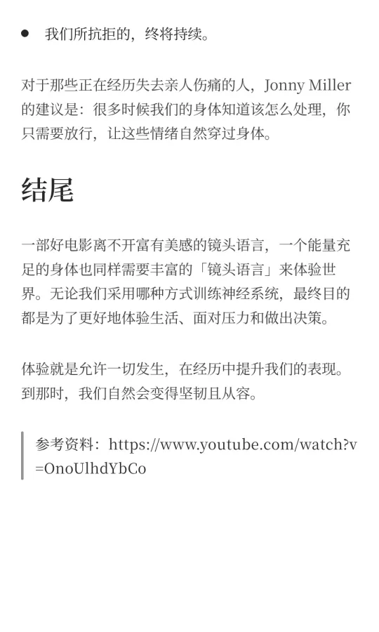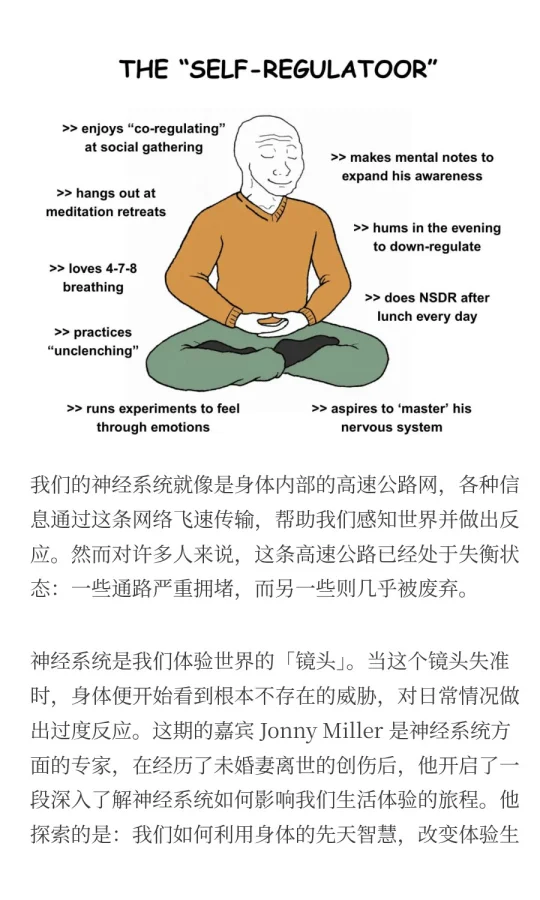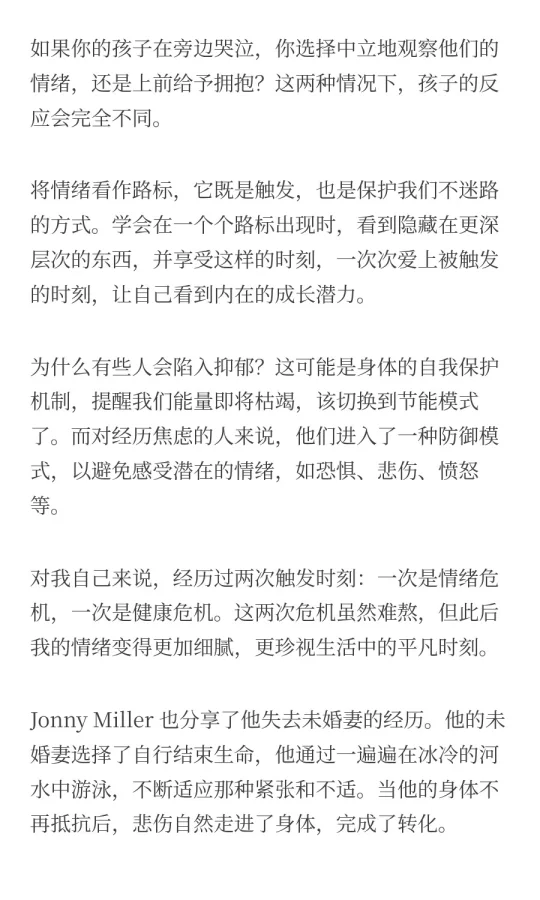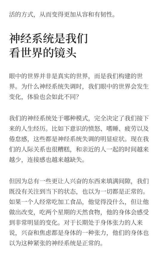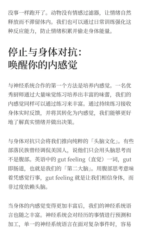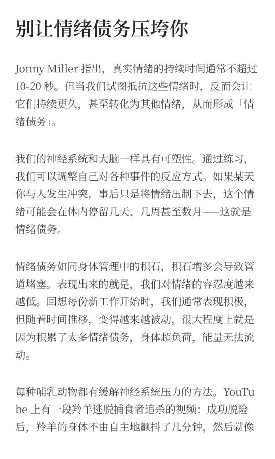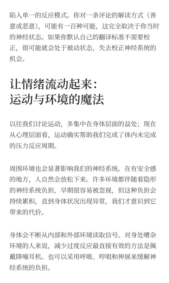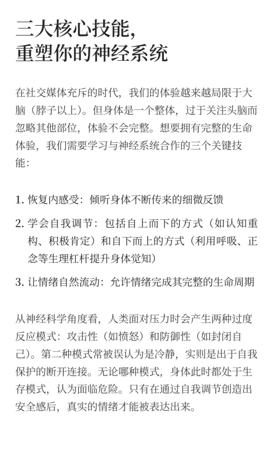 我们的神经系统才是情绪的「总开关」!它就像身体的高速公路,一旦堵车或失衡,我们就容易莫名焦虑、易怒和疲惫。 — 💡 神经系统的3个求救信号: ❶ 易怒攻击:一点就着,习惯性怼人 ❷ 冷漠逃避:对什么都提不起兴趣,只想躺平 ❸ 持续疲惫:睡再多还是累,能量被“偷走” 这些都是身体在生存模式下的过度反应,它在对你发出求救信号! — 🌟 3个方法,帮你重置神经系统: 1️⃣ 练习「内感觉」 像品鉴美食一样感受身体!每天花3分钟,闭上眼睛扫描身体:哪里紧绷?哪里放松? 👉 这能帮你读懂身体的真实情绪,不再被大脑的胡思乱想带偏。 2️⃣ 允许情绪流动 情绪本来只会停留90秒,是我们压抑它才变成“情绪债务”! ▫️试试像小动物一样:情绪来时,深呼吸+轻微抖动身体,让能量自然释放。 3️⃣ 改变环境信号 嘈杂环境会持续刺激神经!推荐「降噪耳机+白噪音」组合,快速打造安全感空间。 ✨ 小秘诀:每天做几次腹式呼吸,放松一直紧绷的腹部,能释放骨盆储存的压力。 — ⚠️ 注意这些隐形消耗: ❌ 长期收腹(腹部紧张影响呼吸) ❌ 靠咖啡“续命”(咖啡因麻痹真实感受) ❌ 追求情绪“中立”(其实是在压抑情绪) — 💬 真实故事: 专家 Jonny Miller 在未婚妻离世后,通过冰冷河水游泳释放悲伤。他说:“身体知道如何疗愈,你只需允许情绪穿过身体。” — 📌 总结: ▫️累和焦虑不是你的错,是神经系统发出的提醒。 ▫️不要对抗身体,学会与它合作。 ▫️真正的强大不是情绪稳定,而是让情绪自然流动。 — ✨ 愿我们都能听懂身体的低语,活得轻盈而从容[派对R]~