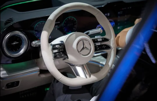 前面的大灯也是新的设计,虽然之前谍照看到了不少,但是看实物还是觉得蛮震撼,采用了星型 LED 日行灯,这一设计元素将成为奔驰全系车型的标志性特征。车子后部也有配备类似的星型 LED 灯和双片式车顶扰流板。