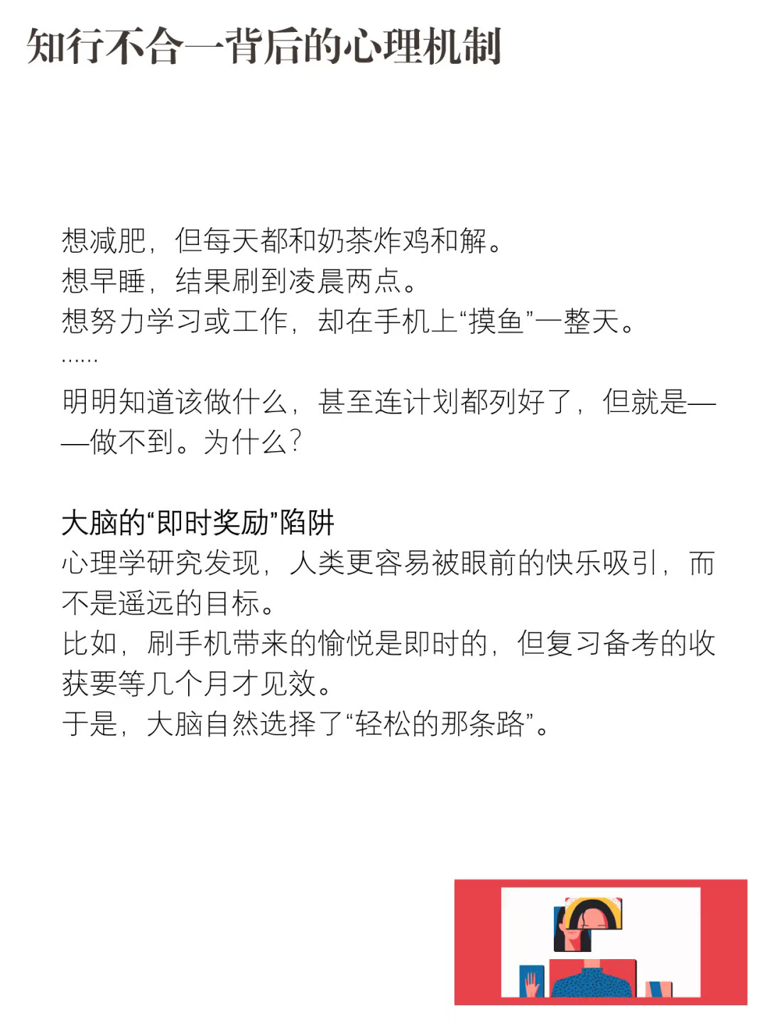 焦虑、无聊、压力过大,都会让大脑抗拒执行。换句话说,你不是不知道,而是做的那一刻太痛苦。
