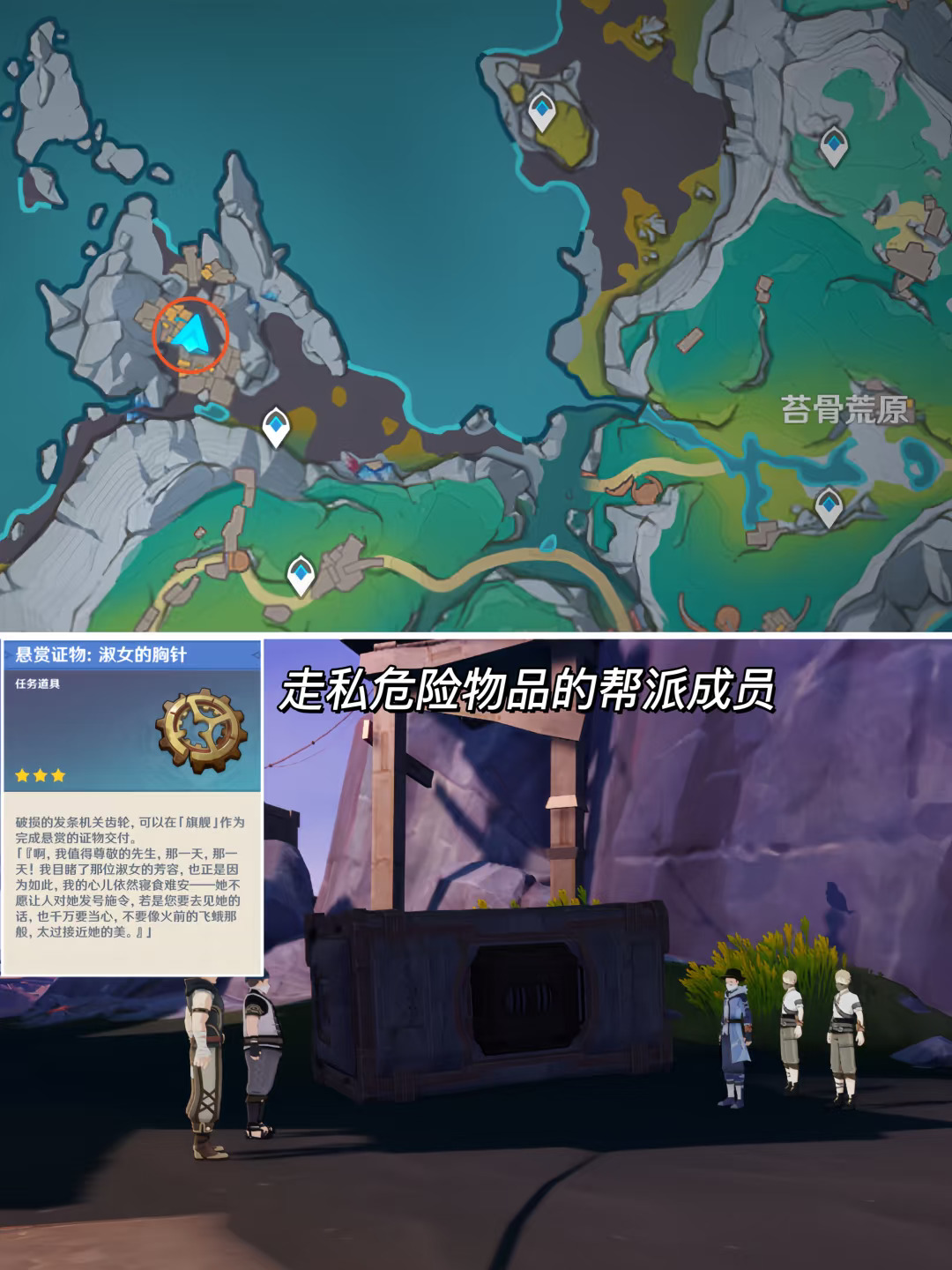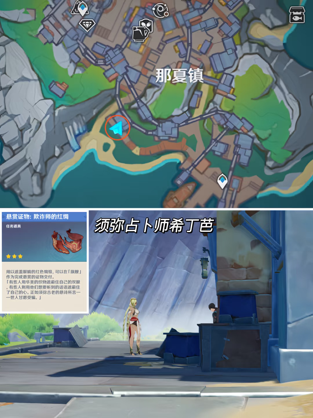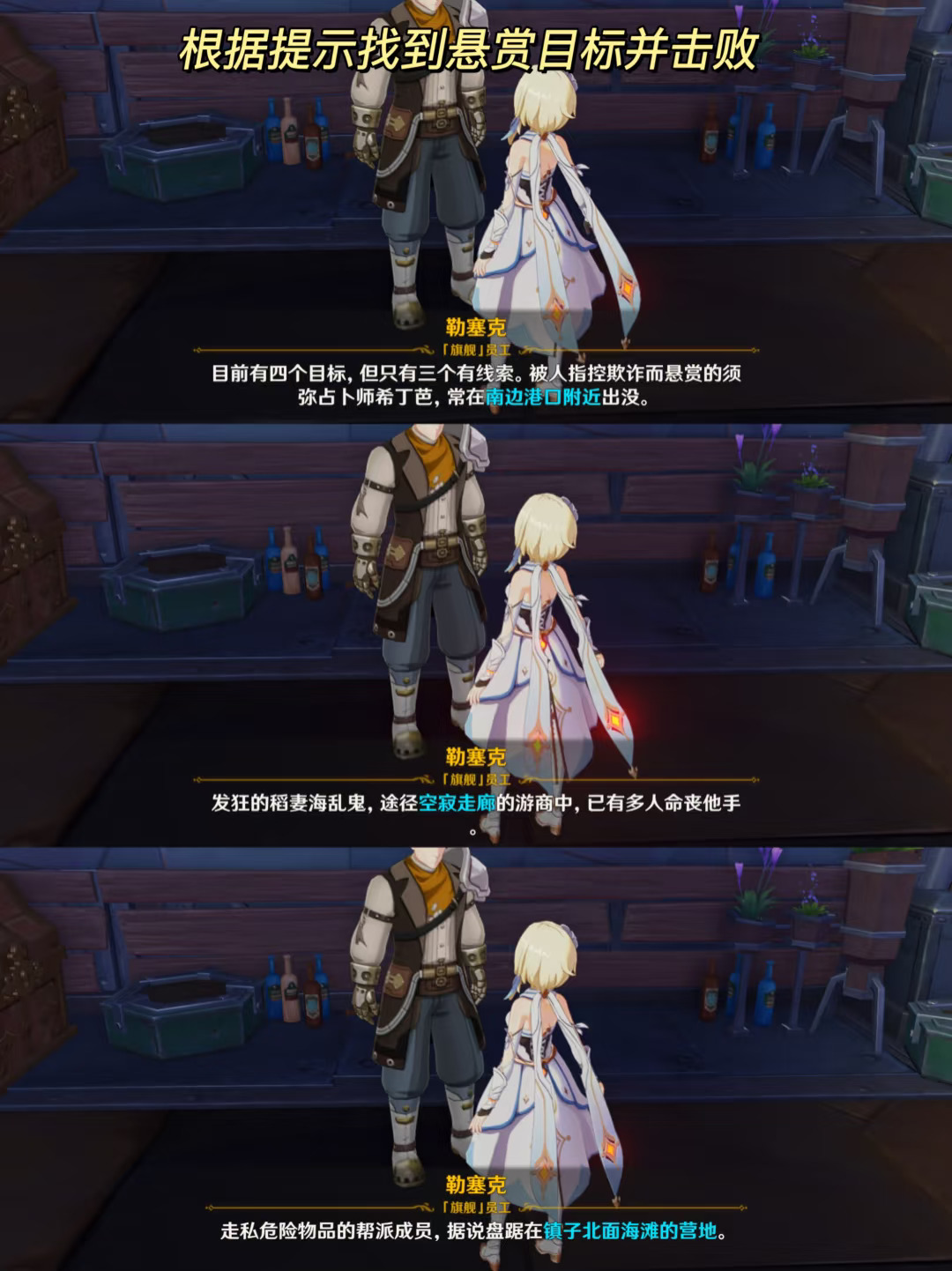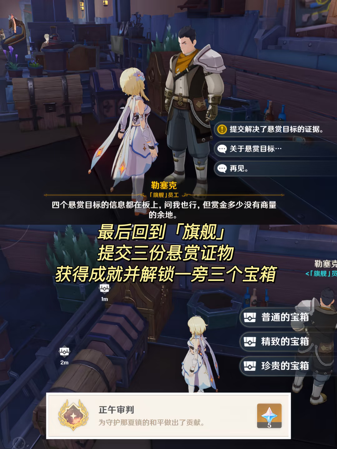 ⏰耗时10min ✅1普通宝箱+1精致宝箱+1珍贵宝箱+1成就【正午审判】 ⏭️那夏镇「旗舰」一进门右侧有三个宝箱,和勒塞克对话了解到三个悬赏目标的点位,到相应点位后会触发剧情,然后击败悬赏目标获得悬赏证物,最后把三份证物交给勒塞克,获得成就并开启一旁三个宝箱! 1️⃣被人指控欺诈而悬赏的须弥占卜师希丁芭,常在南边港口附近出没 2️⃣发狂的稻妻海乱鬼,途径空寂走廊的游商中,已有多人命丧他手 3️⃣走私危险物品的帮派成员,据说盘踞在镇子北面海滩的营地
