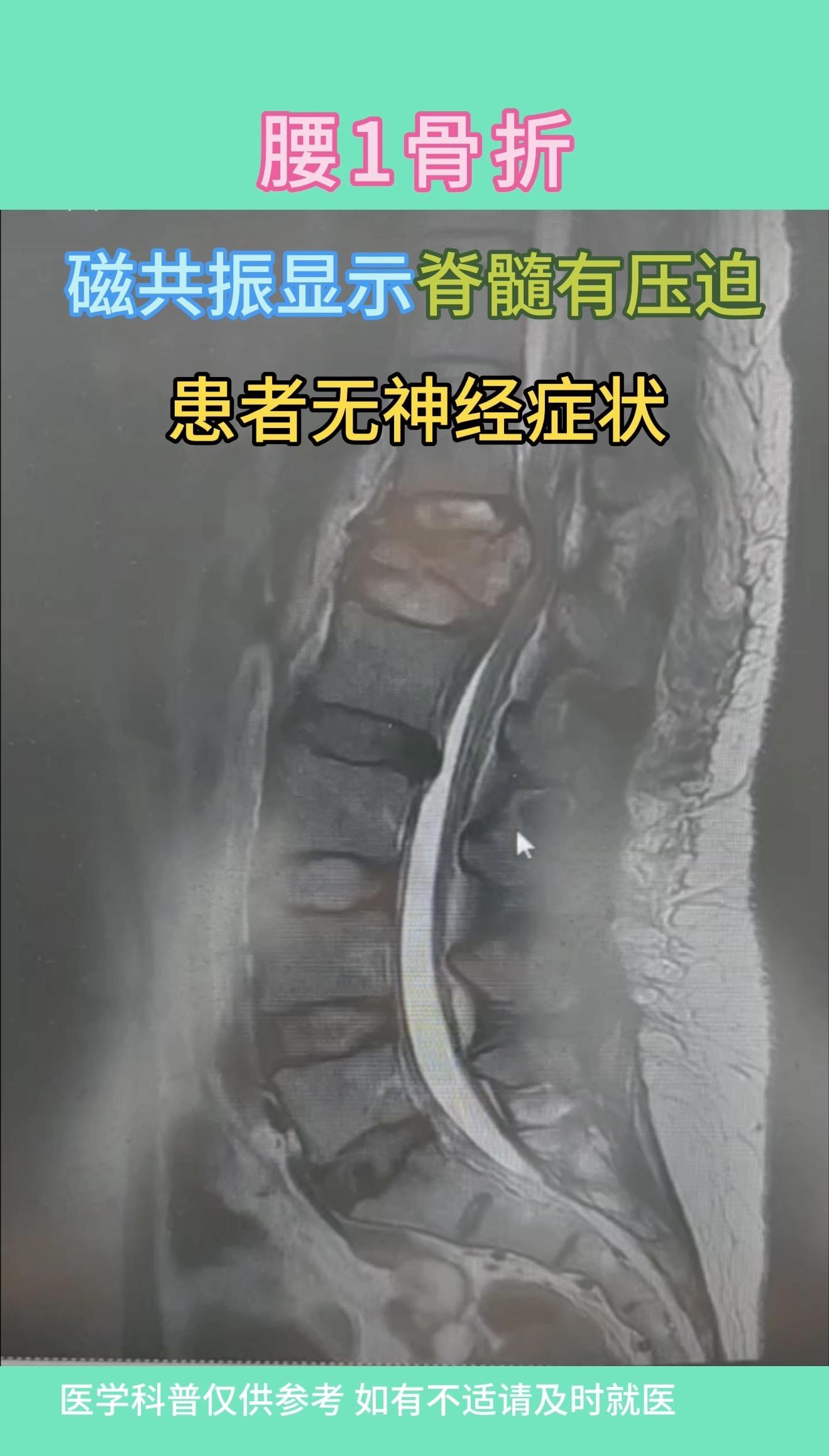 40多岁女性,劳动时从拖拉机上摔下,腰1骨折。磁共振显示脊髓有压迫,但患者无神经症状,就给予单纯固定,未减压,术后恢复好。