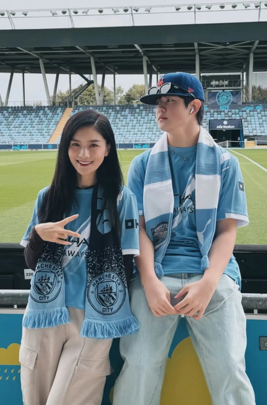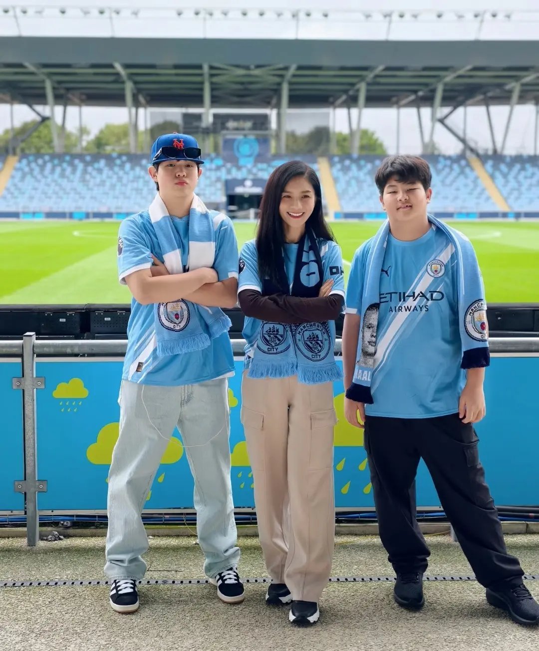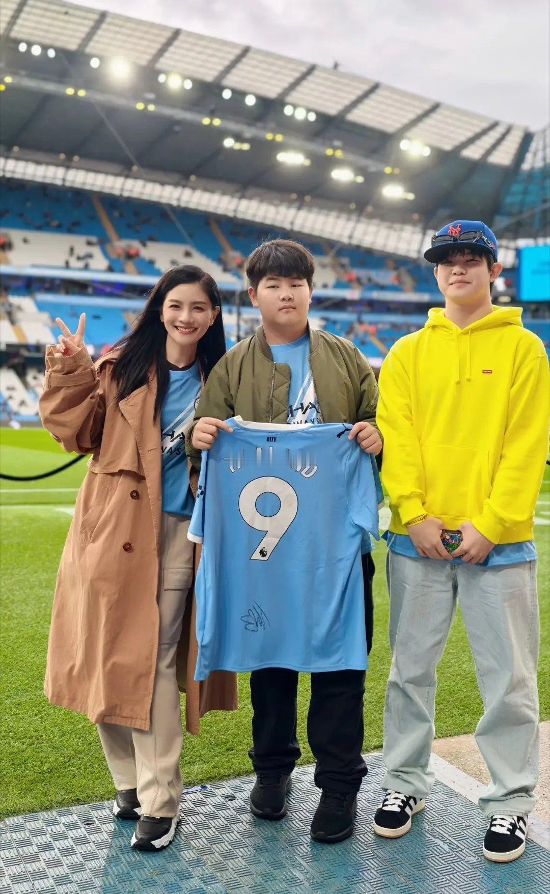 胡可携安吉和小鱼儿现身德比之夜,母子仨齐穿曼城球衣,沙溢没来!