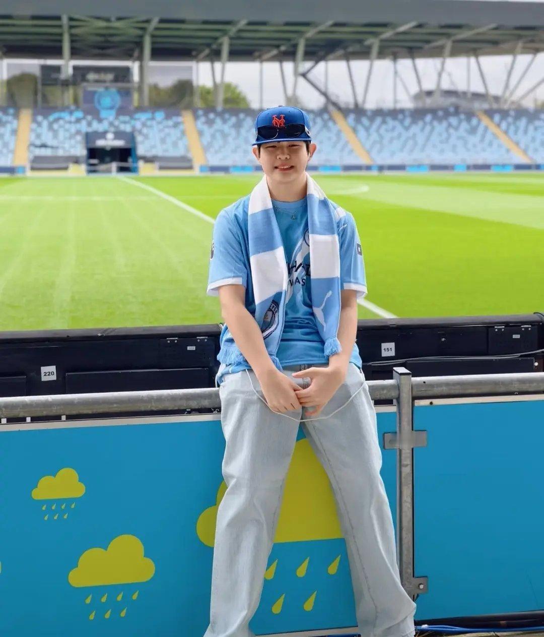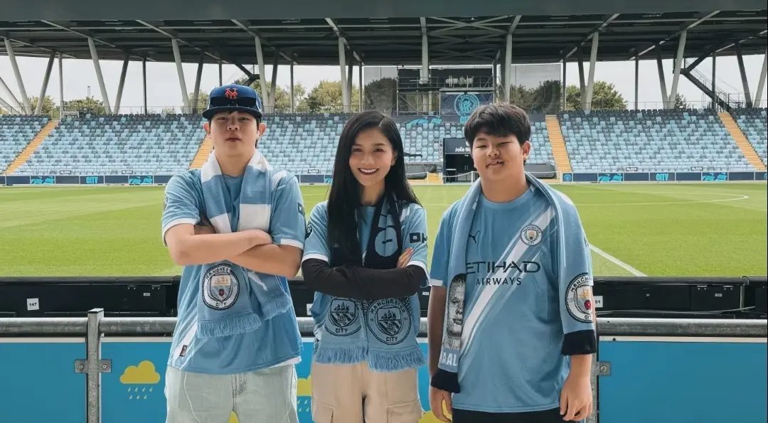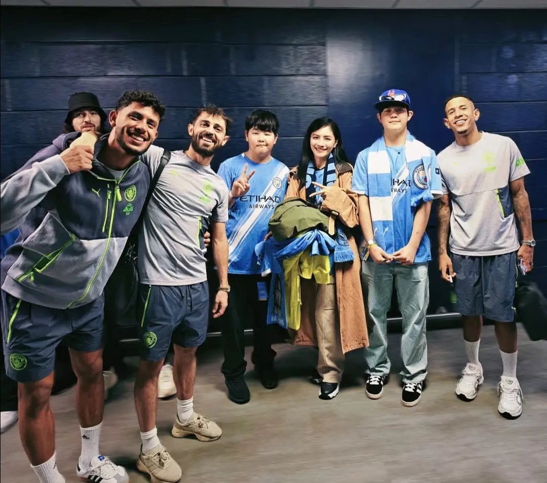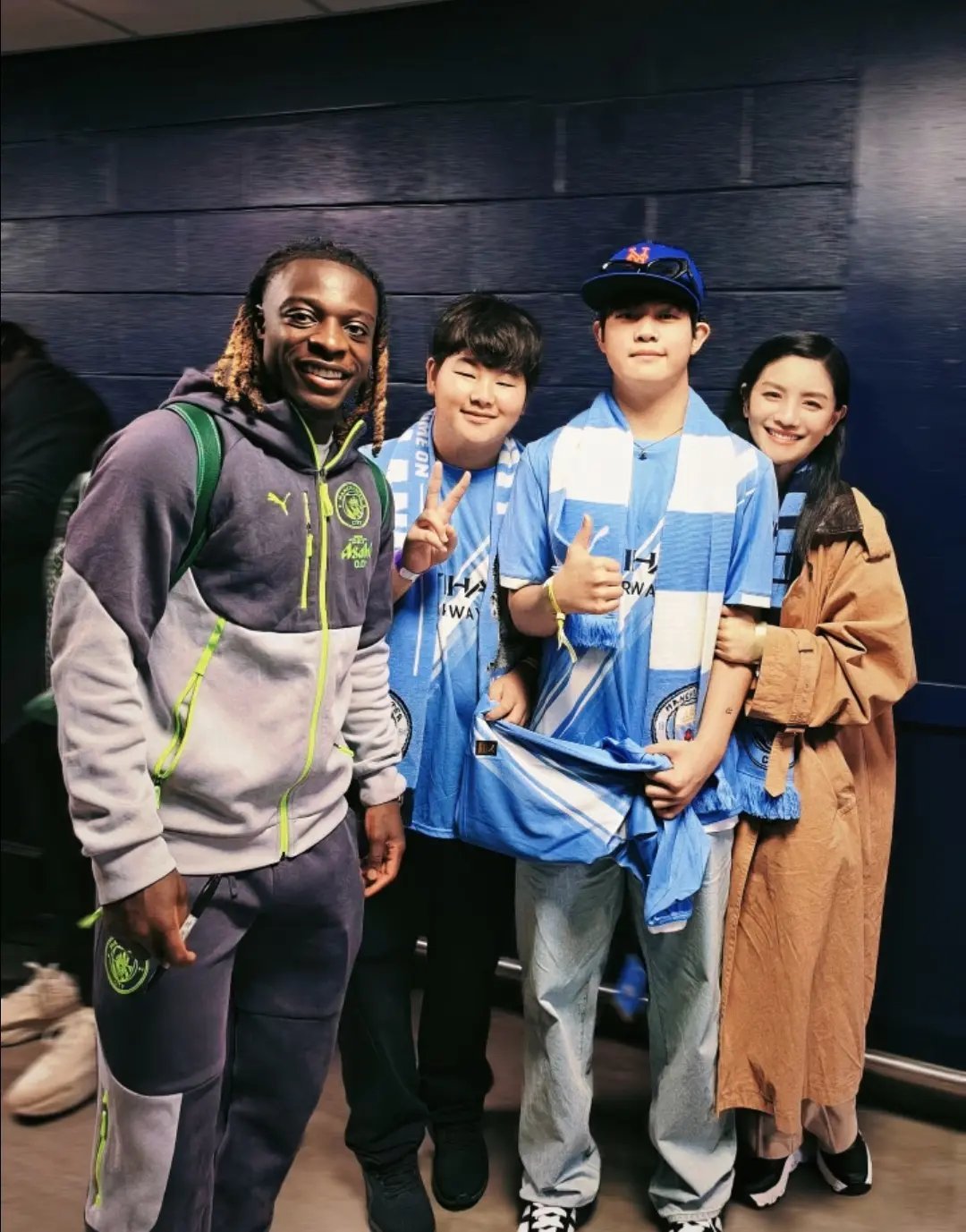 胡可携安吉和小鱼儿现身德比之夜,母子仨齐穿曼城球衣,沙溢没来!