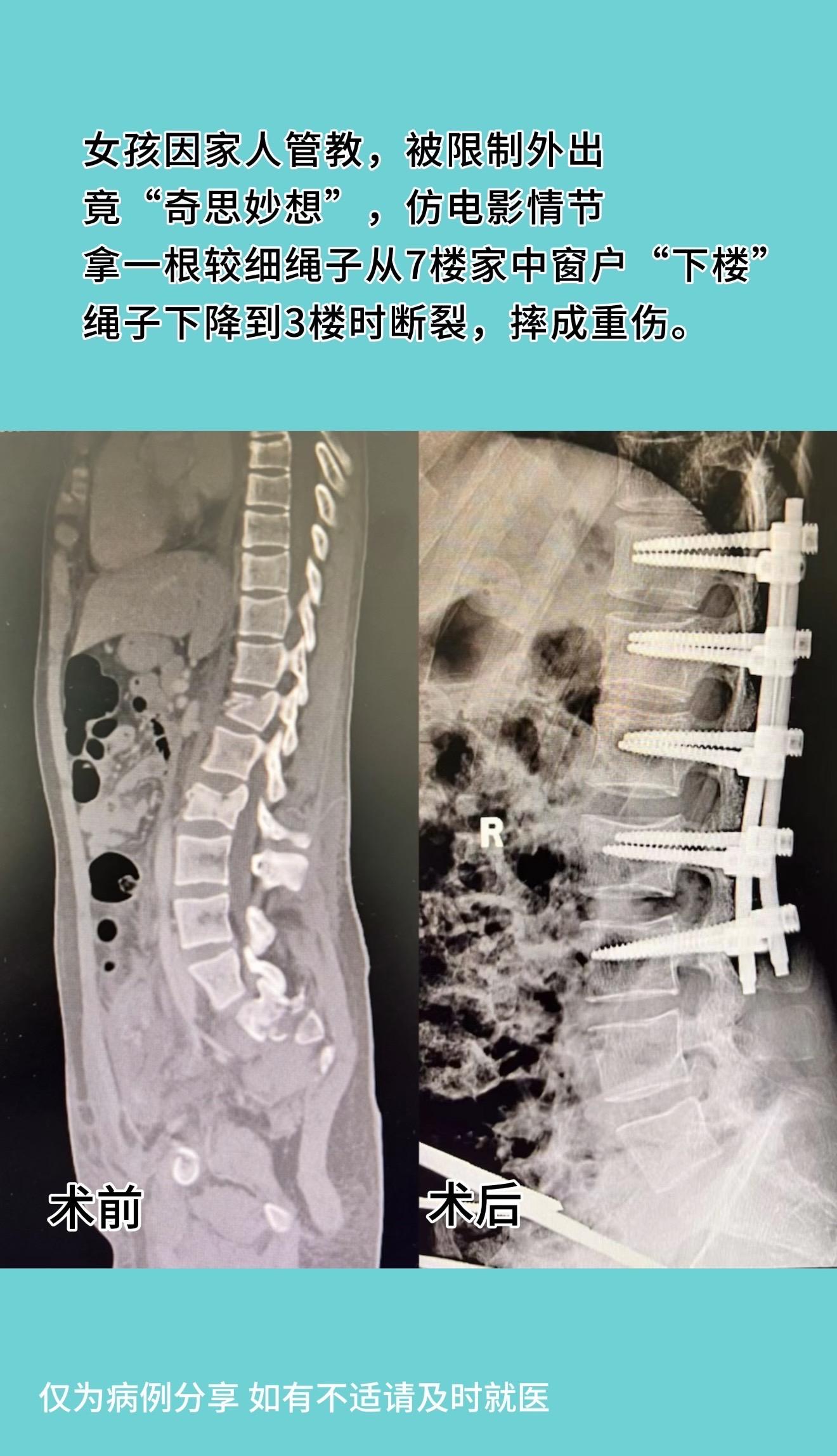 女孩因家人管教,被限制外出,竟“奇思妙想”,仿电影情节,拿一根较细绳子从7楼家中窗户“下楼”,绳子下降到3楼时断裂,摔成重伤。入院后积极治疗,生命体征稳定后,手术治疗,各部位骨折复位满意。左下肢肌力恢复至4级。