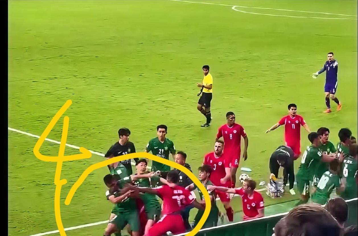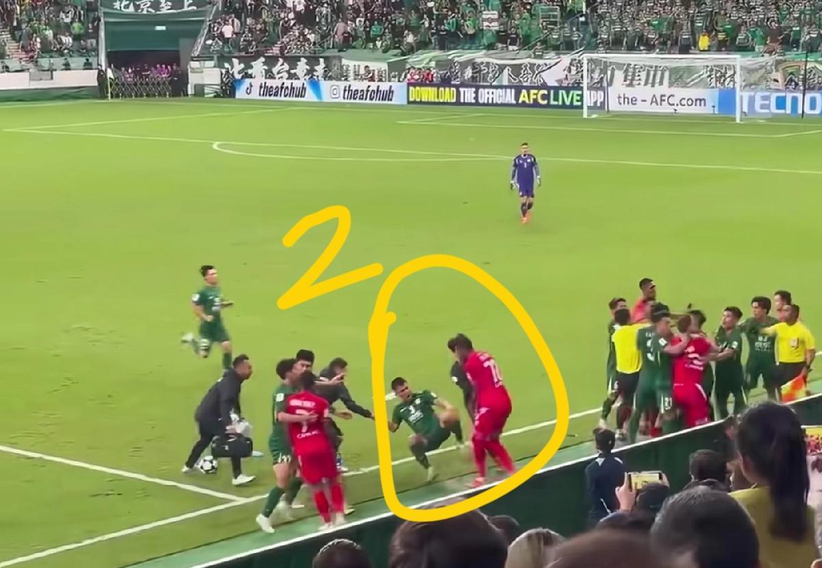 用网友录像的视频截图4张解析一下何宇鹏受伤的过程: 1.当时何宇鹏被撞到捂脸倒地作翻滚样,一开始人在界外,队医也来了,他翻滚回场内; 2.河内公安的外援见他用这种小伎俩拖延比赛,愤怒地跑上前质问他,并且有身体触碰动作; 3.这个时候,国安球员不干了,声援何宇鹏,推搡河内外援,冲突已经开始; 4.更大的冲突是河内另外一个72号外援直接上手把何宇鹏单腿拖出界外,何宇鹏这时立马没事了,进入战斗状态,与72号外援扭打起来。 5.场面更加混乱,多名双方队员扭打在一起,上演全武行。