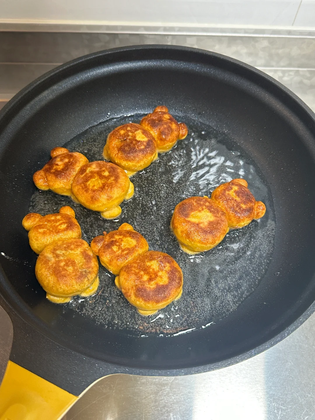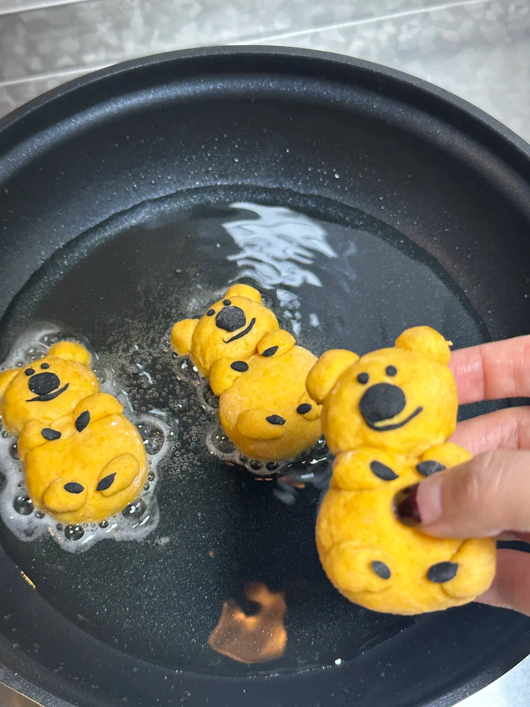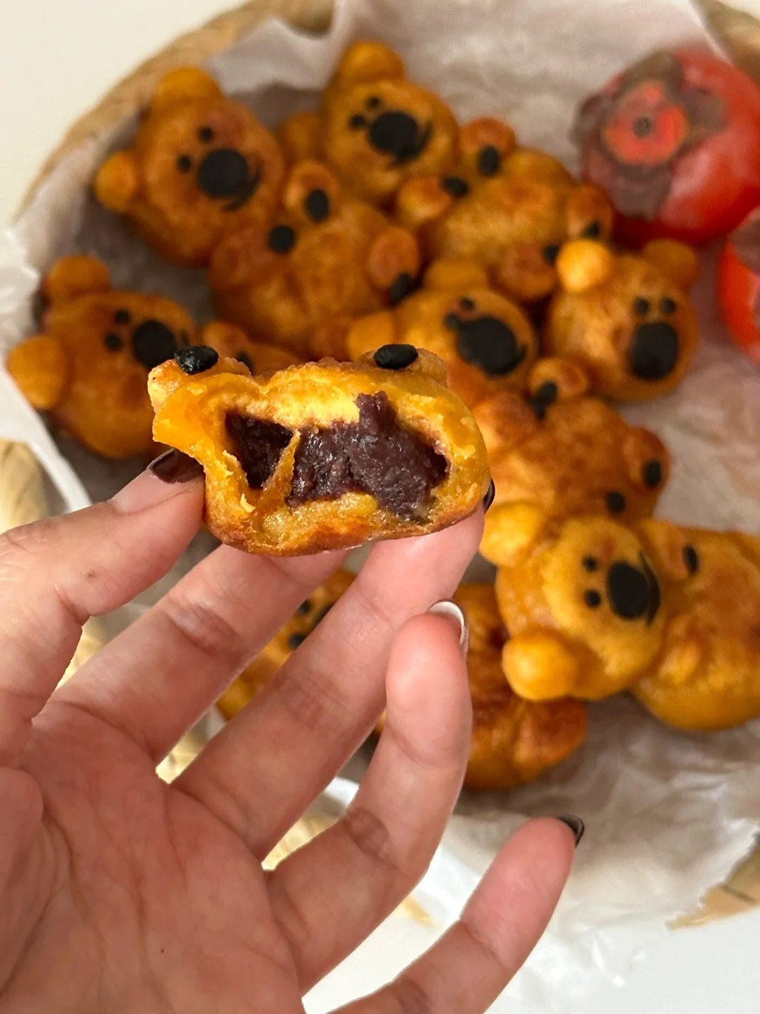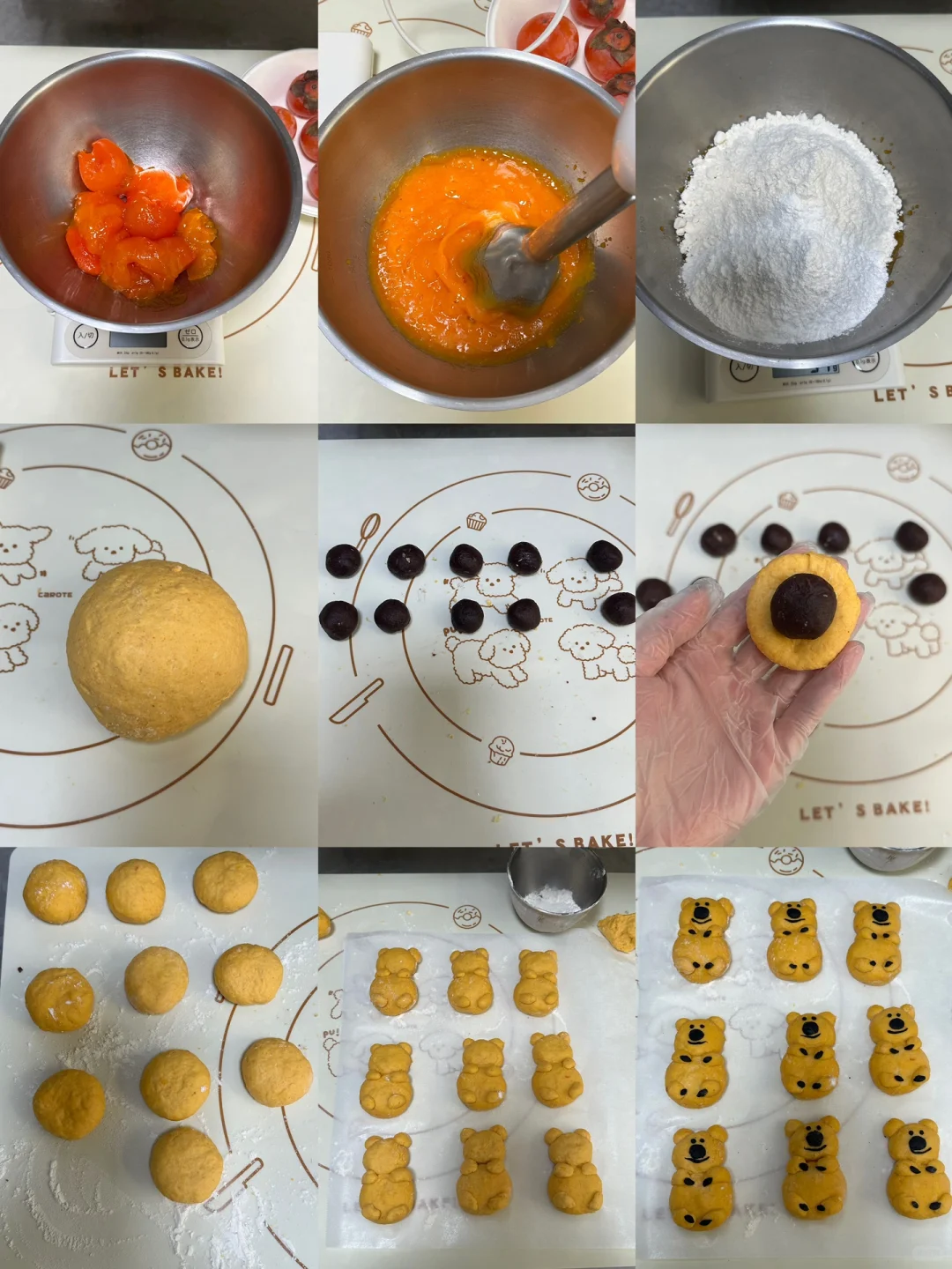 家乡的火晶柿子季到了,作为地地道道的陕西人陕西胃,当然要在这凉意袭人的深秋来一份地地道道的陕西特色下午茶[偷笑R][偷笑R][偷笑R] 搭配上可爱的柿子椒熊形象,可爱美味➕1️⃣[害羞R] 所需食材: 火晶柿子(去皮去蒂)250g,中筋面粉200g,糯米粉50g,自制枣泥馅儿 制作步骤: ①火晶柿子去皮去蒂用料理棒搅打成泥 ②筛入面粉和糯米粉,揉匀光滑 ③豆沙馅10g一个分好(大概可以包10-11个) ④和好的柿子面团取20g包入豆沙馅揉圆,轻轻压平,再取18g面团不包馅儿做小熊的头,少量面团搓出耳朵和四肢 ⑤取一小块面团竹炭粉染成黑色,制作柿子椒熊细节 ⑥平底不粘锅锅中倒油覆盖锅底,中小火放入柿子饼,底部焦黄翻面,继续煎至焦黄,柿子饼膨起便可出锅 快来叫作业吧! 足不出户就可以尝到我的家乡特色美味啦![拔草R]