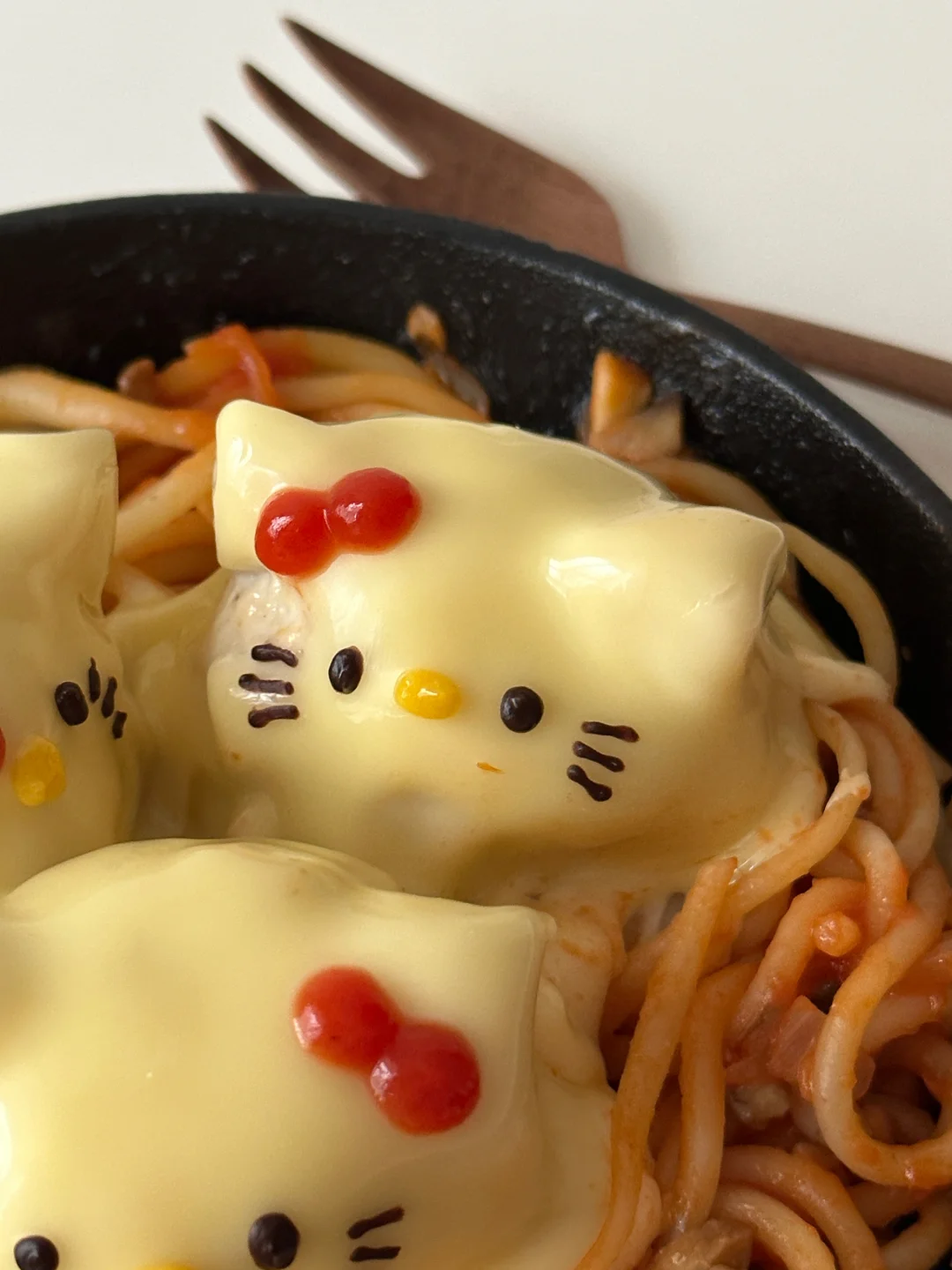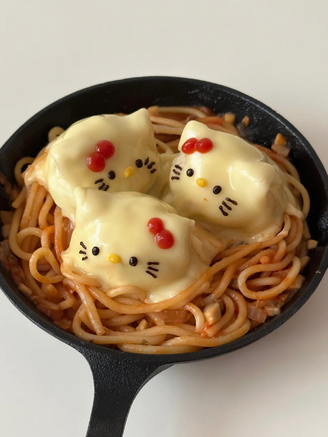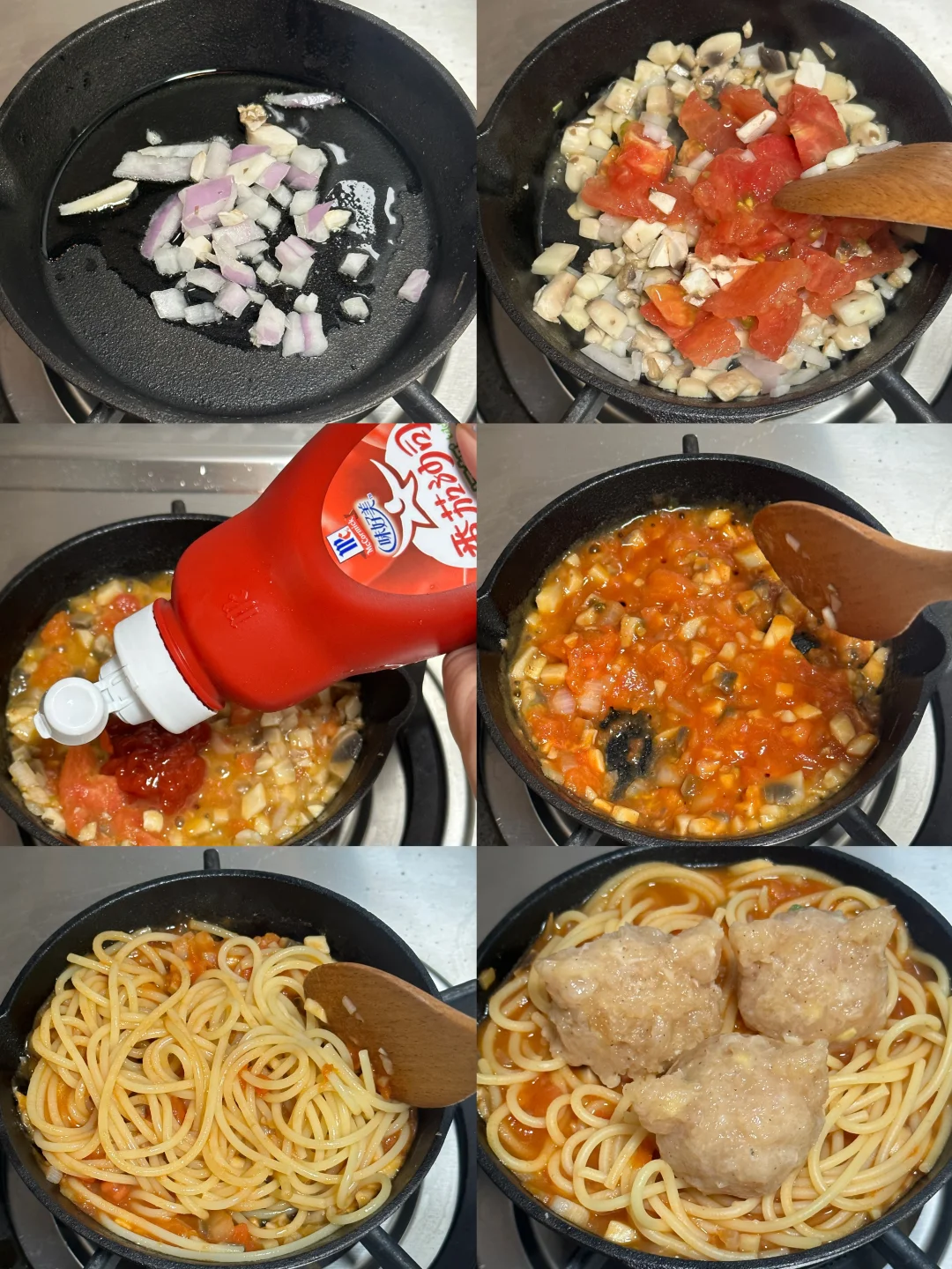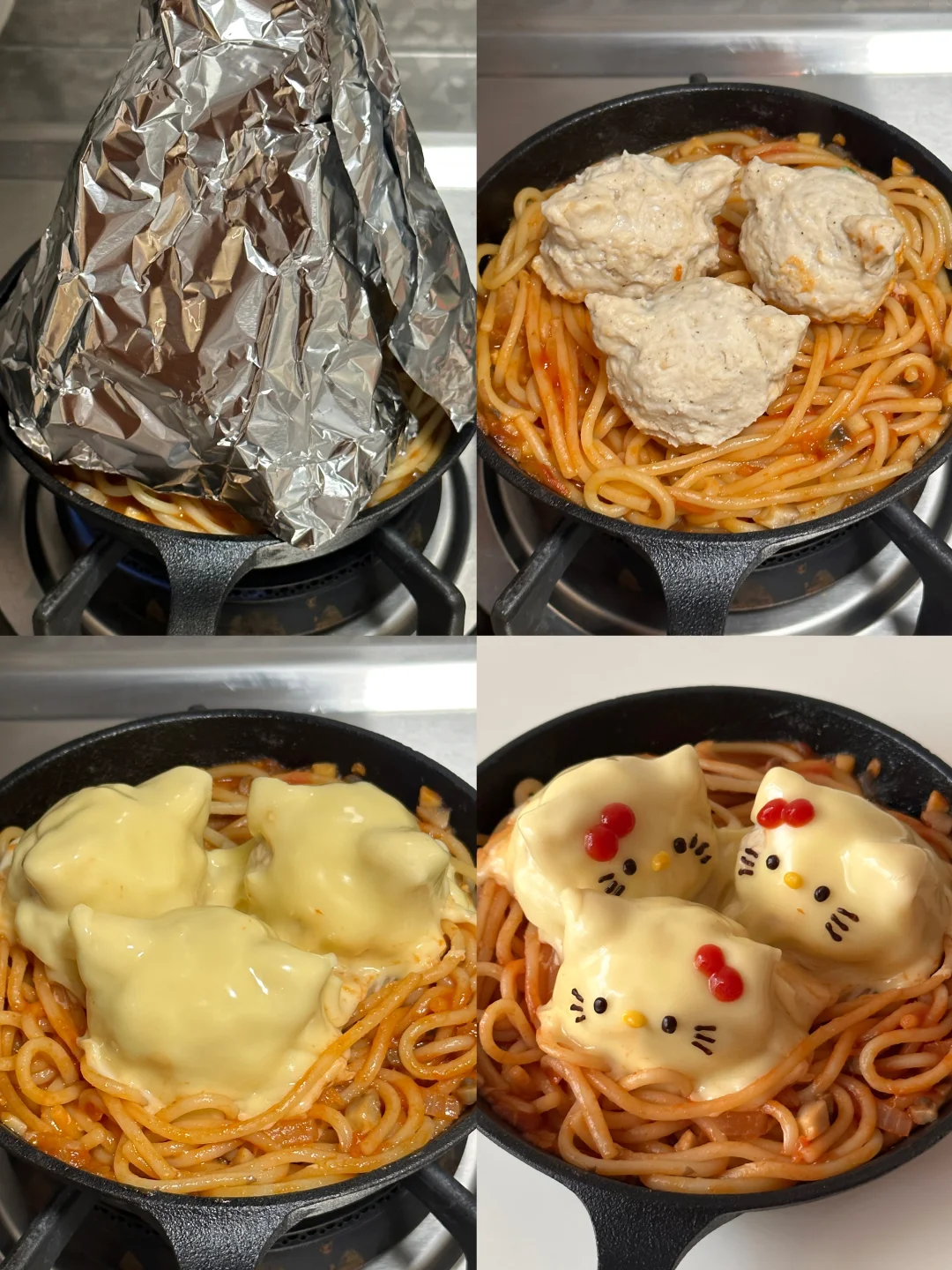 3️⃣加入煮熟的意面翻拌均匀,再加入少量水,没过意面,摆上做好的猫咪形状鸡肉丸(鸡胸肉➕适量黑胡椒➕洋葱➕盐绞肉机绞成鸡肉泥,再加入适量玉米淀粉和蚝油)tips:手上沾水更好团肉丸子哦!
