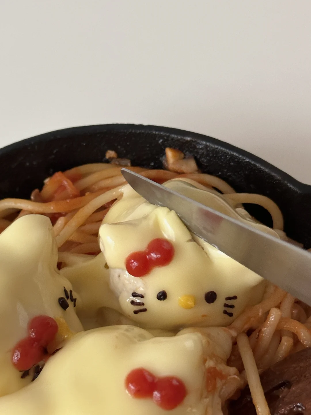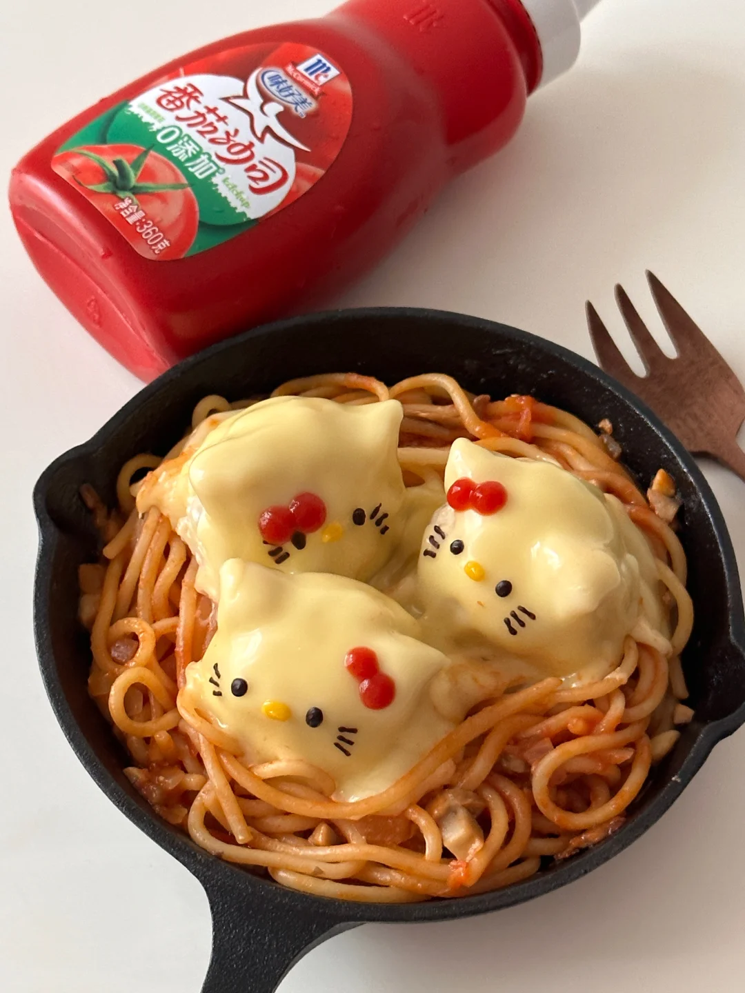 4️⃣盖上盖子焖十分钟左右,出锅,趁热盖上三片芝士片,装饰上表情,番茄沙司做蝴蝶结