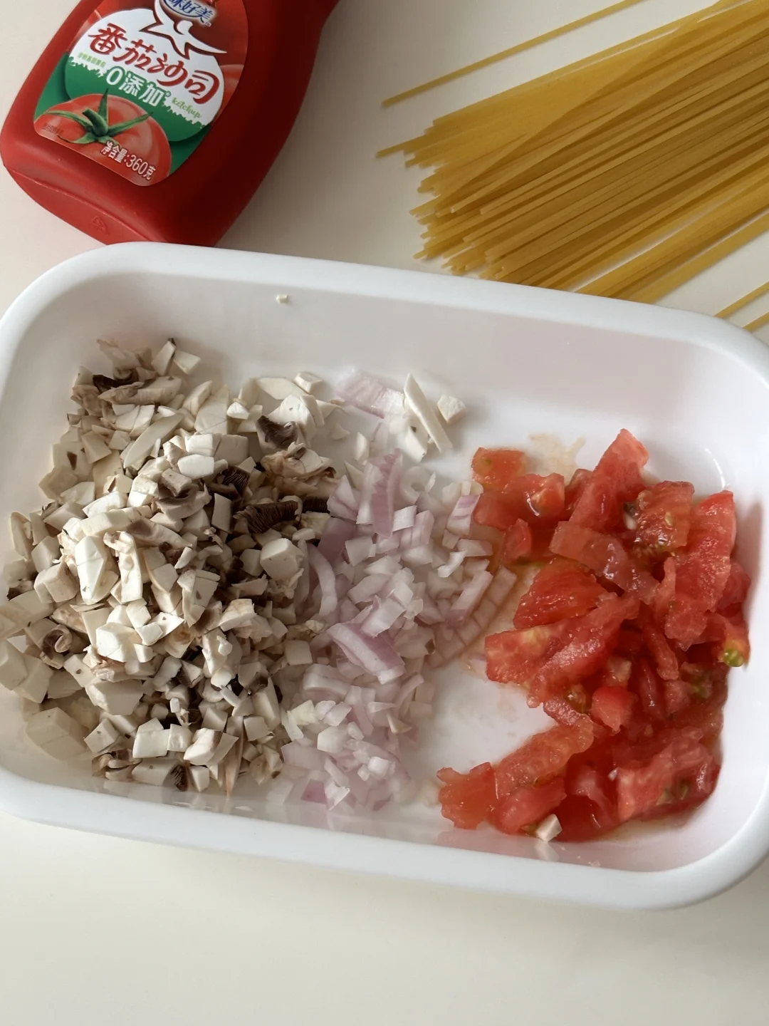 味好美番茄沙司,双孢菇,洋葱,番茄,意面,芝士片,鸡肉,黑胡椒,玉米淀粉