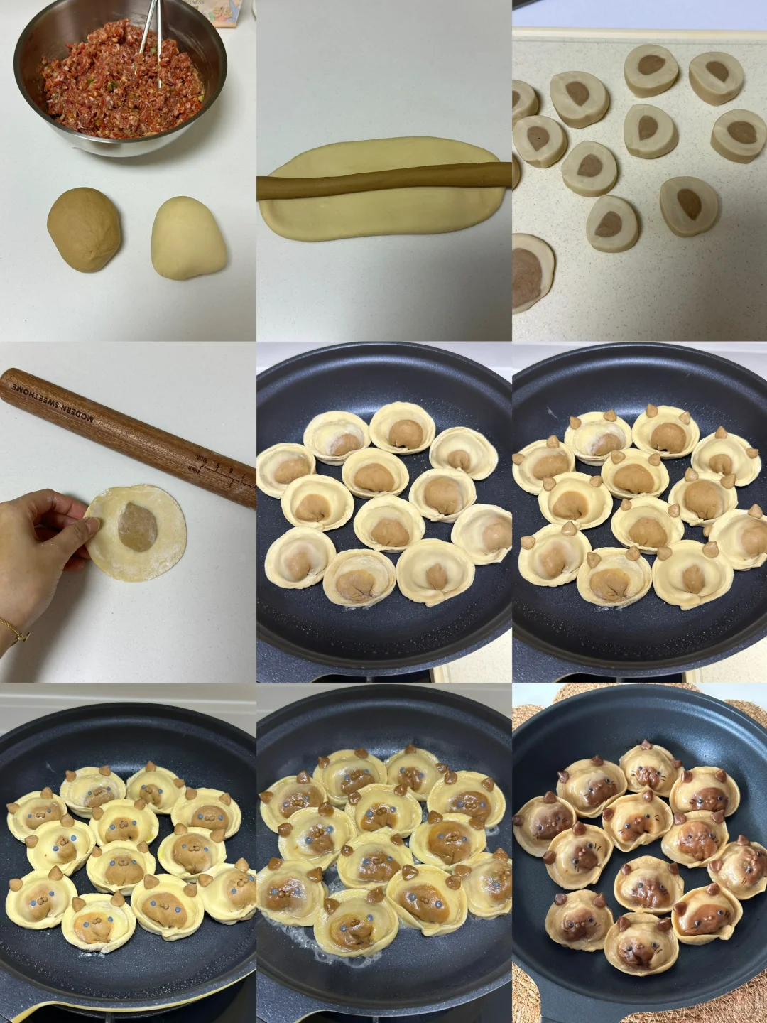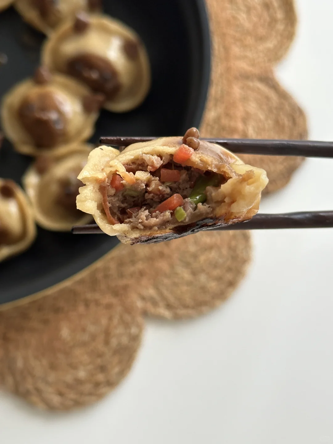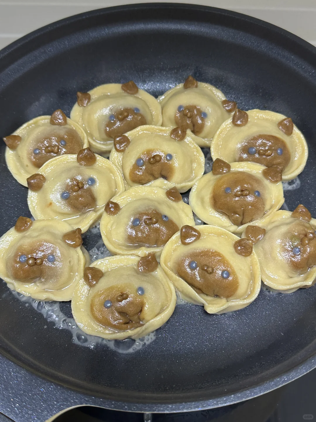 5️⃣锅中少油,放入饺子,开大火煎至底部焦黄,倒入没过饺子底部的水,持续开大火盖盖收汁,揭盖,转小火,继续煎至底部焦脆即可~