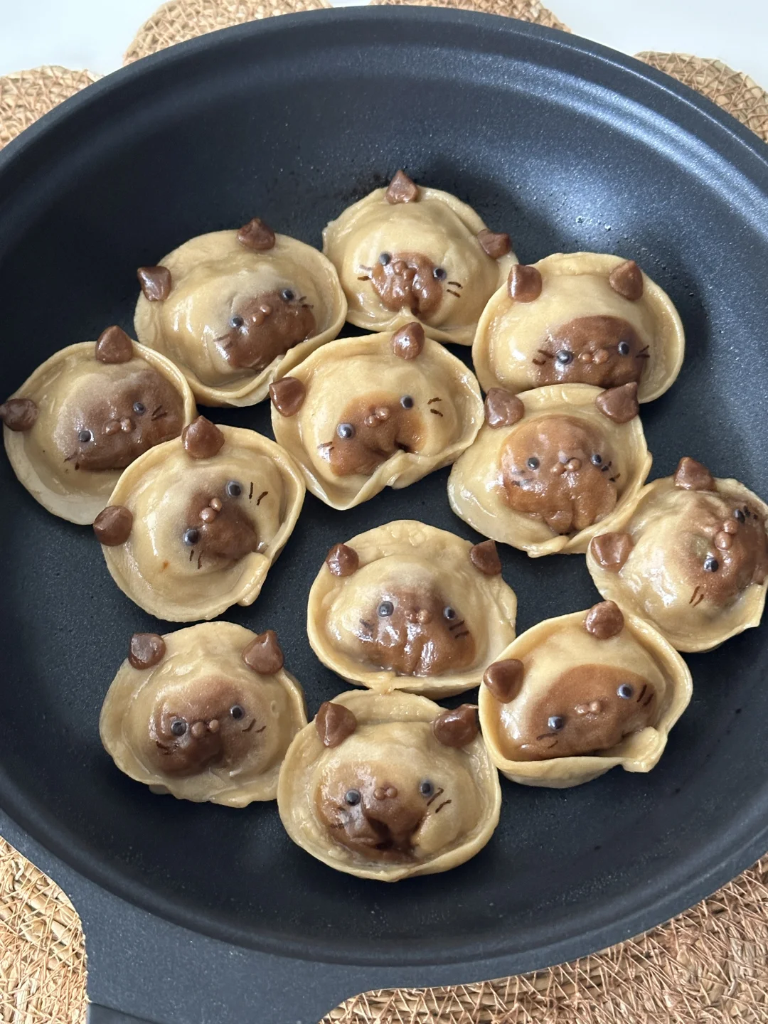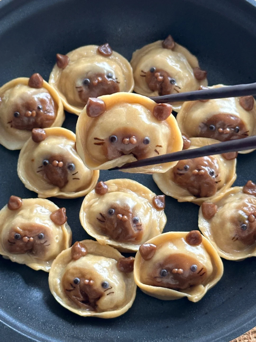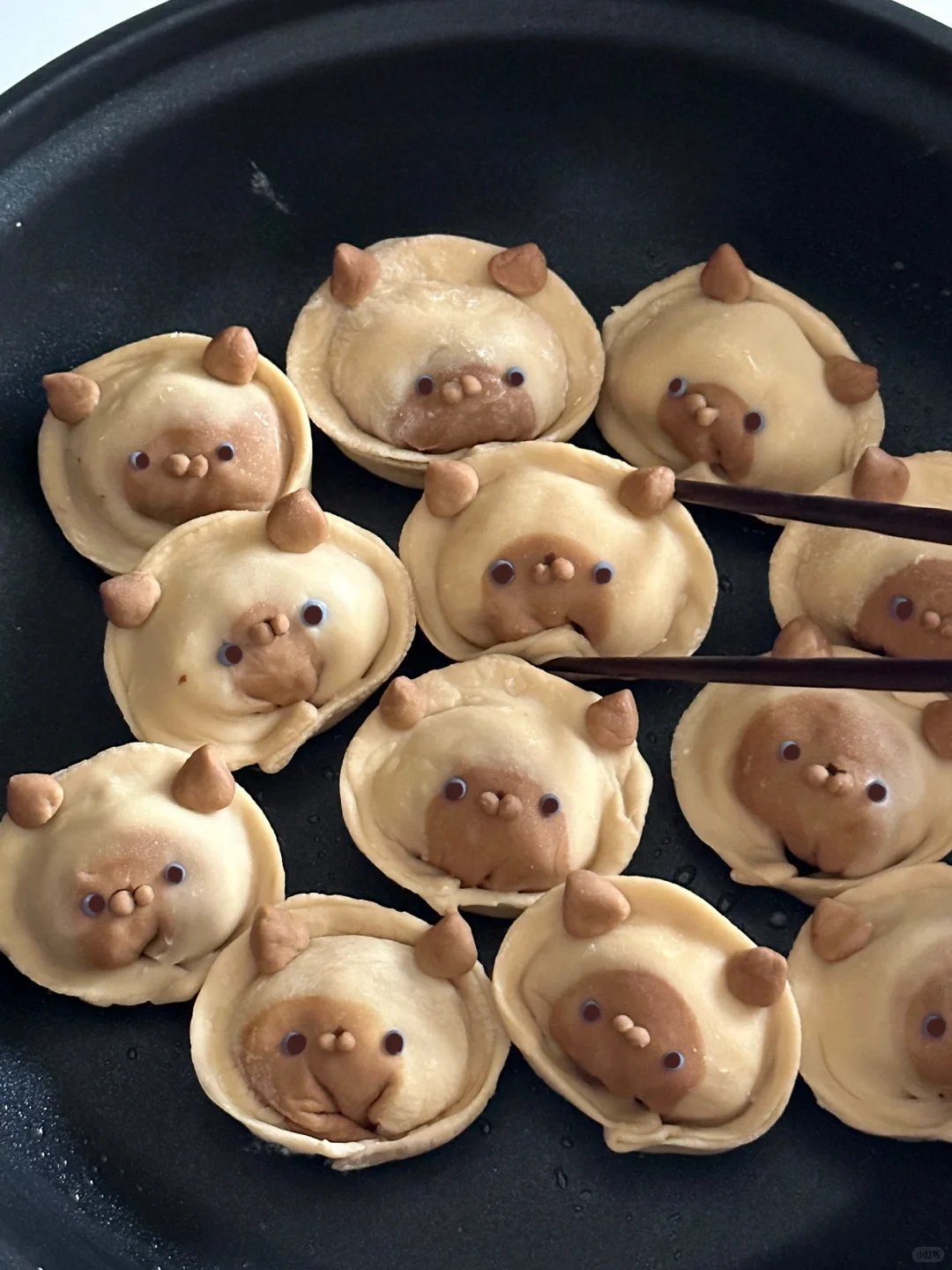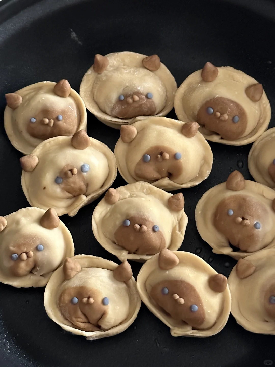 5️⃣锅中少油,放入饺子,开大火煎至底部焦黄,倒入没过饺子底部的水,持续开大火盖盖收汁,揭盖,转小火,继续煎至底部焦脆即可~