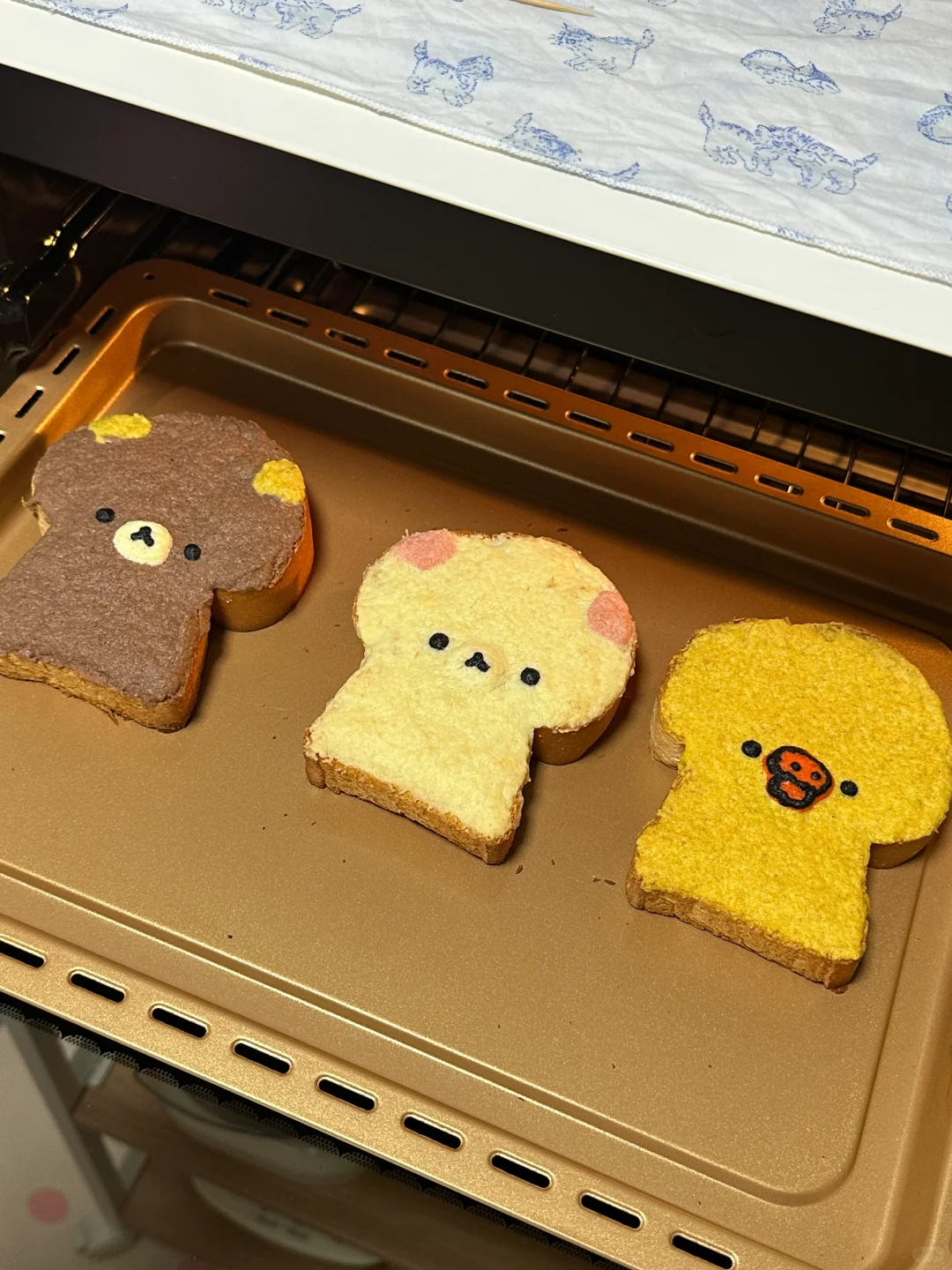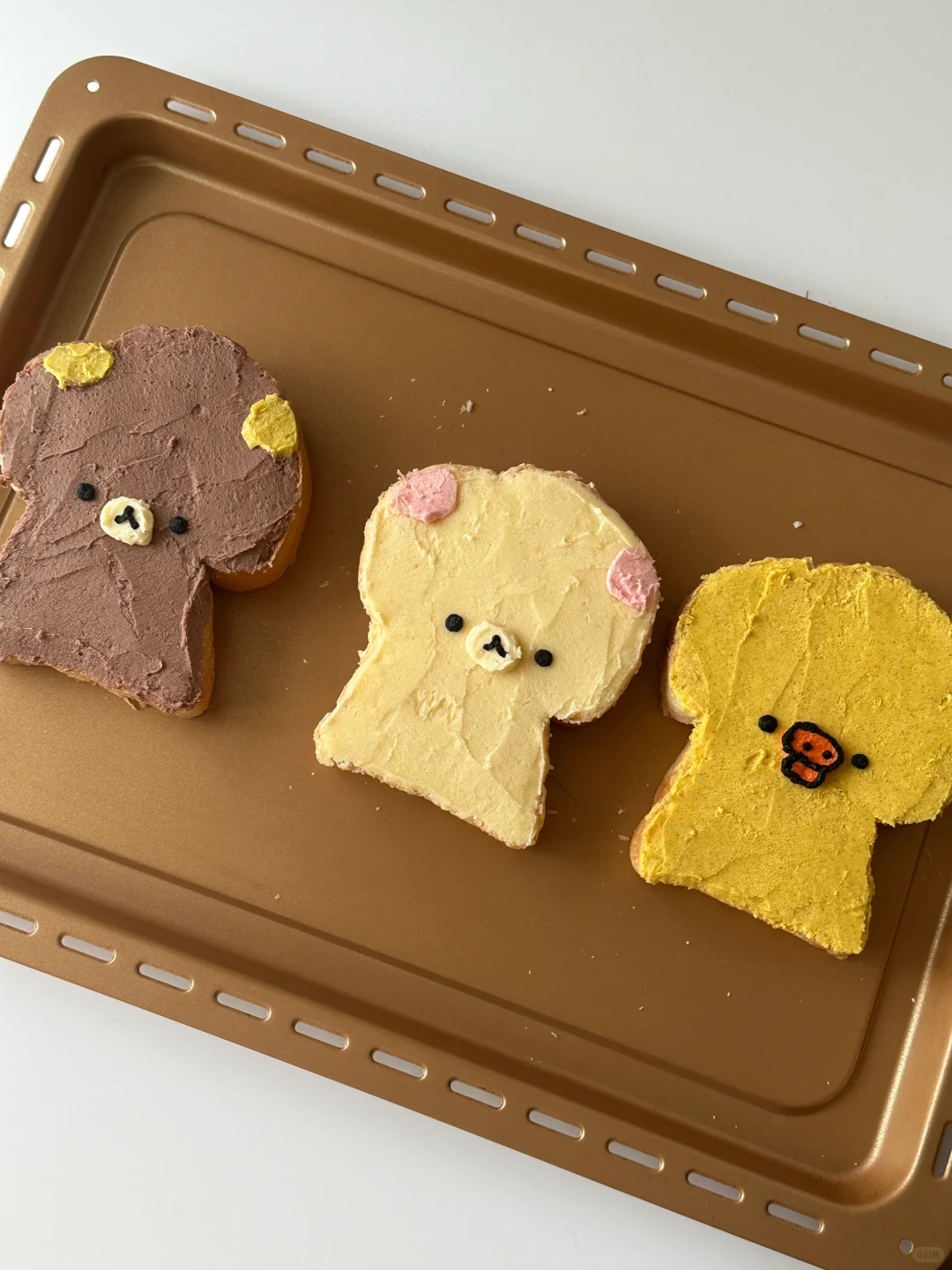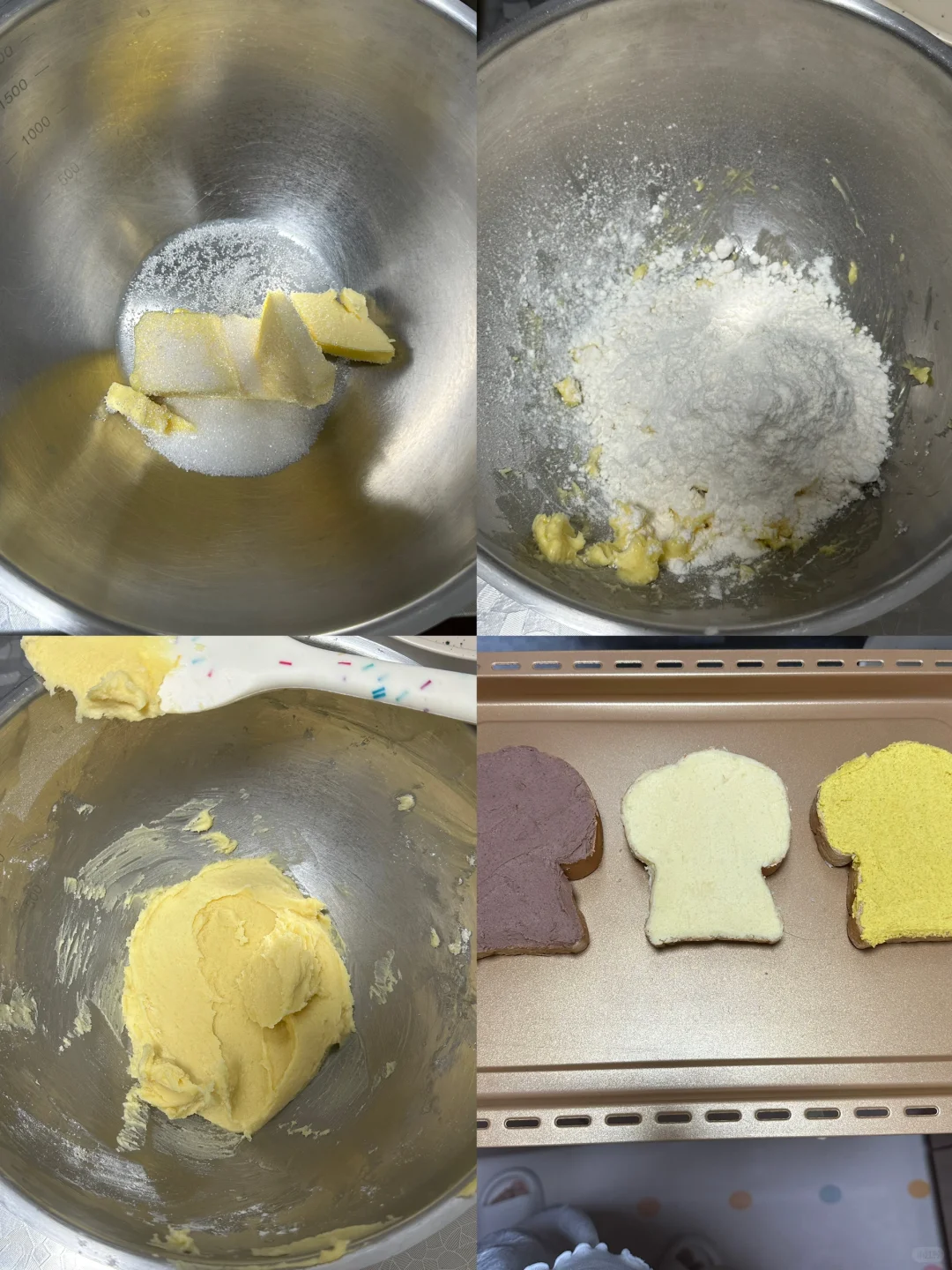 酥酥脆脆,奶香十足的奶酥吐司片大家一定要试试呀~做法简单!十几分钟就能搞定好吃的一餐[害羞R][害羞R][两颗心R]烘烤的时候满屋黄油奶香~ [种草R]所需材料: 吐司片,黄油60g,细砂糖15g,低筋面粉65g,可可粉,南瓜粉,仙人掌果粉,竹炭粉 [种草R]制作步骤: ①软化黄油里加入细砂糖,搅拌均匀 ②筛入低筋面粉,翻拌至无干粉 ③用可可粉(棕色),仙人掌果粉(粉色),竹炭粉(黑色),南瓜粉(黄色)调色 ④刮刀磨面,细节部分用裱花袋装饰 ⑤烤箱预热180°烘烤8-10分钟即可 快来交作业吧![萌萌哒R][萌萌哒R]
