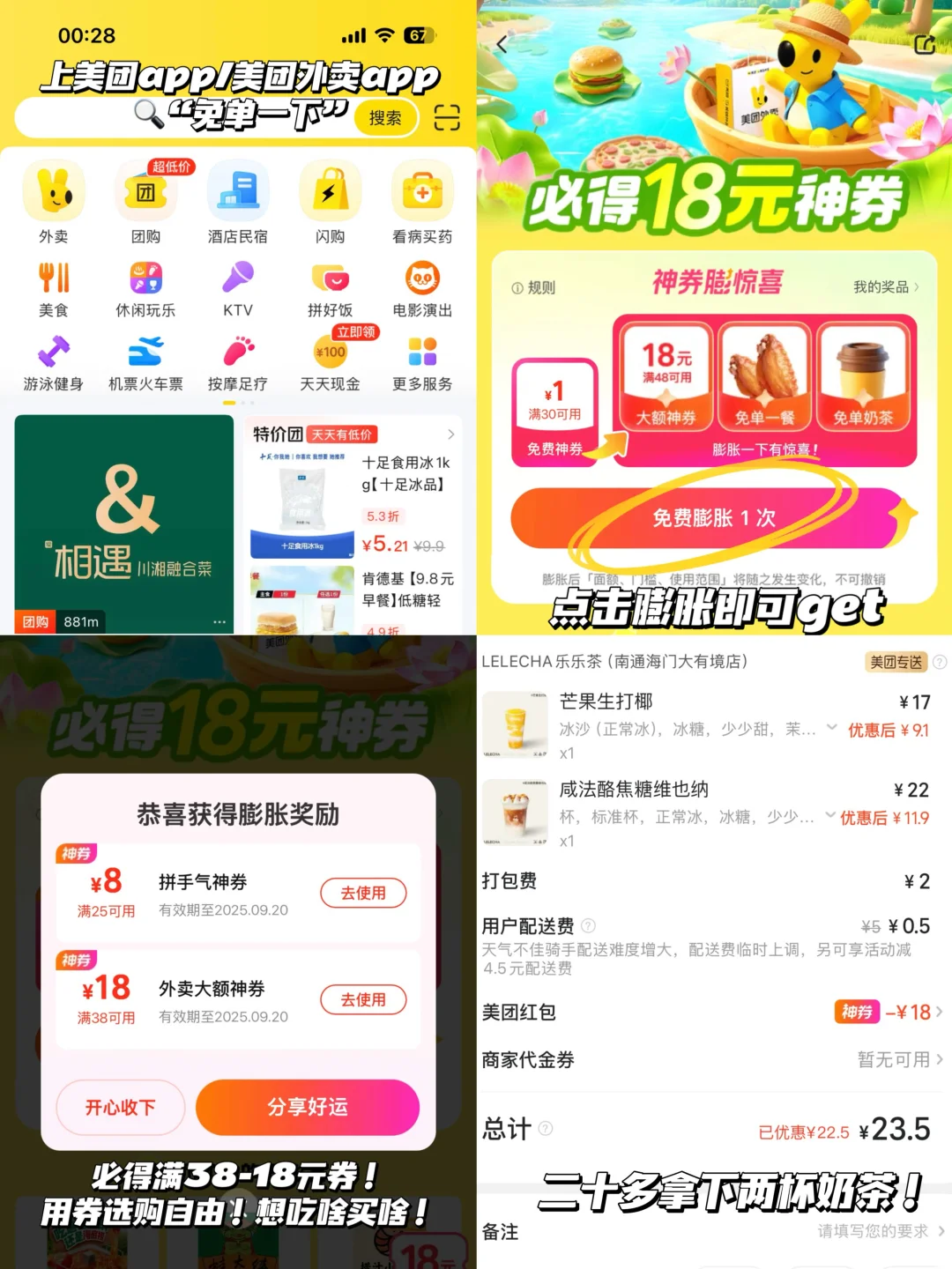 秋天来了!又到了想喝奶茶季节! 今天打开美团外卖发现居然有大额满减券!立马冲了! 活动时间:9.20 美团外卖必膨满38-18券获取步骤: 1️⃣打开美团app/美团外卖app 2️⃣搜索🔍免单一下 3️⃣再点击膨胀按钮即可get 用券选购自由!想吃啥买啥! 满38-18 点两杯奶茶 四舍五入 用一杯的价格拿下两杯奶茶了🥺真滴划算! 爱喝奶茶的可以试试我的攻略! ✅古茗芋泥牛乳小丸紫➕芋泥➕紫米丸子➕正常冰➕微糖 ✅古茗黑糖布雷➕珍珠➕沙冰➕微糖 ✅古茗抹茶布雷➕抹茶加浓➕正常冰➕不额外加糖➕奶盖 ✅QQ草莓奶茶➕两颗冰淇淋➕改茉莉绿茶➕改A2牛乳➕小珍珠➕不另外加糖➕标准冰 ✅蜜雪冰城芋泥好暖椰➕正常冰➕五分糖➕珍珠换成芋圆 ✅一点点藏青盐咸奶绿➕少冰➕不另外加糖➕椰果➕珍珠➕奶霜➕牛乳 家人们都给我冲!!!