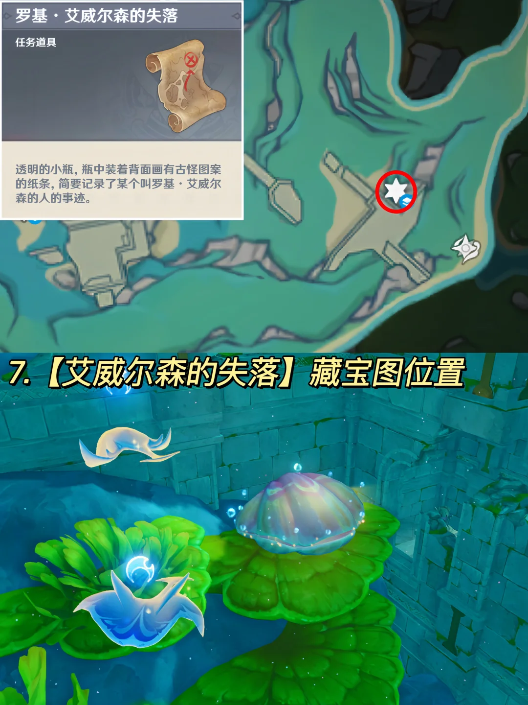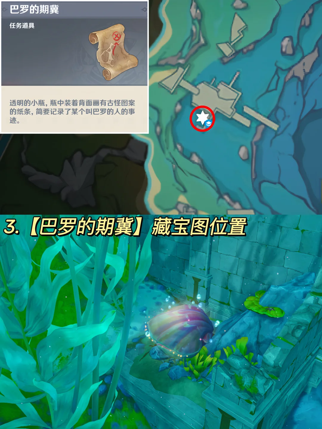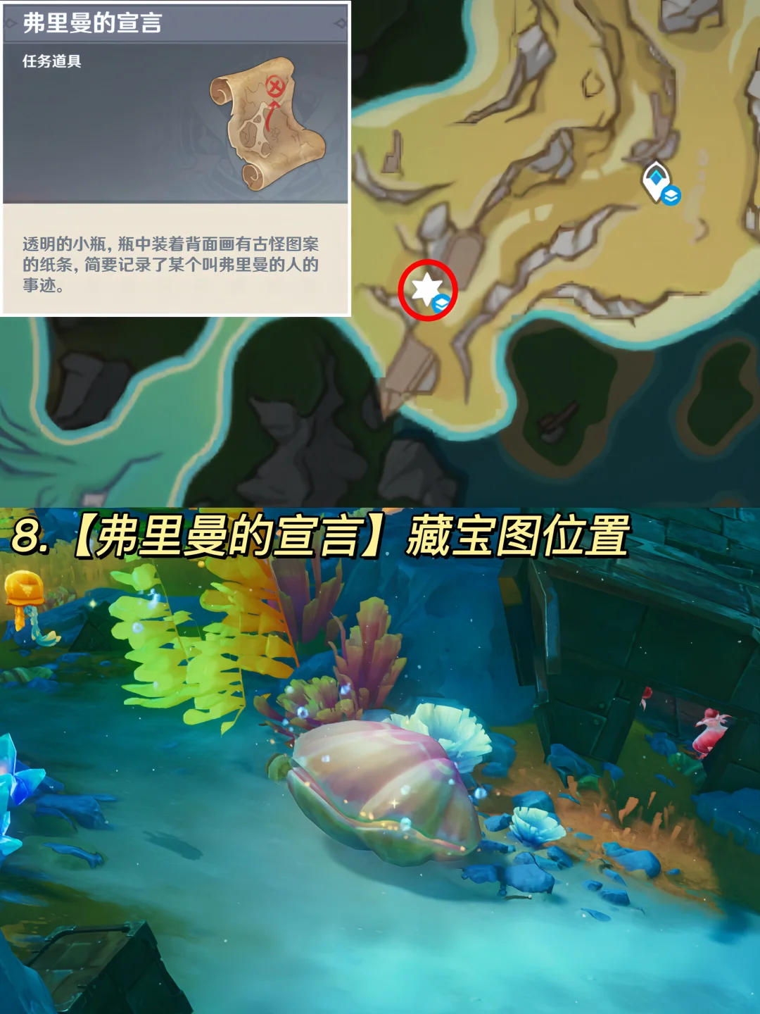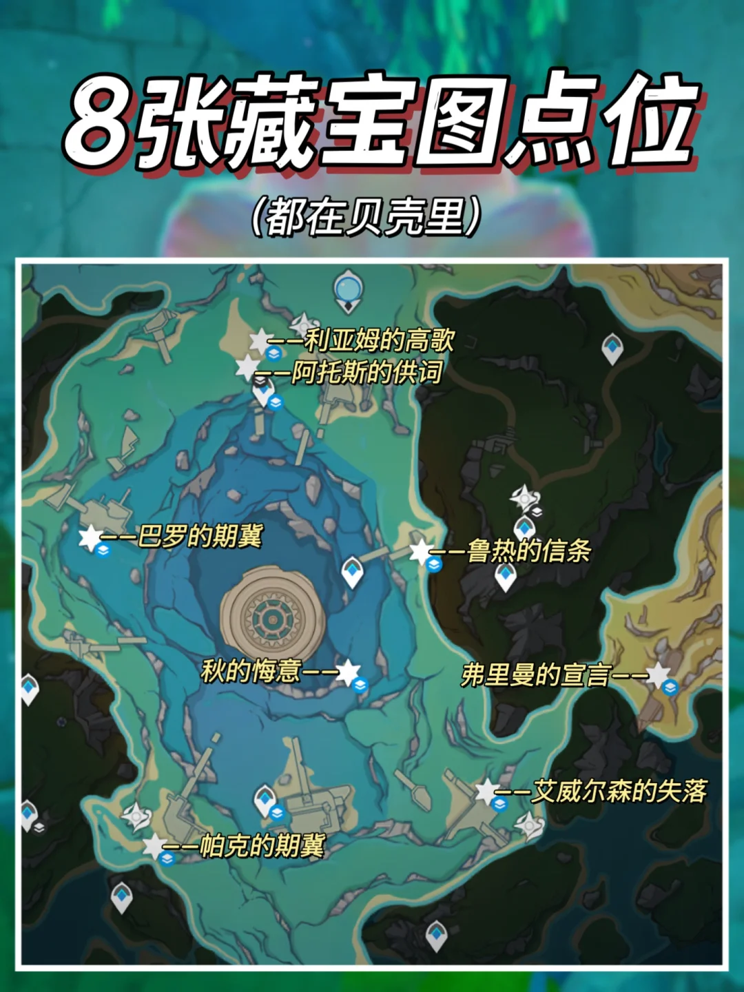 ⏰耗时30min ✅8个宝箱+1个隐藏成就【为了众人的愿望】 ⏭️去枫丹海底寻找八张藏宝图,根据提示开启八个宝箱,最后可以获得一个成就。 全部做完背包里的八张藏宝图会合成一张完整的[虹彩蔷薇的理想]藏宝图。 八张藏宝图: 🔘利亚姆的高歌 🔘阿托斯的供词 🔘巴罗的期冀 🔘帕克的期冀 🔘鲁热的信条 🔘秋的悔意 🔘罗基•艾威尔森的失落 🔘弗里曼的宣言