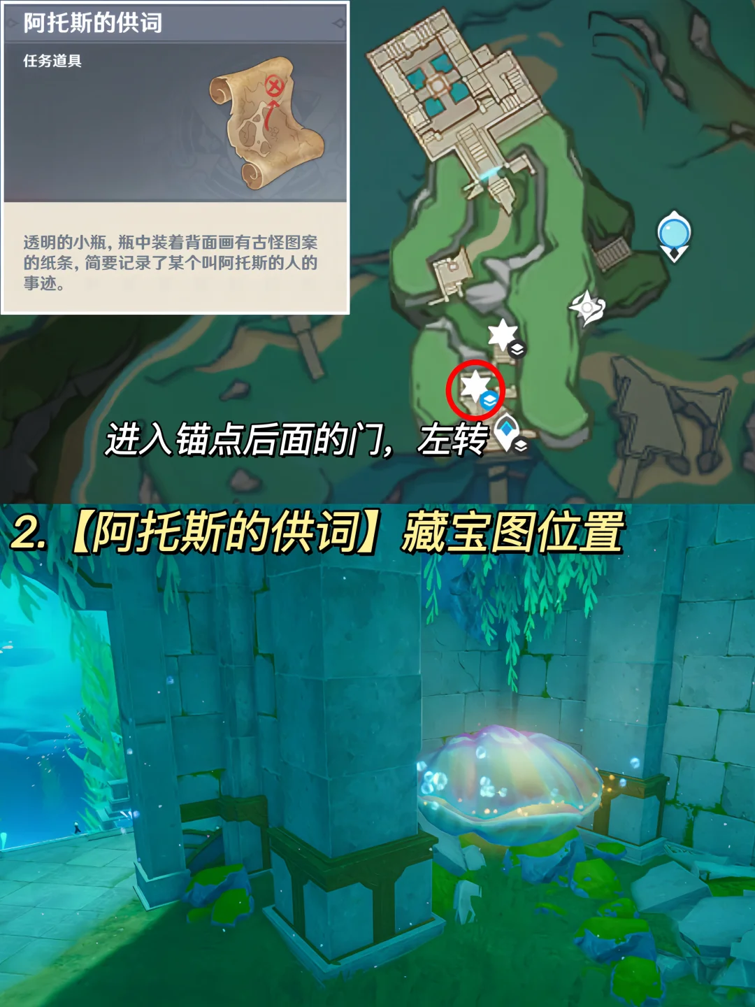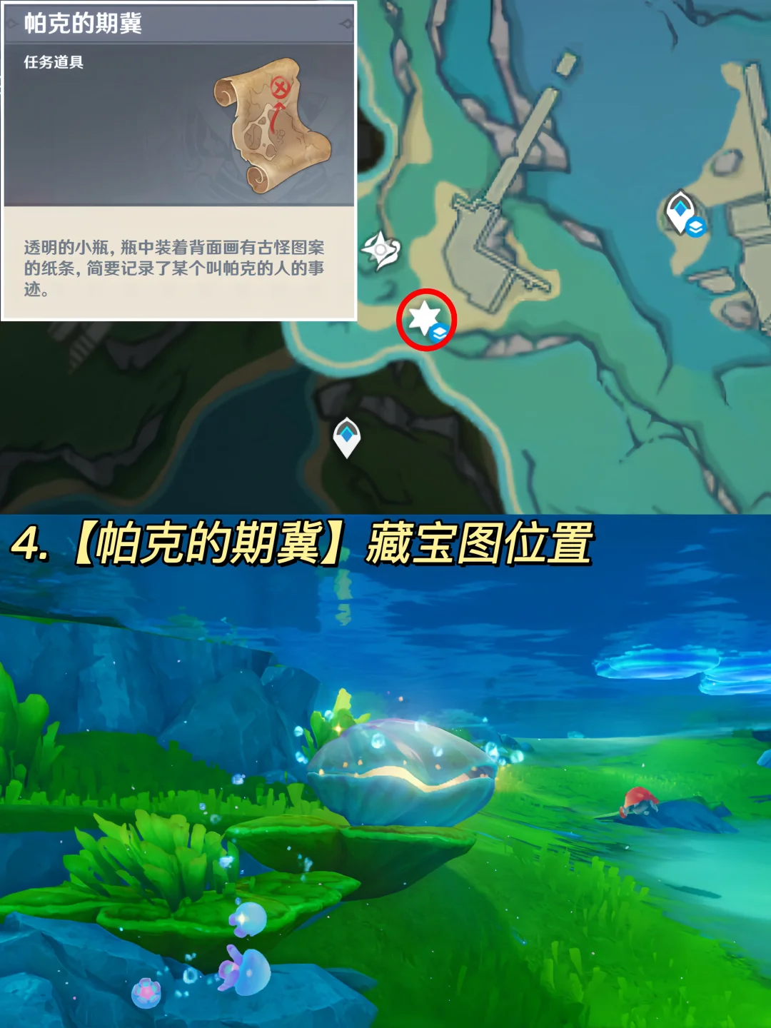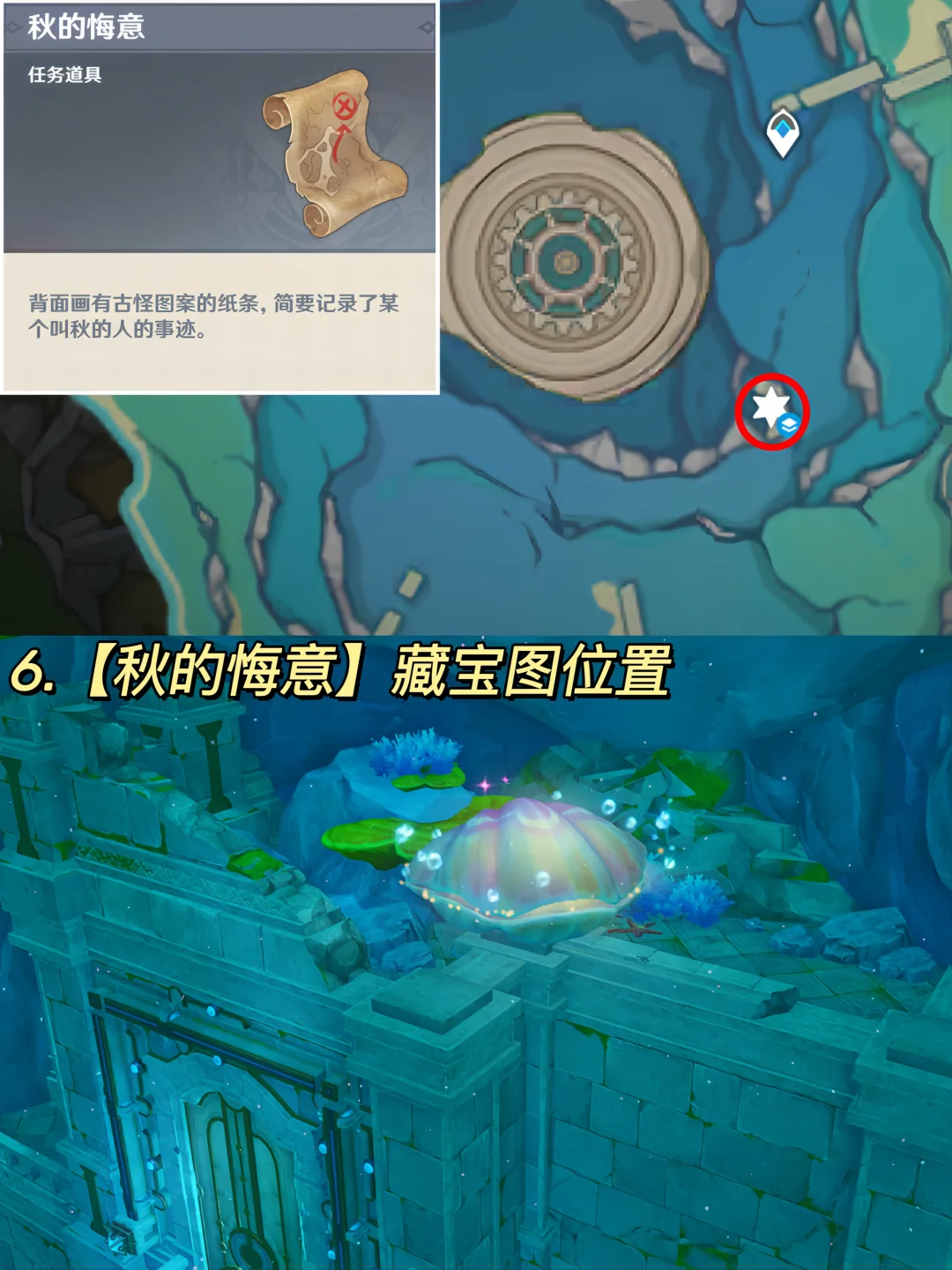 ⏰耗时30min ✅8个宝箱+1个隐藏成就【为了众人的愿望】 ⏭️去枫丹海底寻找八张藏宝图,根据提示开启八个宝箱,最后可以获得一个成就。 全部做完背包里的八张藏宝图会合成一张完整的[虹彩蔷薇的理想]藏宝图。 八张藏宝图: 🔘利亚姆的高歌 🔘阿托斯的供词 🔘巴罗的期冀 🔘帕克的期冀 🔘鲁热的信条 🔘秋的悔意 🔘罗基•艾威尔森的失落 🔘弗里曼的宣言