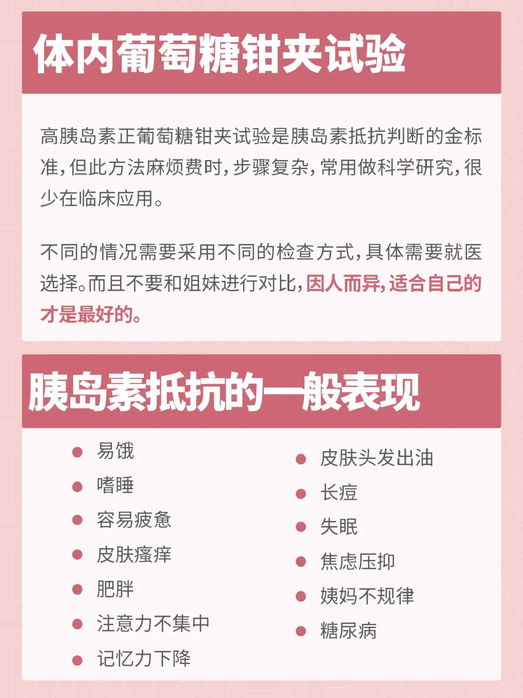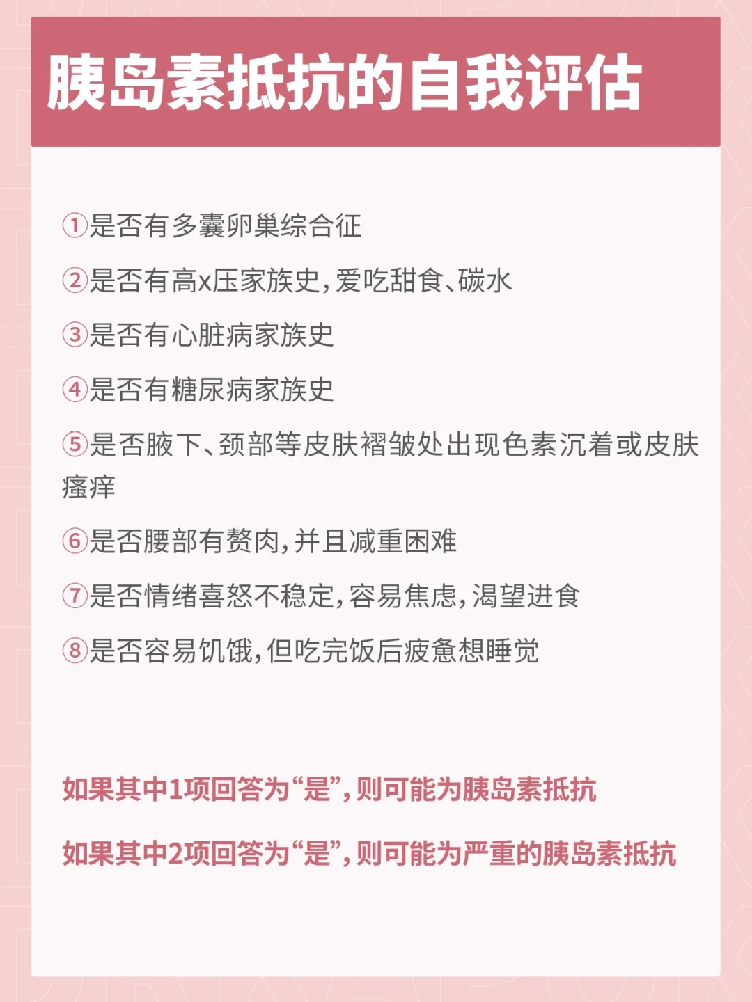 姐妹们,你们有没有出现吃的很撑很饱,可是没一会又饿了;[叹气R]或者特别容易疲倦,想睡觉;还有明明有运动,可是体重很难减下来。如果发生这些情况,要注意是不是胰岛素抵抗❗ 胰岛素出现的频率越来越高,而且出现年轻化的趋势。尤其已经是多囊的姐妹,就更加要重视。 教给大家5个好方法,[派对R]学会判断自己胰岛素水平。 如果确认为胰岛素抵抗,也不用恐慌,关键是养成健康的生活方式,这样会有良好的改善。