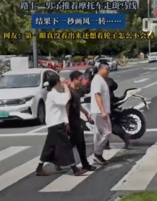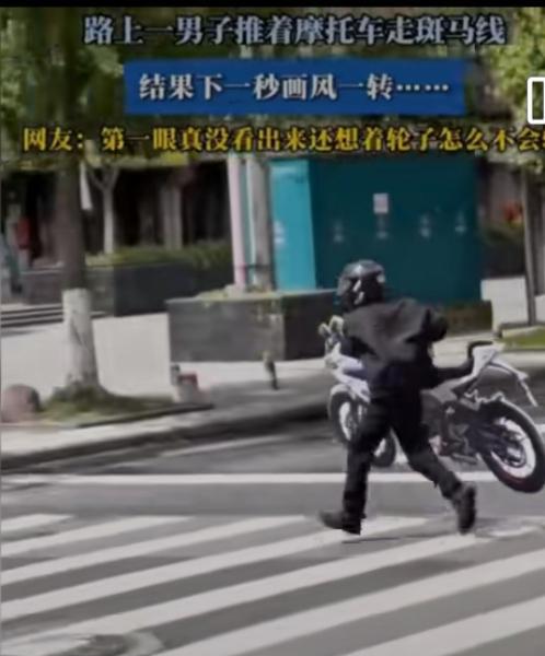 一男子推着摩托车过斑马线,没想到下一秒突然画风一转,男子扛起摩托车健步如飞直接跑