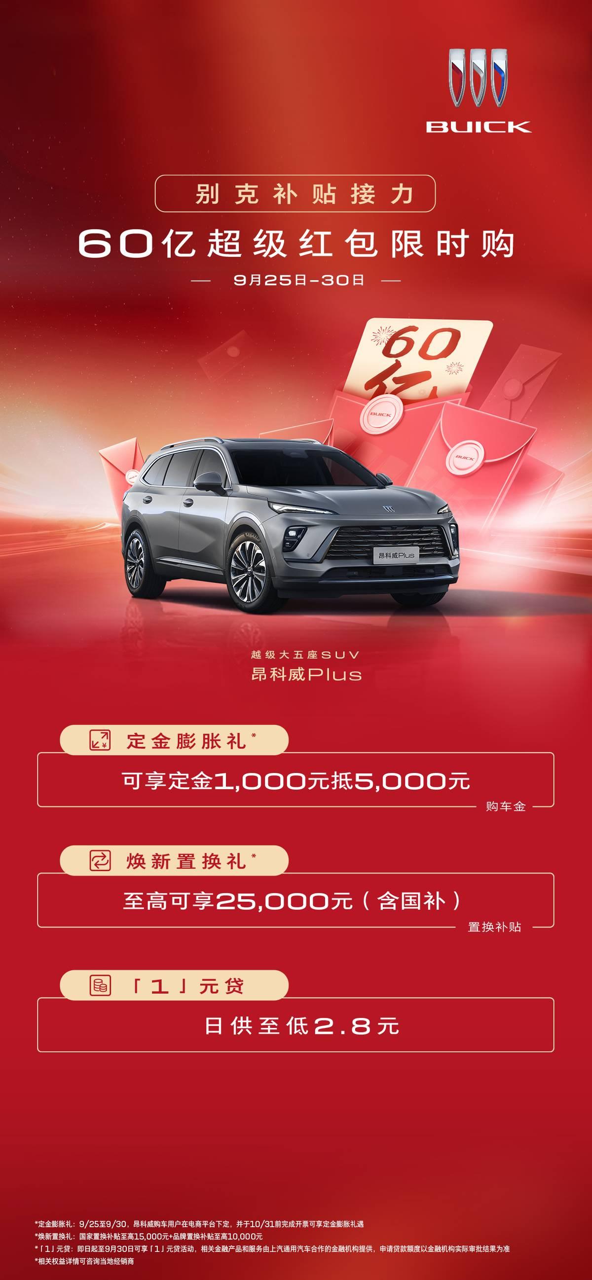 金秋时节,汽车市场也迎来了一场热闹非凡的购车盛宴。别克补贴接力,60亿红包限时购闪亮登场,以丰富多样的购车礼遇,正式拉开了金秋购车季的大幕。从即日起至9月30日,消费者购买别克旗下多款主力车型,都能享受到令人心动的超值优惠。购买昂科威Plus、昂科威S、君越(指定车型)及君威等车型,可享受1000元抵5000元购车金的优惠。在此基础上,消费者还可叠加享受“1元贷”金融方案和至高25000元的置换补贴。昂科威Plus作为别克的明星产品,一直备受关注。它以全方位“多10%”的产品力,在细分市场树立了标杆。26款全新车型全系搭载V5.0车机系统,真正实现了油电同智的品质提升,让驾驶者在享受燃油动力的同时,也能拥有智能科技带来的便捷。君越拥有越级的实力,“四大天王座椅”的加持,让它实现了“入门即豪华”的品质定位,为消费者带来了远超同级的豪华体验。别克品牌始终把用户需求放在首位,不断创新和升级产品力,为消费者提供更优质的出行解决方案。这次60亿红包活动,就是别克回馈用户信赖的诚意之举。如果有购车意向,不妨到当地经销商处或通过官方渠道了解一下活动详情,说不定能在这个金秋时节买到心仪的爱车。昂科威Plus 君越