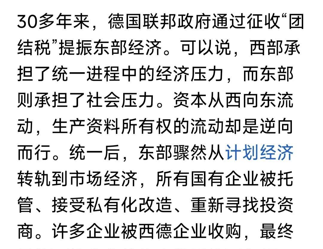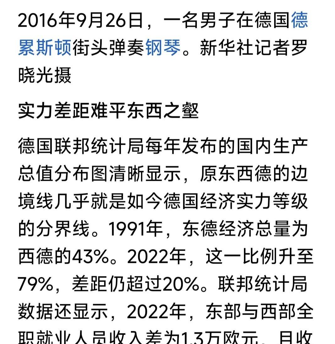 翻到新华社一篇文,谈德国统一30多年后,政治社会生活的撕裂!当初柏林墙推倒,东德人涌入西德的喜悦,已随时光流失,现在呈现人们眼前的,是东西德文化与生活的落差与裂痕。 苍狼读过全文,觉得很有道理!但不应以此而否定,东西德统一的必要性与积极意义。如果德国不统一,东德仍走二战后的道路,如今什么样子?是否古巴朝鲜这样的状况呢?大概率是吧? 最起码统一后,东德民众得到西德经济物质的援助,社会福利得到大幅提升,享受到与之前不相同的物质文化生活。这是不容置疑的事实。这个事实,柏林墙推倒时东德人的欢欣鼓舞便知。 当然之间存在差距,文化观念存在裂痕也是事实。这是之前不同政治制度意识形态,不同发展模式经济结构形成的鸿沟。就如发达地区与贫穷落后地区的差异,这种差异需要长时间来弥补! 好事多磨,历久弥新!任何事情都是这样,历史导致的思想文化,社会习俗,行为方式,生活追求,短期内不可能趋同。但久而久之,会融合一起的! …………