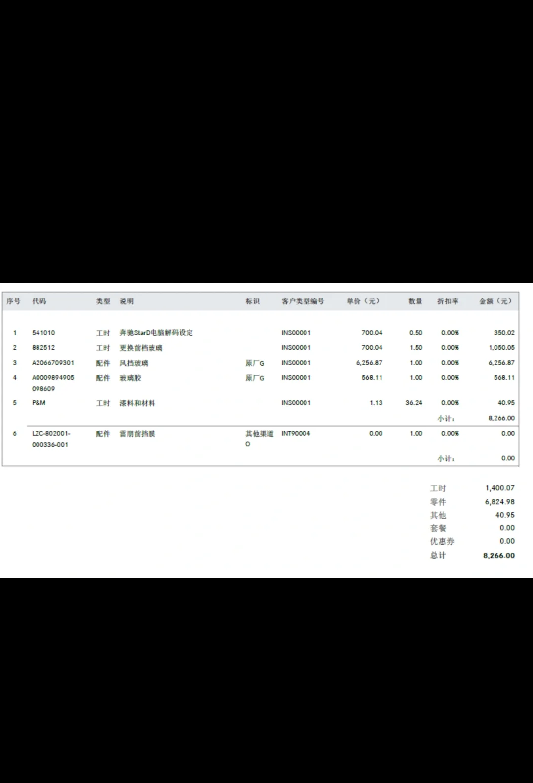 🔺下面看一下具体换前挡玻璃的项目收费,当然走保险的话这个钱不用你出,这里子昂就是把清单列出来给大家参考!