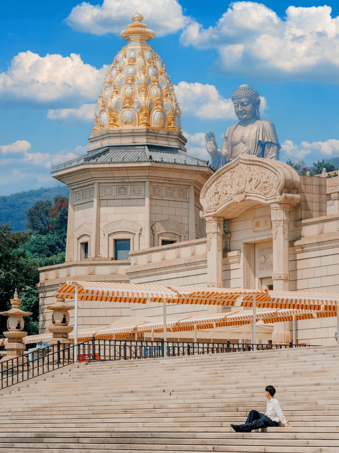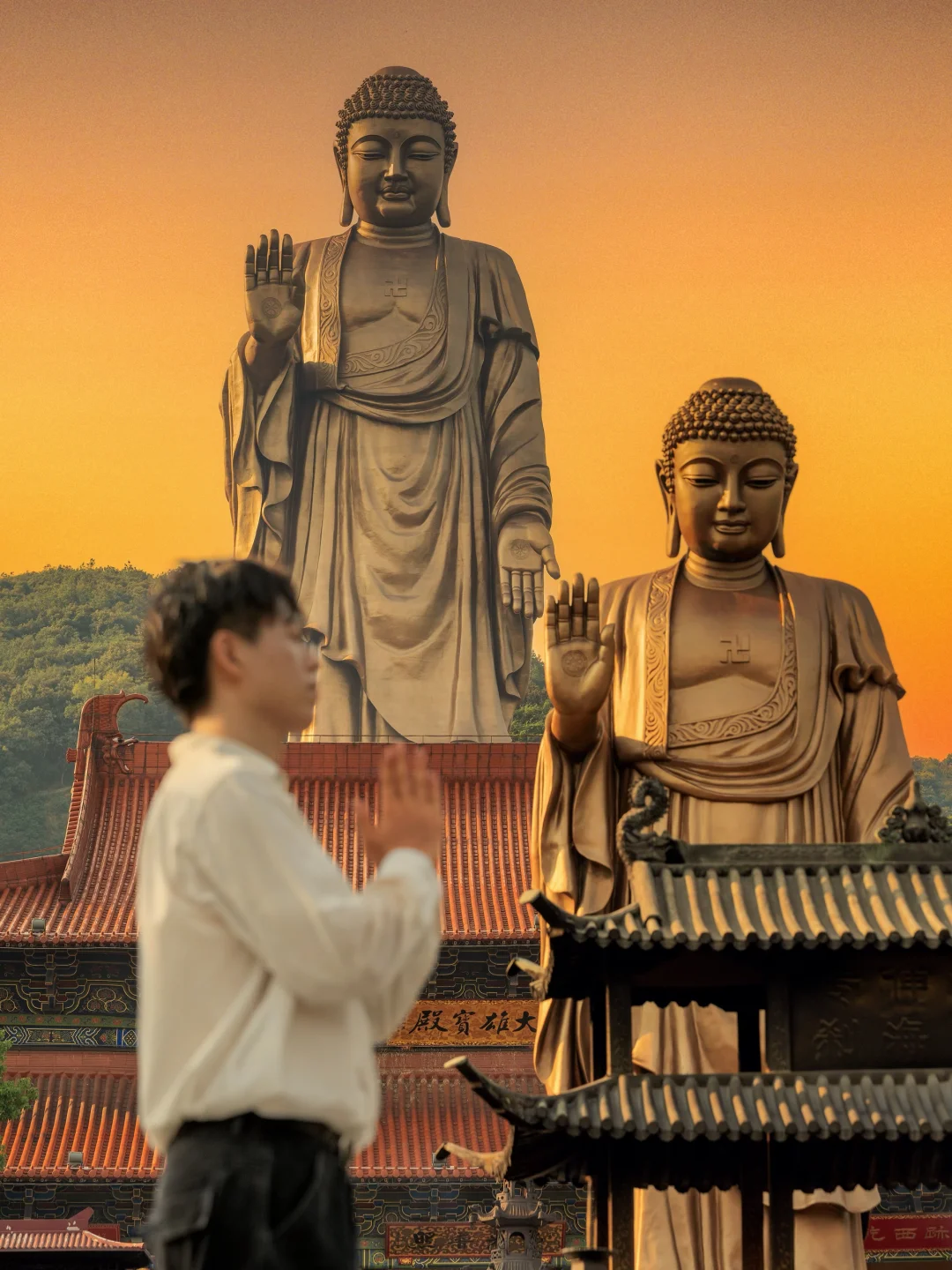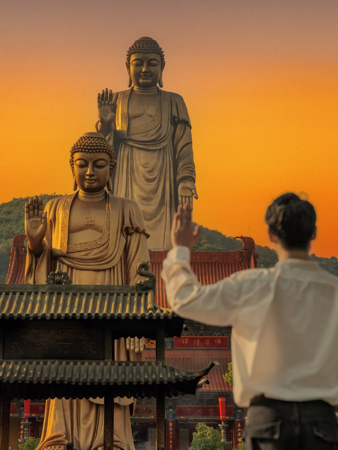 经典大佛同框视角!中轴线位置可以拍出禅寺内小佛与远处大佛完美重叠的画面,两旁的偏殿红墙也超出片