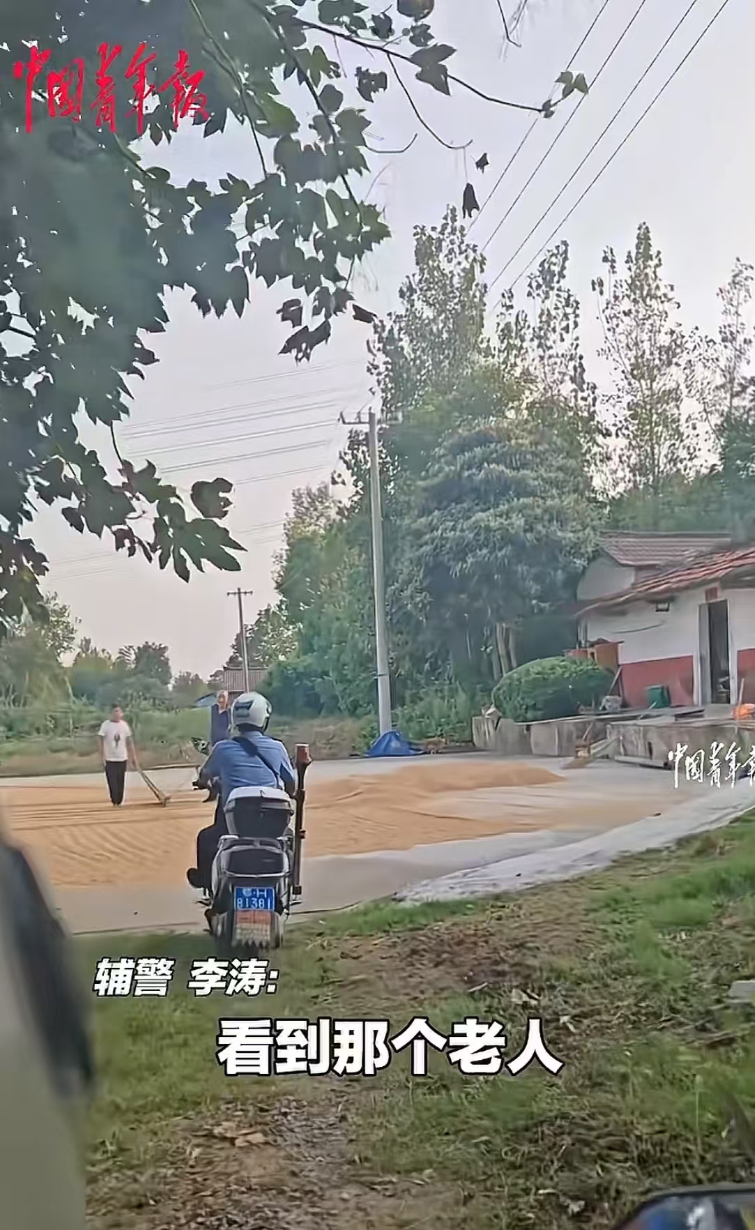 这天,辅警李涛和同事骑着车在村里巡逻。当他们路过一间农房时,看到两位老人正吃力地在院子里收着稻谷。