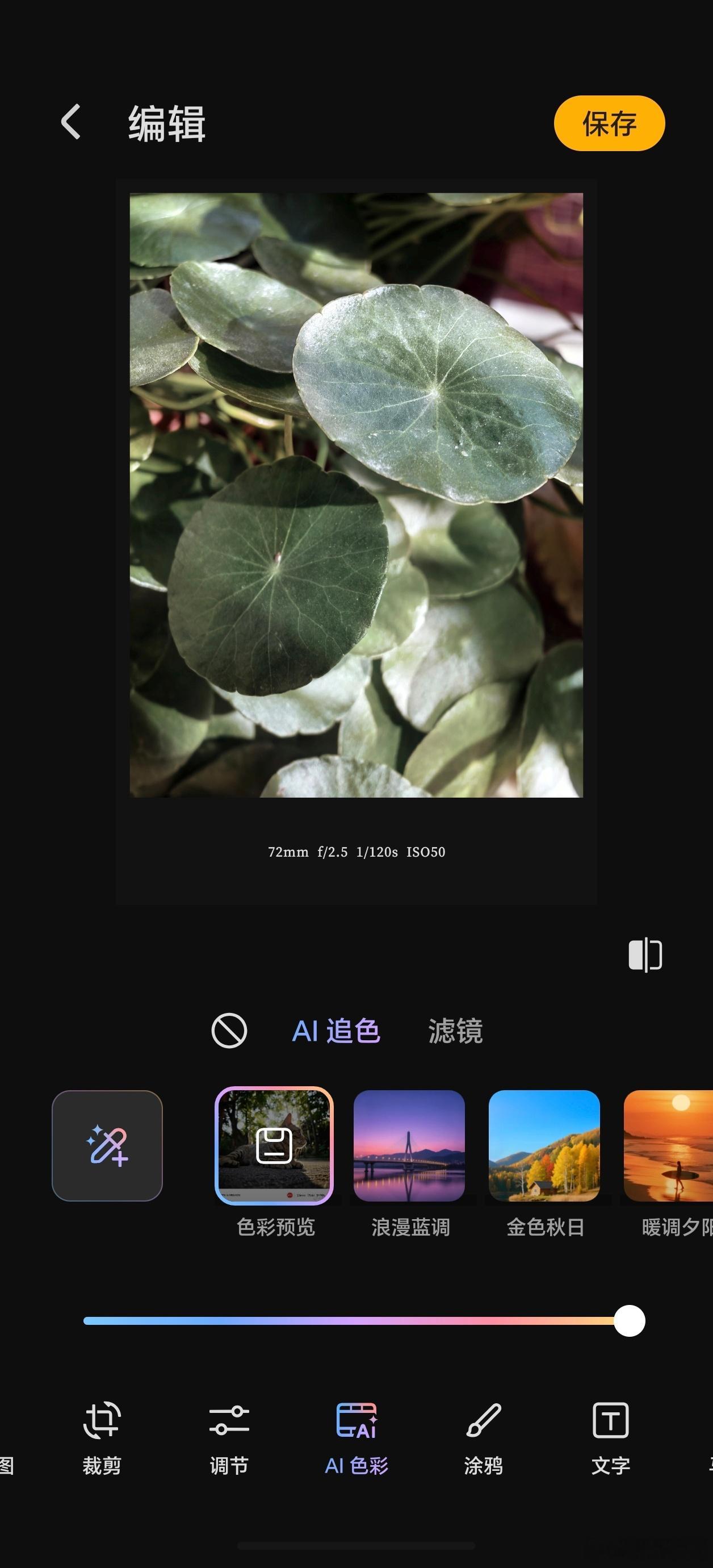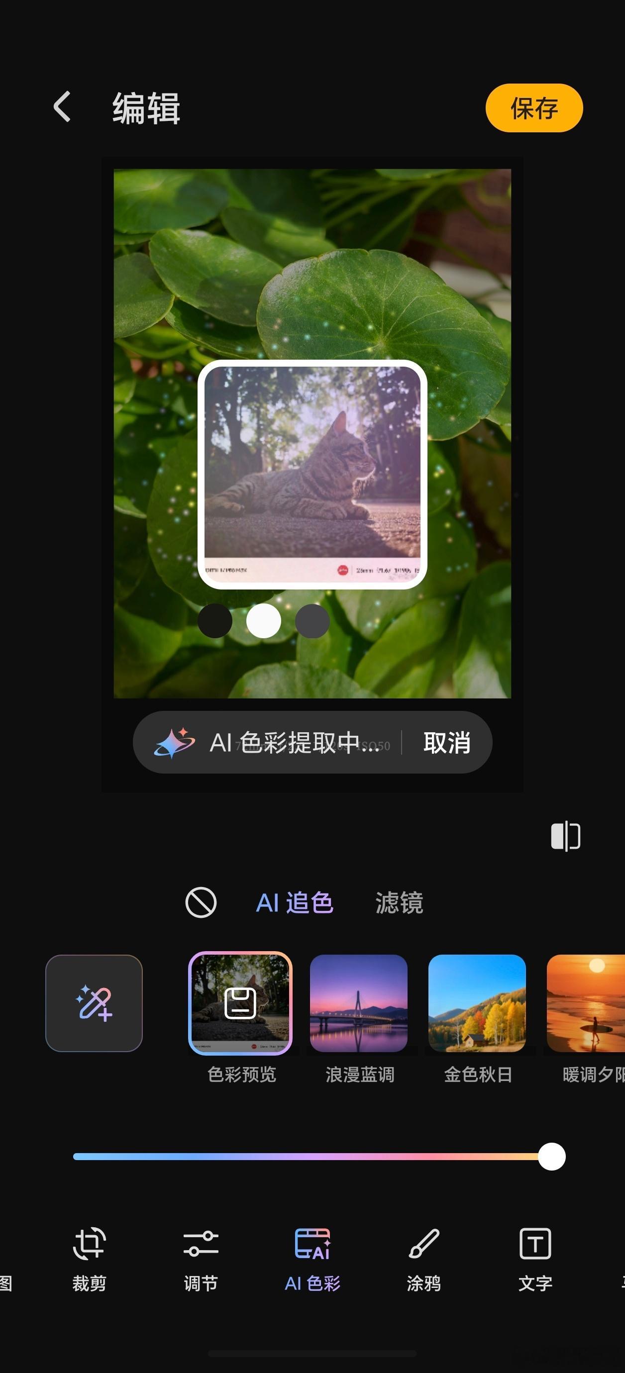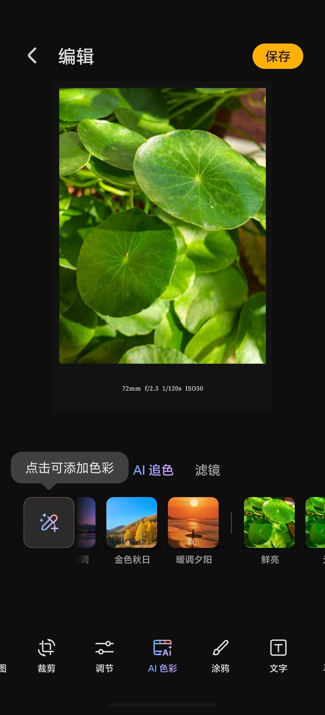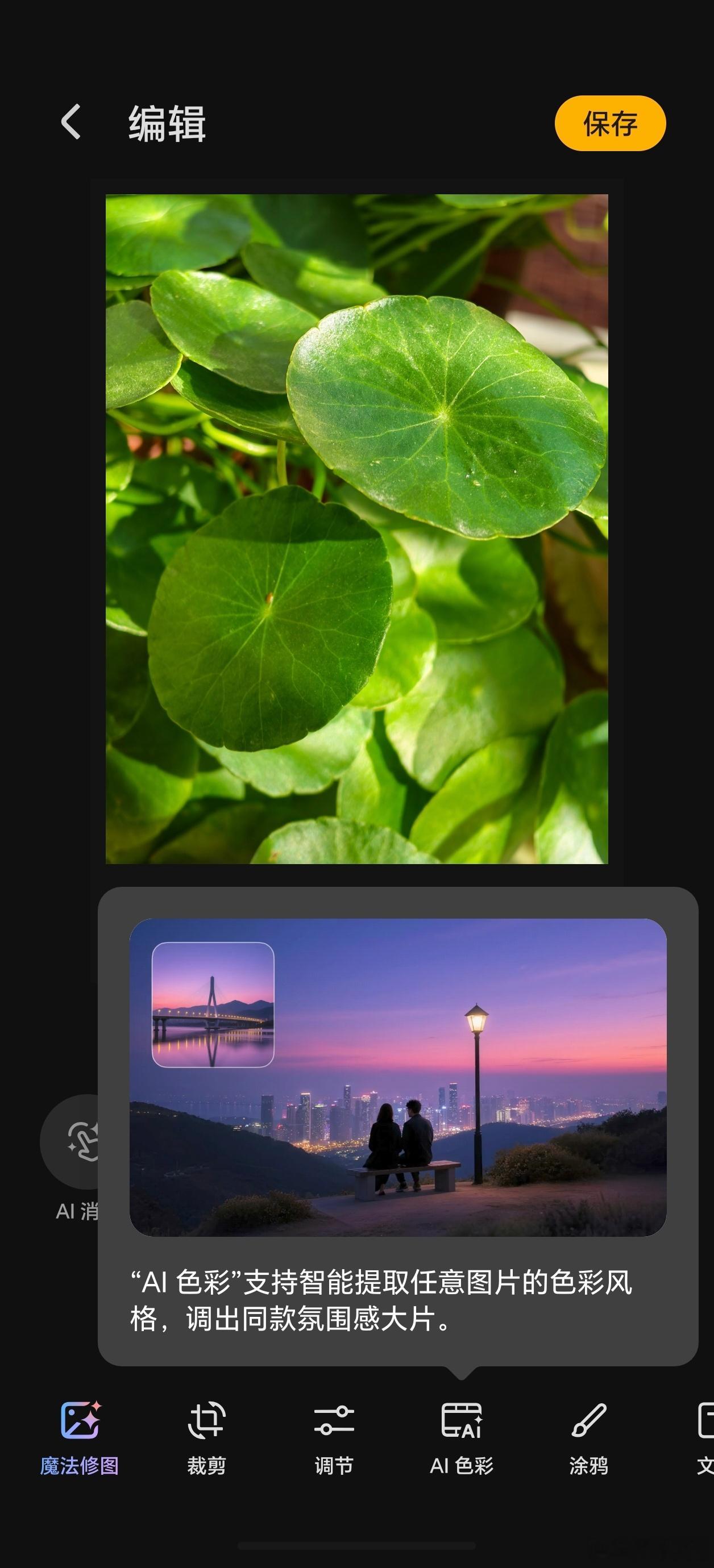荣耀MagicOS10.0系统新增AI追色功能,当你拍摄一张照片之后,你想要生成不同的影像风格,这时可选择AI追色,步骤很简单。