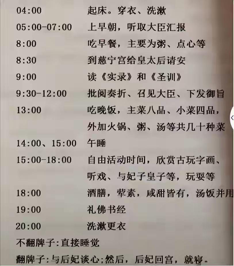 网上流传出一张关于清朝雍正皇帝的作息时间表,差不多他每天早上四点就要起床,五点就