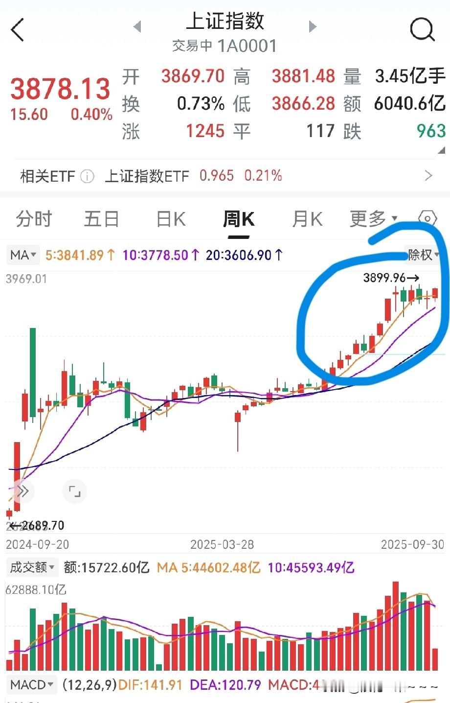 发现没,A股平台主力都给大家搭好了。 10月份大胆的放心的干就是了,一点问题没有,但是,要跟上主线和节奏,什么是主线的呢?其实也非常清楚。 第1条主线券商板块,这是护指冲破4000点乃至4500点的主力军,但是,对证券板块要有点耐心,时间看长一点。 第2条主线就是科技。由于之前的光通信加PPC长得太多了,目前的科技板块已经转移到了存储芯片,光刻机光刻胶,固态电池,以及储能方面。 第3条主线就是抗通胀板块。主要是黄金、有色金属、小金属概念。 最后,再让大家看一遍沪指的日线走势和周线走势,显然就是一个平台,各均线粘合到一起。已经基本调整完毕,向上走的概率非常大。 提醒一下,短线选股要选择有涨停板的,没有涨停板的你连看都不要看。