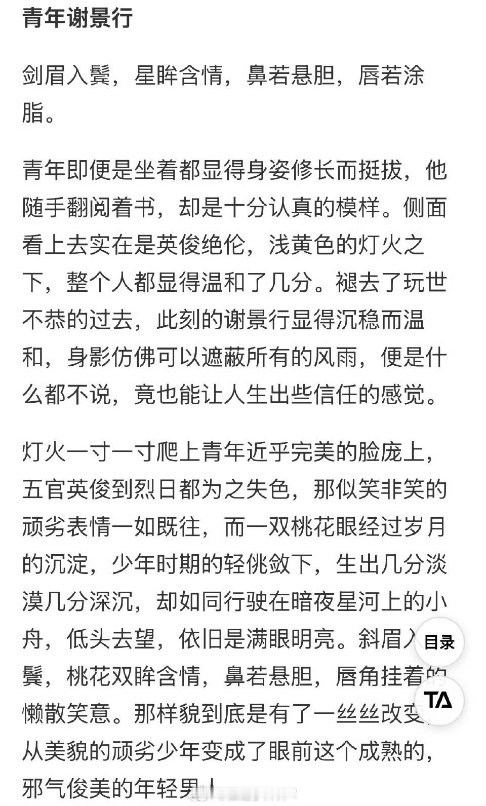 男主谢景行的颜值设定非常高,这谁能扛得住啊