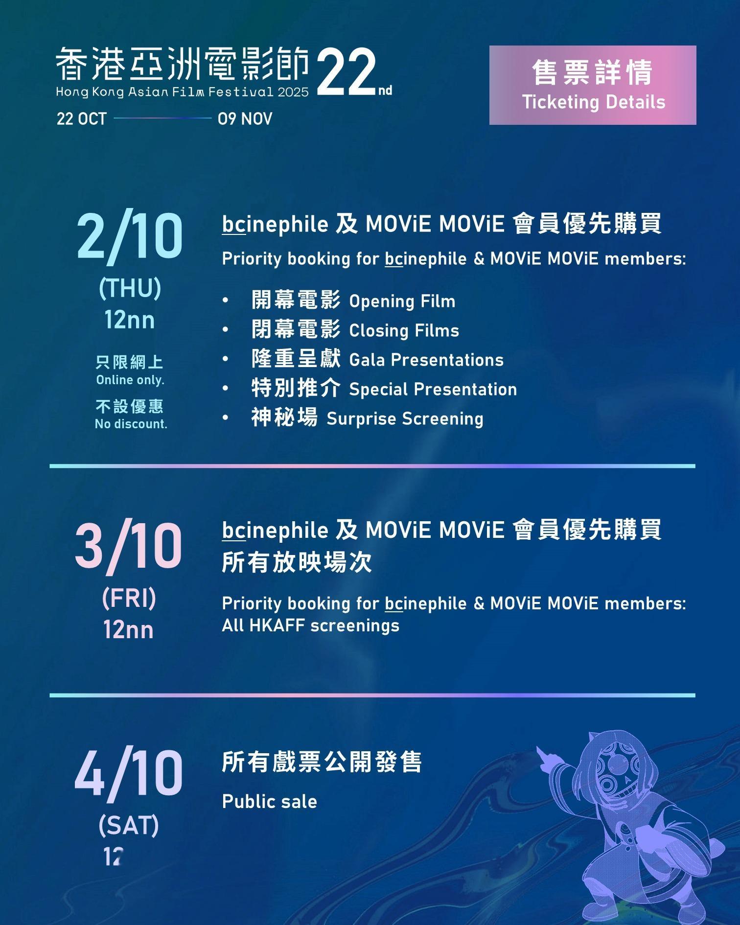 香港影讯 第22届香港亚洲电影节即将于10月22日开幕,有些影片已经在平遥电影节率先亮相,但日本今年的爆款《国宝》算是首次亮相了,10月2日12:00开启会员优先购票。