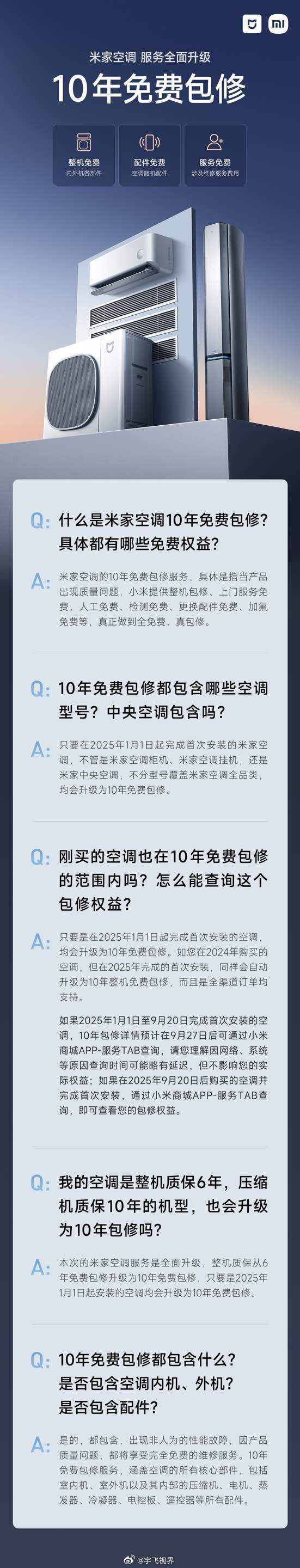 小米空调10年免费包修行业里早就有十年包修,但通常只保挂机。
