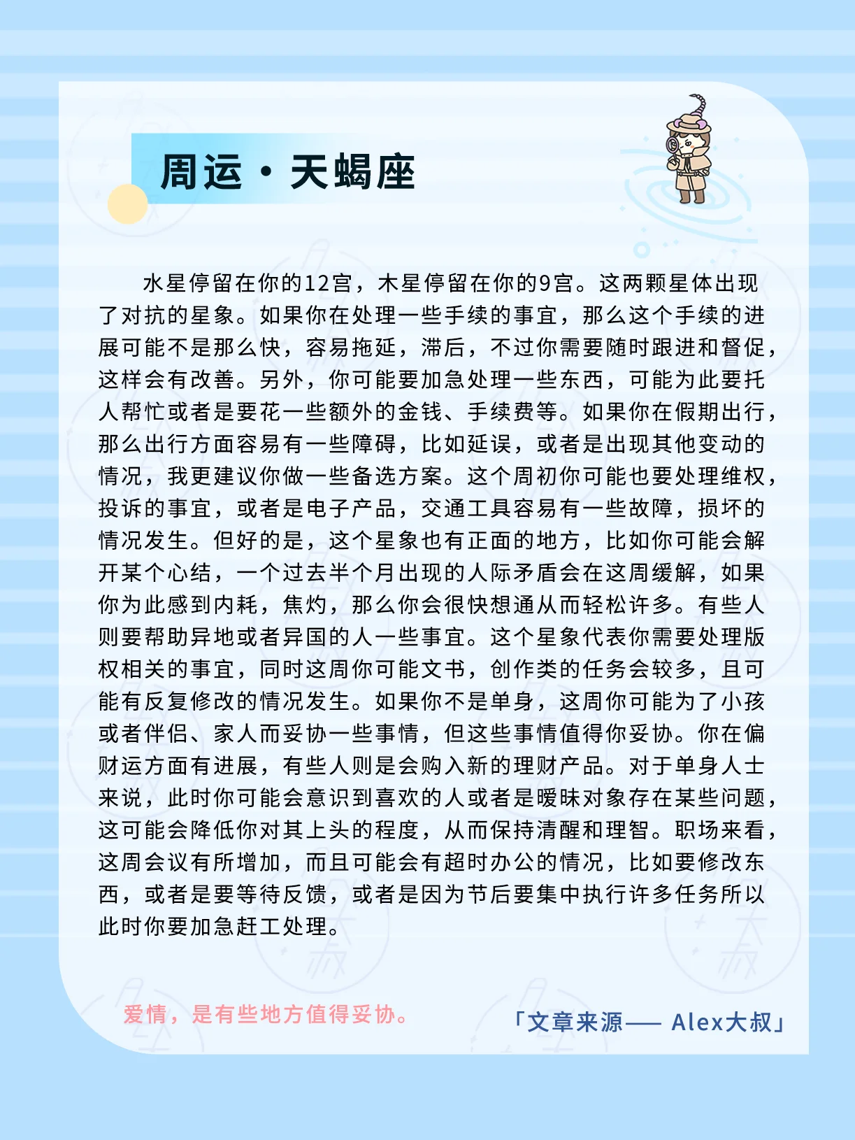 5、 这是一个容易给我们带来大局观的星象,也许我们为了保证一个大局的完整性,顺利,因此会选择自我牺牲掉一些东西——比如你可能会迁就人,或者是妥协,但是你也需要在保证大局的前提下,思考下你的感受——你的感受也很重要,以及这个“大局”真的有那么重要吗?