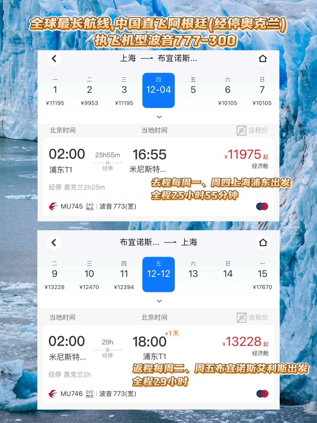 ✔️每周两班往返:去程周一、周四从上海出发,全程25小时55分;回程周二、周五从布宜诺斯艾利斯出发,全程29小时