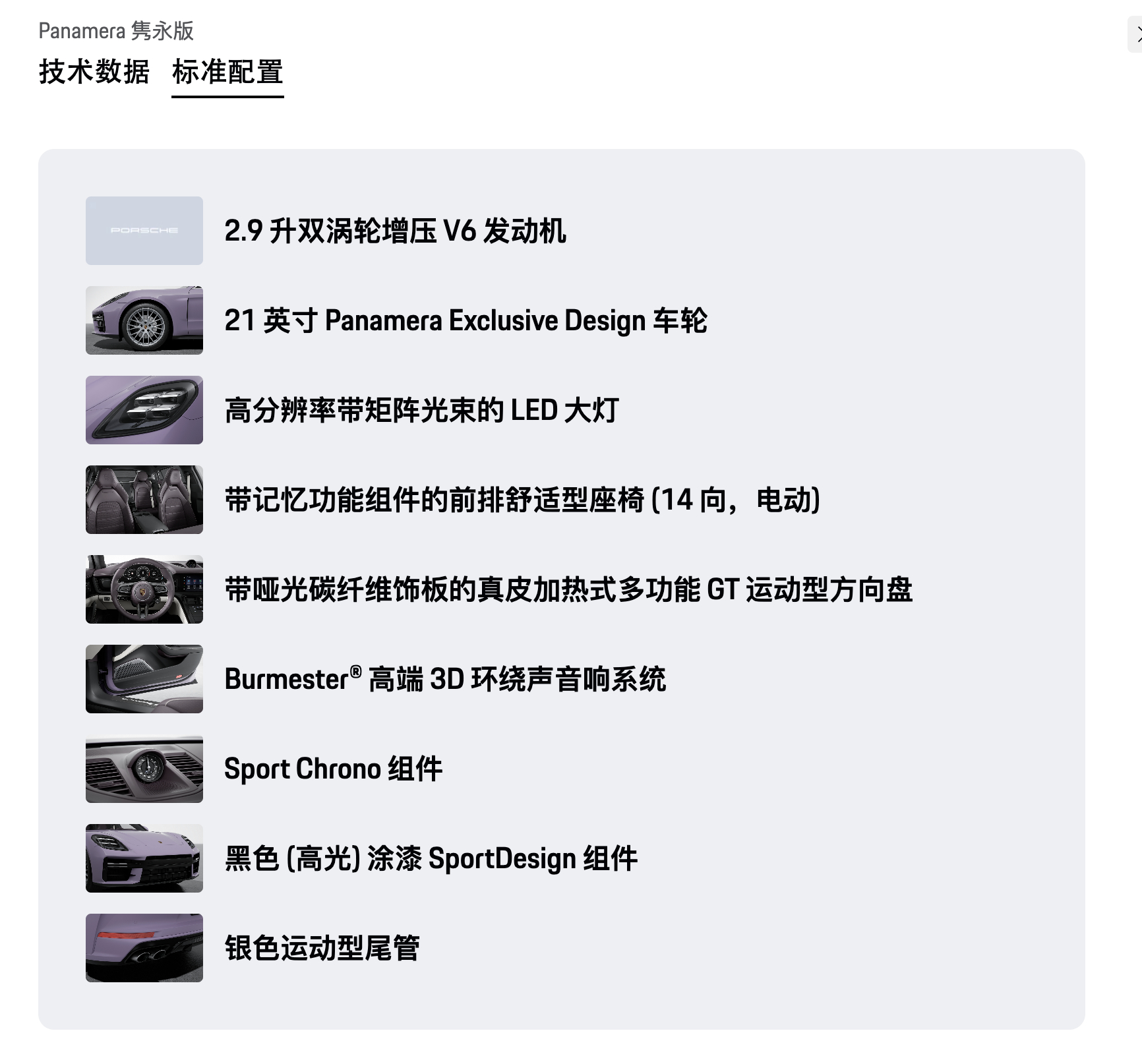 保时捷面对激烈市场竞争,交付下滑,做出的行动是推出:Panamera隽永版。基础版本是行政加长,2.9T双涡轮增压的燃油车,把以前一些昂贵的选配给标配了,比如: