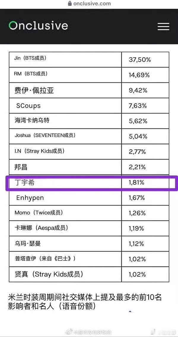 丁禹兮米兰时装周外网媒体影响力TOP9丁禹兮外网社交媒体影响力TOP9谁懂这个