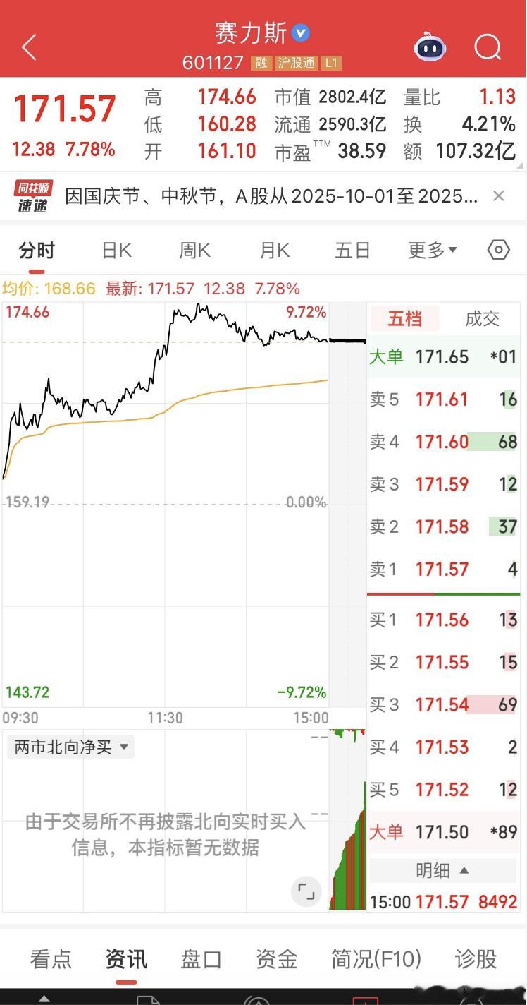 9月30日,赛力斯股价大涨,当日最高触及174.66元,收盘报171.57元,涨幅7.78%,总市值达到2802亿元,再创历史新高。
