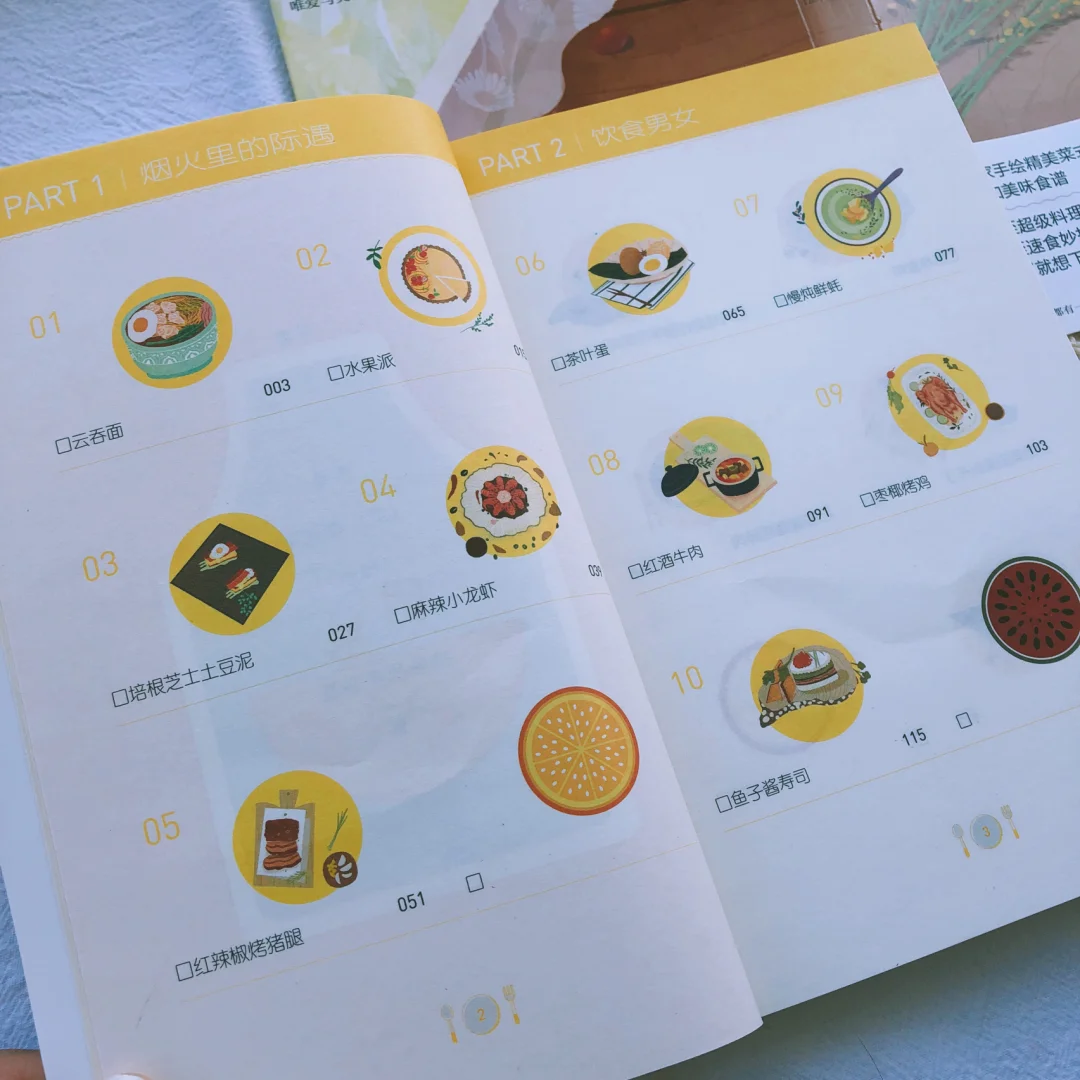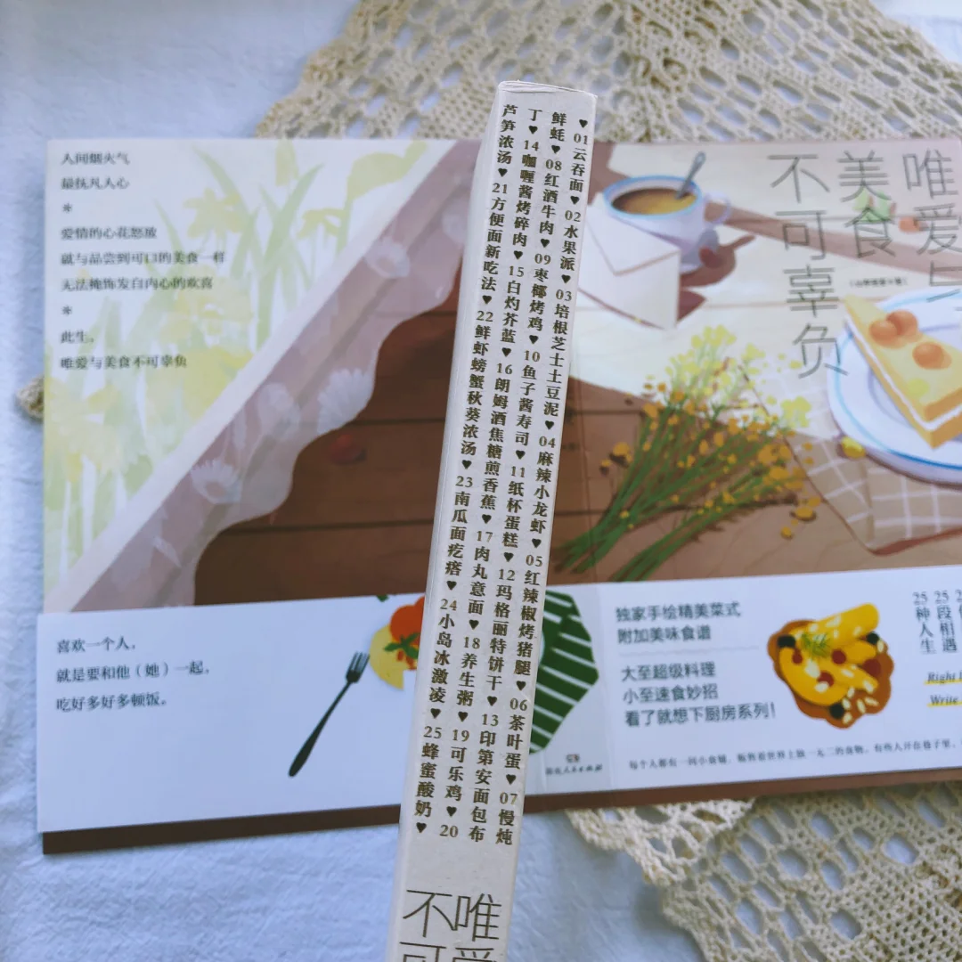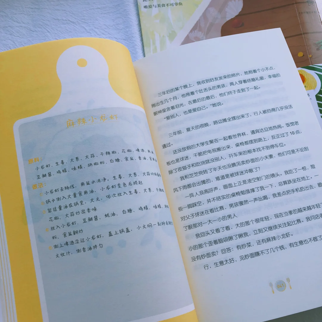 ▪️这本书一共25道菜,目录就是菜名,有云吞面、培根芝士土豆泥、麻辣小龙虾、茶叶蛋、纸杯蛋糕等等,除了做法,每一道菜背后还都有一个故事,有关欲望、有关挣扎感伤、有关孤独幸福,总之酸甜苦辣皆在此。