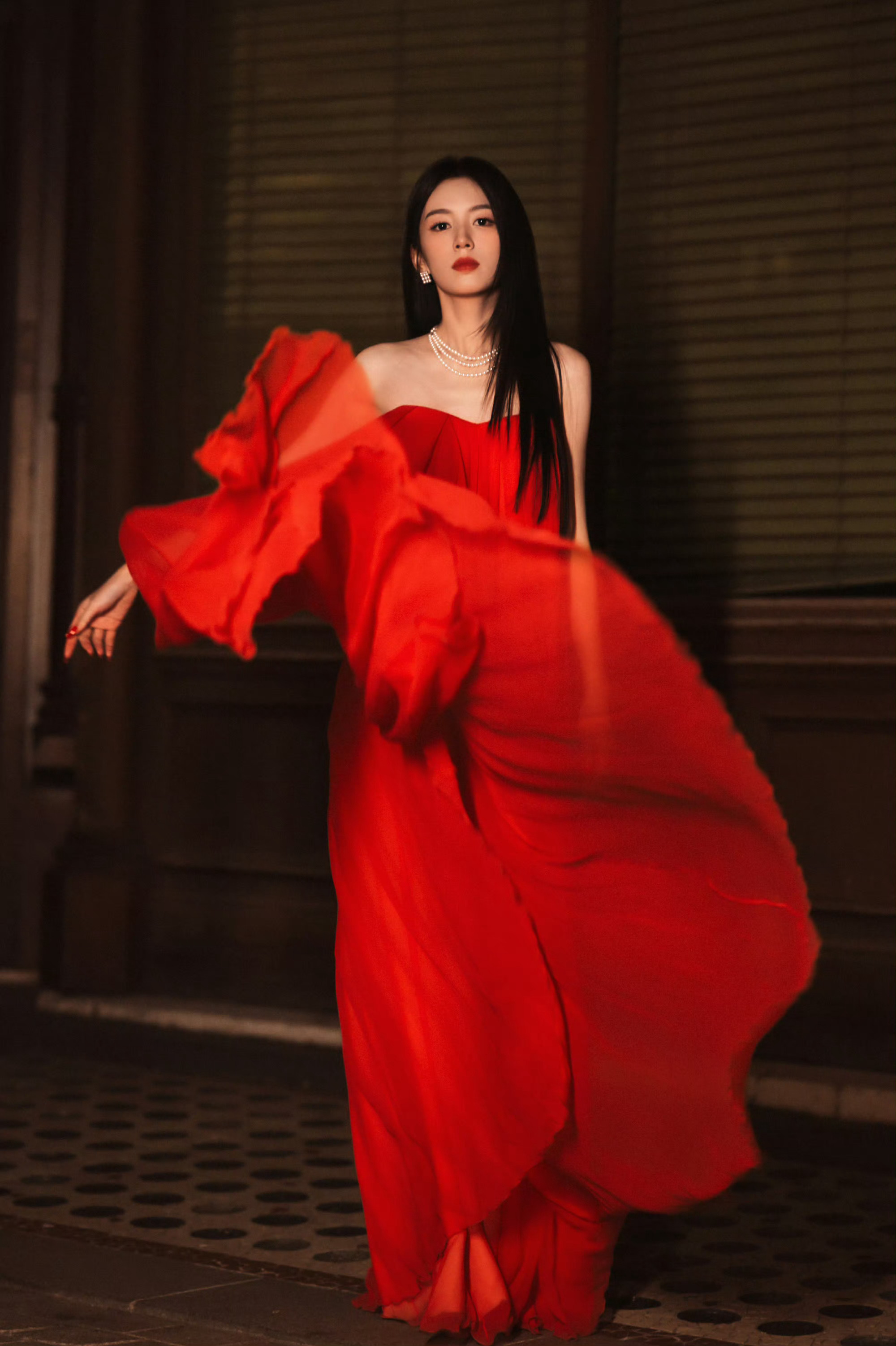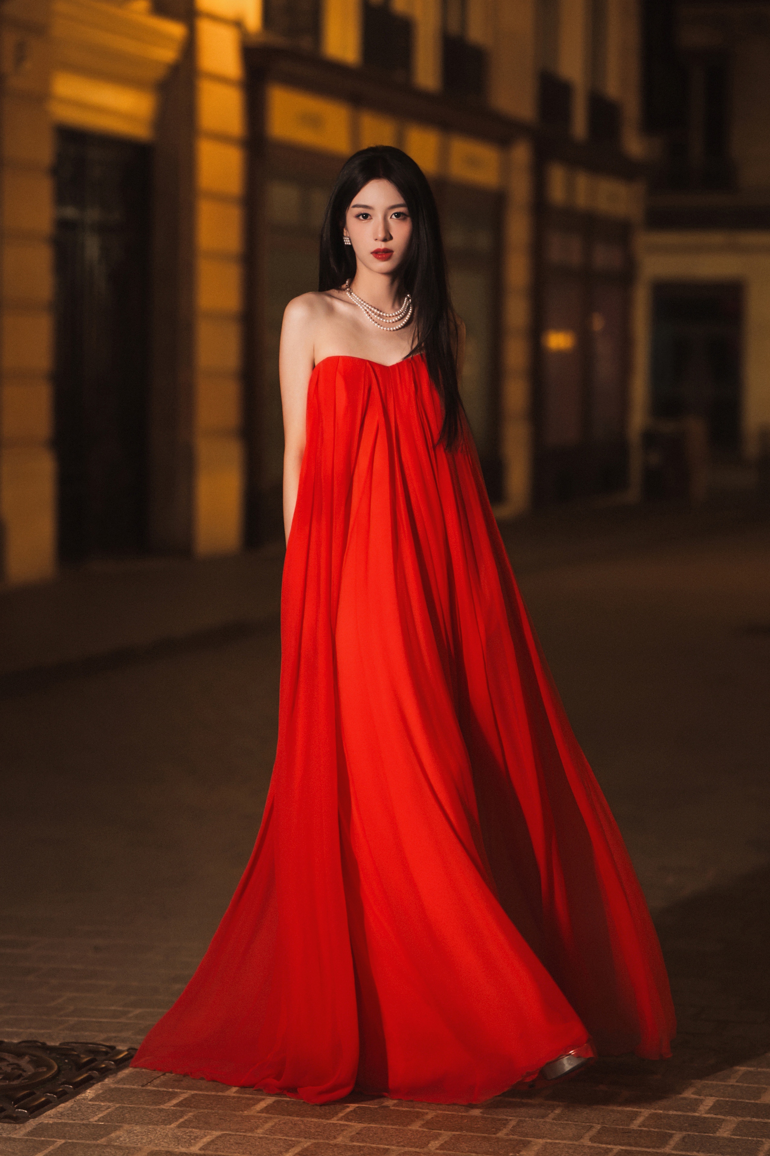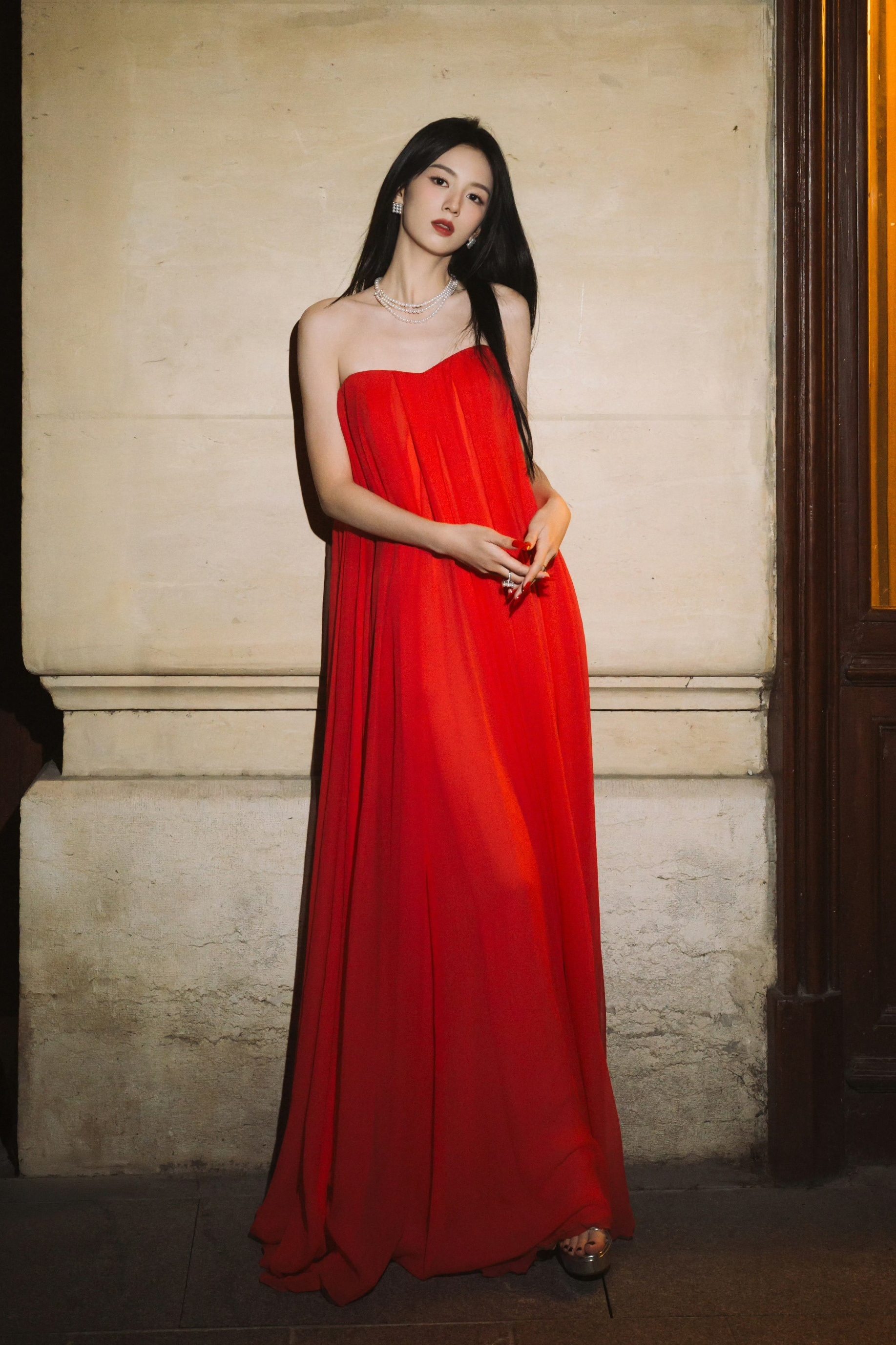 张予曦一袭立体花瓣长裙亮相巴黎时装周