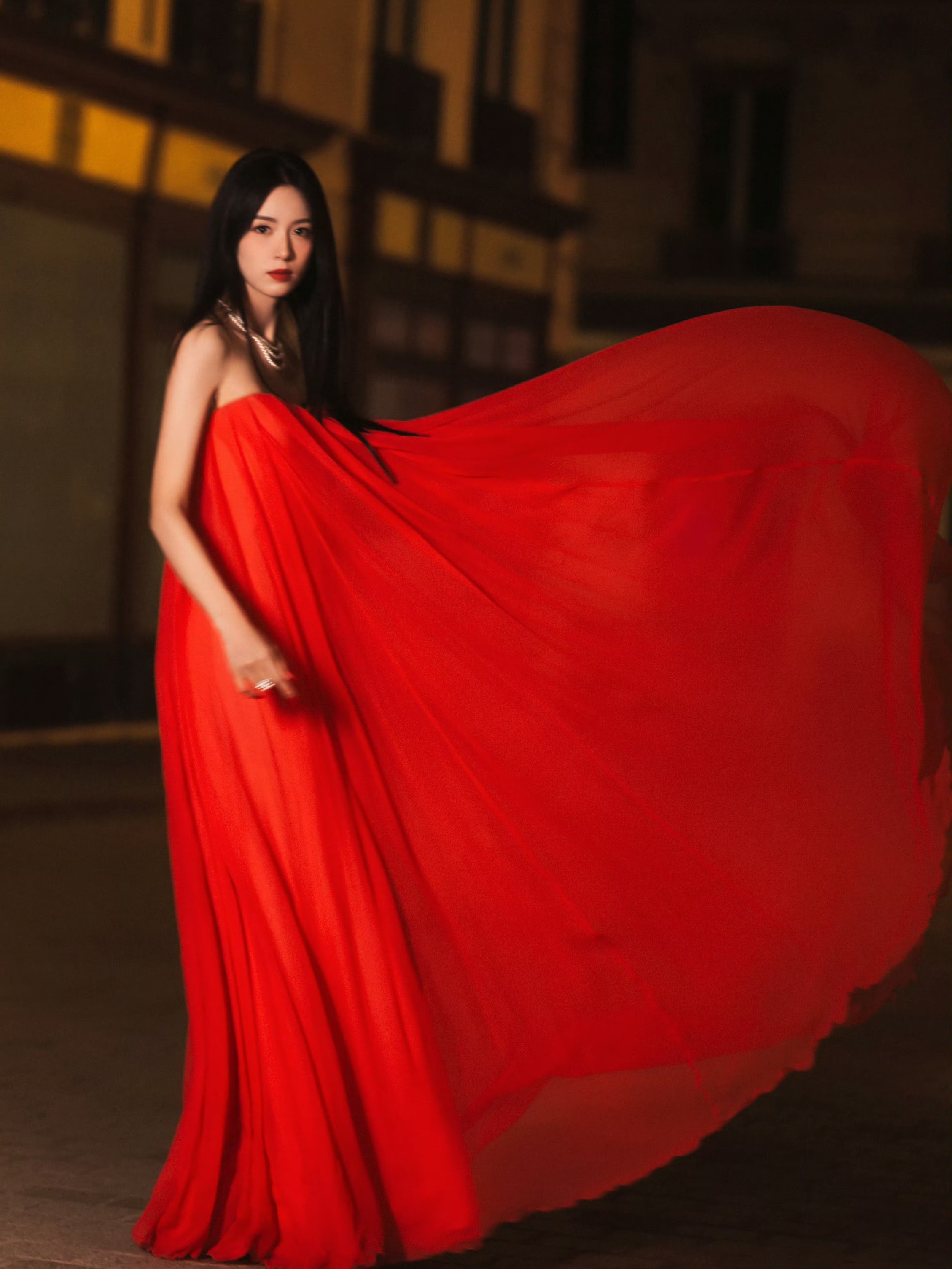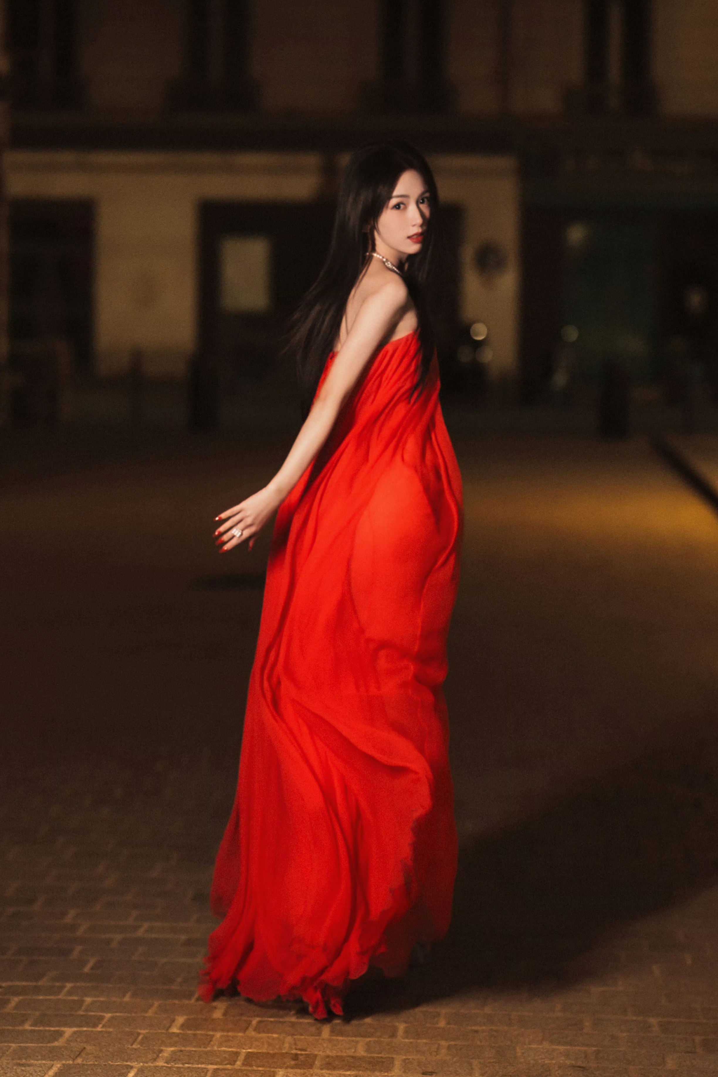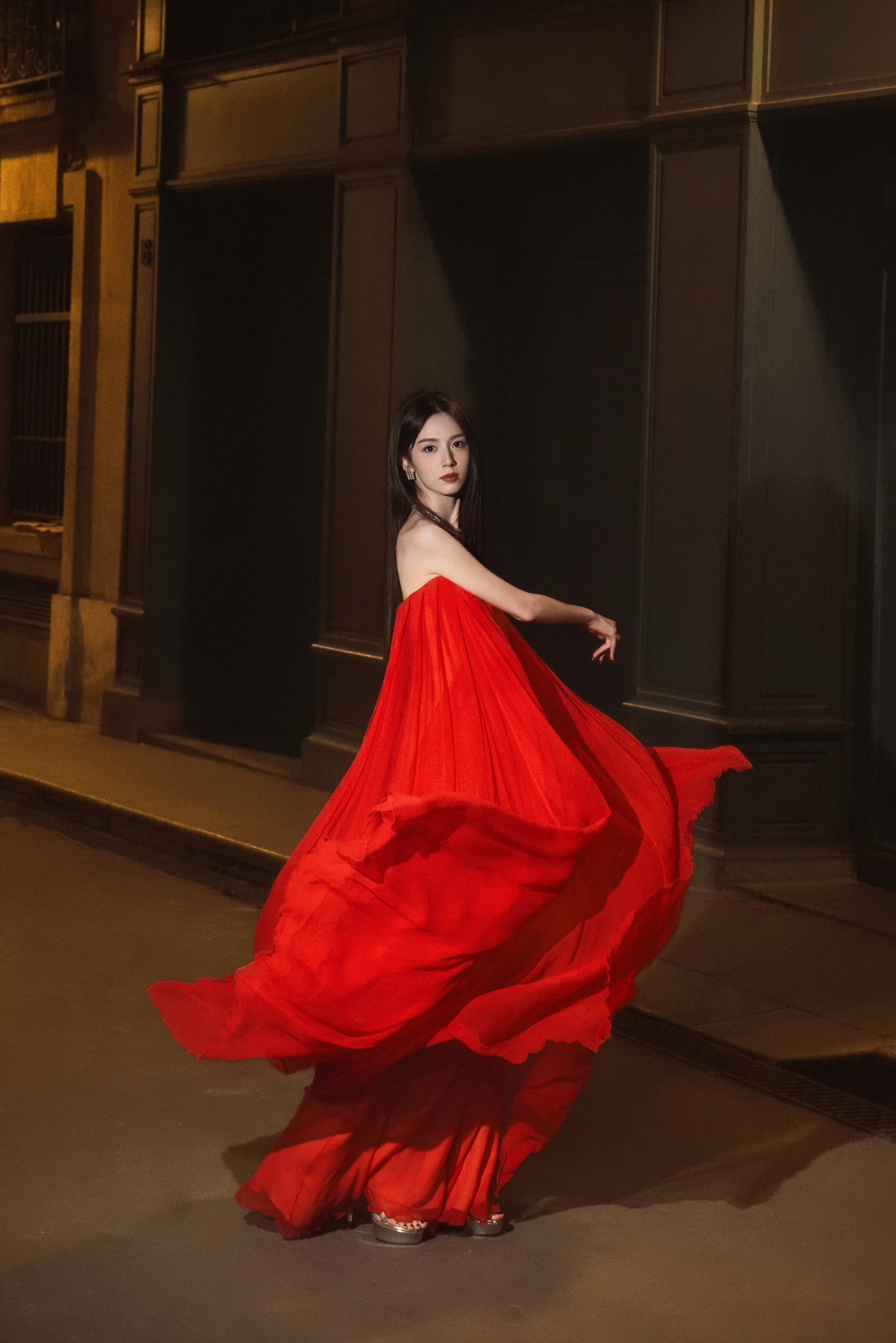 张予曦一袭立体花瓣长裙亮相巴黎时装周