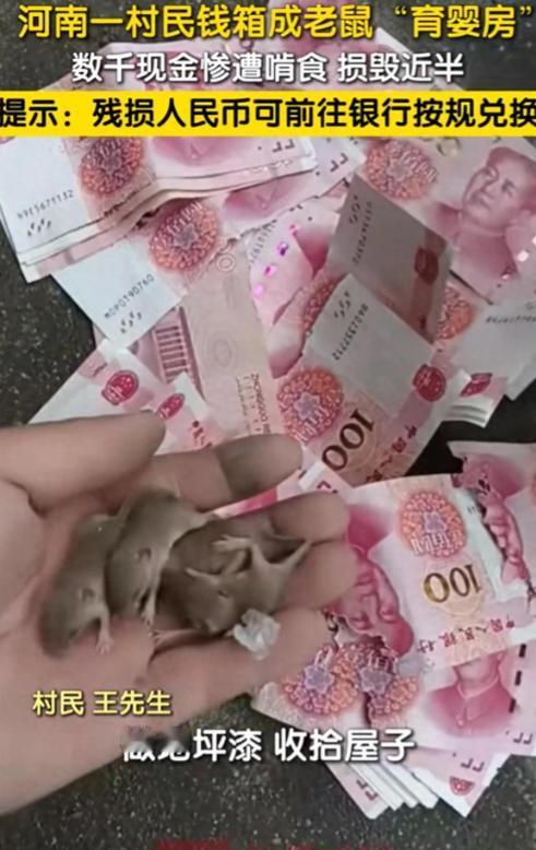 担心的事还是发生了!9月28日,河南驻马店,一男子在家中干活时,意外找到了一个装钱的箱子,结果听到里面有老鼠的叫声,打开箱子后发现有一窝鼠崽,5000多元现金被老鼠咬毁了一半,不知道还能不能兑换。网友:老鼠真是太可恶了! 刷到一条有点无奈的消息,河南驻马店泌阳县郭庄村的王先生,最近在帮姑姑家做地坪漆时,遇上了件糟心事儿。 从空心砖里翻出的藏钱箱,居然成了老鼠的 “育婴房”,箱里 5000 多块现金被啃得面目全非。 这事要从 9 月 28 日下午说起。 当时王先生正在收拾屋子,挪开墙角物件时,发现一块空心砖的孔洞里塞着个硬纸盒。 他以为是姑姑不用的旧东西,掏出来才发现里面有现金,可还没等高兴,就听见盒里传来 “吱吱” 的细微声响。 犹豫了一会儿,他还是撬开盒盖,结果看到几只没睁眼的小老鼠缩在现金上,而那些百元大钞,一半都被咬得破破烂烂,有的缺角、有的断成两半,还有些碎得拼不起来。 王先生没忍心对小老鼠下手,最后把它们放生到院子外的草丛里。 但看着地上的残币,他犯了愁:这钱是姑姑省吃俭用攒的,藏在空心砖里估计时间久了,连姑姑自己都快忘了位置,现在变成这样,还能不能用? 他只好拍了段视频发上网求助,想问问网友银行给不给兑换。 对此,有网友表示,这老鼠也太会找地方了,把钱箱当育婴房,心疼大爷大妈攒的辛苦钱! 现在年轻人都用手机支付,很少遇到这种事,但老一辈习惯藏现金,可得多提醒他们找安全地方放。 也有网友调侃:第一次见‘开银行’的老鼠,啃钱还挑百元大钞!不过王先生放生小老鼠挺善良,换我可能气到没这耐心,但还是得想办法去银行兑换,别让损失变大。 还有网友分享经验:我家老人之前也把钱藏衣柜,结果受潮发霉,最后只兑了一半!建议大家多劝家里长辈把钱存银行,又安全还能赚点利息,总比被老鼠、虫子祸害强。 其实不止王先生,之前也有不少人遇到过类似情况。 去年 11 月,湖北武汉的李大爷把 8000 块现金藏在衣柜夹层,觉得放在衣服中间安全,结果大半年后拿钱时,发现现金又潮又霉,还被虫子咬出洞,最后到银行只兑换回 4200 块。 今年 3 月,山东济宁的张女士搬家,从旧木箱里翻出母亲藏的 3000 块,也被老鼠咬得稀碎,缺失超一半的现金没法兑换,最后只保住 1200 块。 为啥老鼠总爱咬现金? 懂行的人说,老鼠是啮齿类动物,牙齿每天都在长,必须靠啃东西磨牙才能正常吃东西。 而大家藏现金的地方,像旧箱子、空心砖、衣柜夹层,大多阴暗隐蔽,刚好适合老鼠做窝,现金质地软,自然成了它们磨牙的目标。 而且老一辈人习惯在家藏现金,觉得 “看得见才放心”,不像年轻人常用手机支付,很少在家放现金,可藏钱的地方往往不通风、易受潮,时间一长,钱要么被老鼠咬,要么发霉生虫。 王先生发的求助视频引了不少关注,有网友说能去银行兑换。 他本来想第二天就去,可姑姑家的地坪漆活没干完,一直没腾出时间。 不过有记者联系了中国人民银行河南省分行,工作人员明确说,这种被老鼠咬坏的现金属于特殊残损币,可以兑换,但具体能换多少,得看损毁程度。 要是缺失超二分之一,或者防伪标记看不清,就换不了了。 而且去兑换不用开证明,也不收费,只要带身份证和残币就行,不过县级市没有人民银行网点,得去市区的指定网点,还能在官网查附近的兑换点。 现在王先生还没去银行,不知道最后能换回多少。 但这事也提醒大家,家里藏现金真得留意。 要是觉得电子支付不放心,把钱存银行最稳妥,不仅安全,还能有利息。 就算想在家放少量现金,也可以找个密封的金属盒子,放在高处或老鼠够不着的地方,每月检查一下有没有受潮、破损,不要再出现这样的事情了。 那么到最后,你们是怎么看的呢? 如果各位看官老爷们已经选择阅读了此文,麻烦您点一下关注,既方便您进行讨论和分享,又能给带来不一样的参与感,感谢各位看官老爷们的支持!